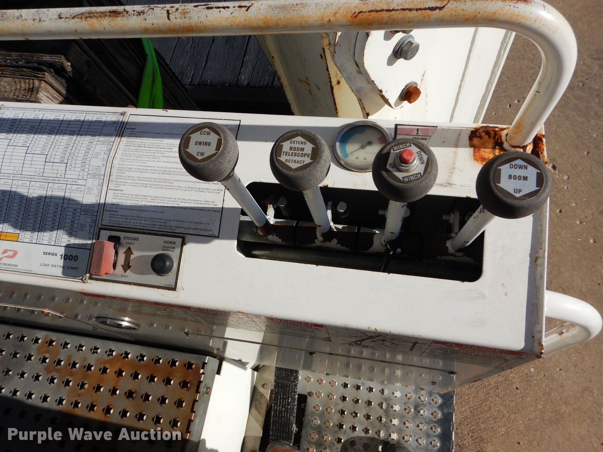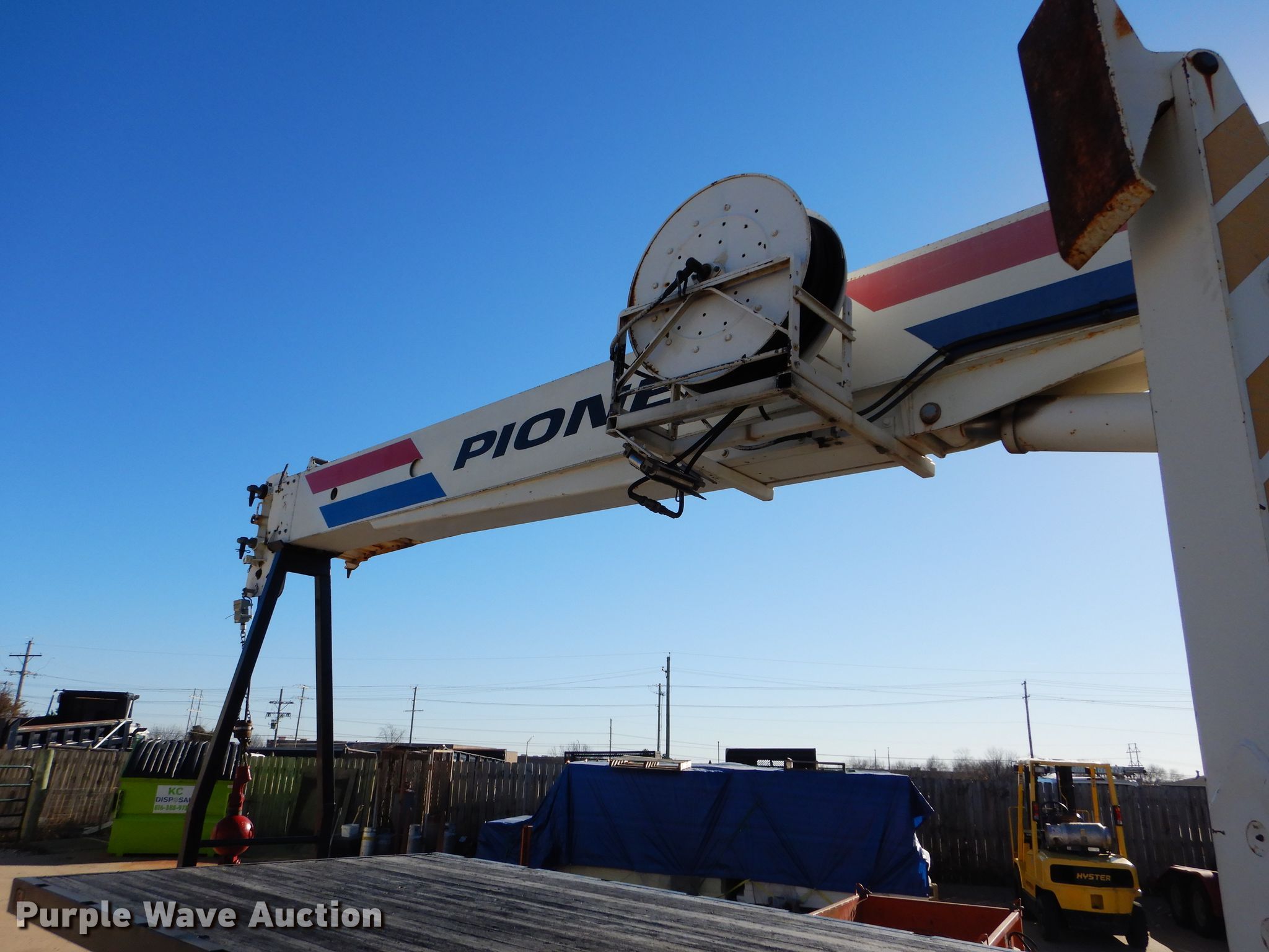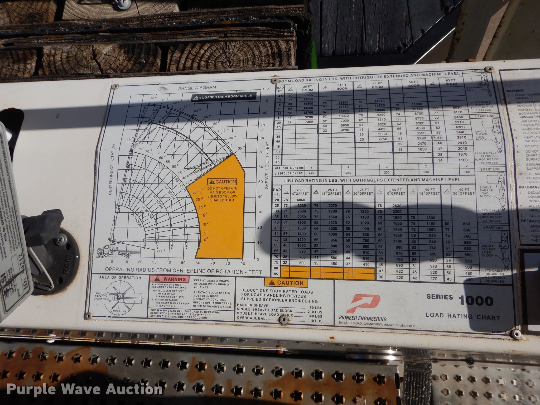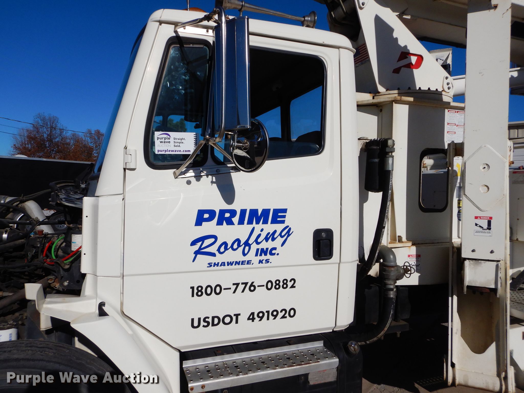 1998 Freightliner FL70 crane truck. Miles: 33,698 on odometer, Hours: 3,247 on meter, VIN: 1FV6HFBA7WH894735. Engine Cummins ISB, Displacement: 5.9L, Cylinders: 6, Fuel type: Diesel. Transmission Spicer, Manual, Speed: 7. Chassis Axles: Single, Suspension: Spring, Brakes: Air, PTO, GVWR: 33,000 lbs FAWR: 12,000 lbs, RAWR: 21,000 lbs. Interior AC, Heat. Operational Flatbed Knapheide, 16' L x 8' W, Crane Pioneer 1000 Serial: 131069701486, Boom Telescopic, Boom length: 63', Sections: 3, Maximum lift capacity: 30,000 lbs, Jib: 50', Boom controls, Crane ball & hook, Lift chart. Tires Size: 11R22.5. Kansas title. Prime Roofing Inc. 8235 Cole Pkwy. Lenexa, KS 66227