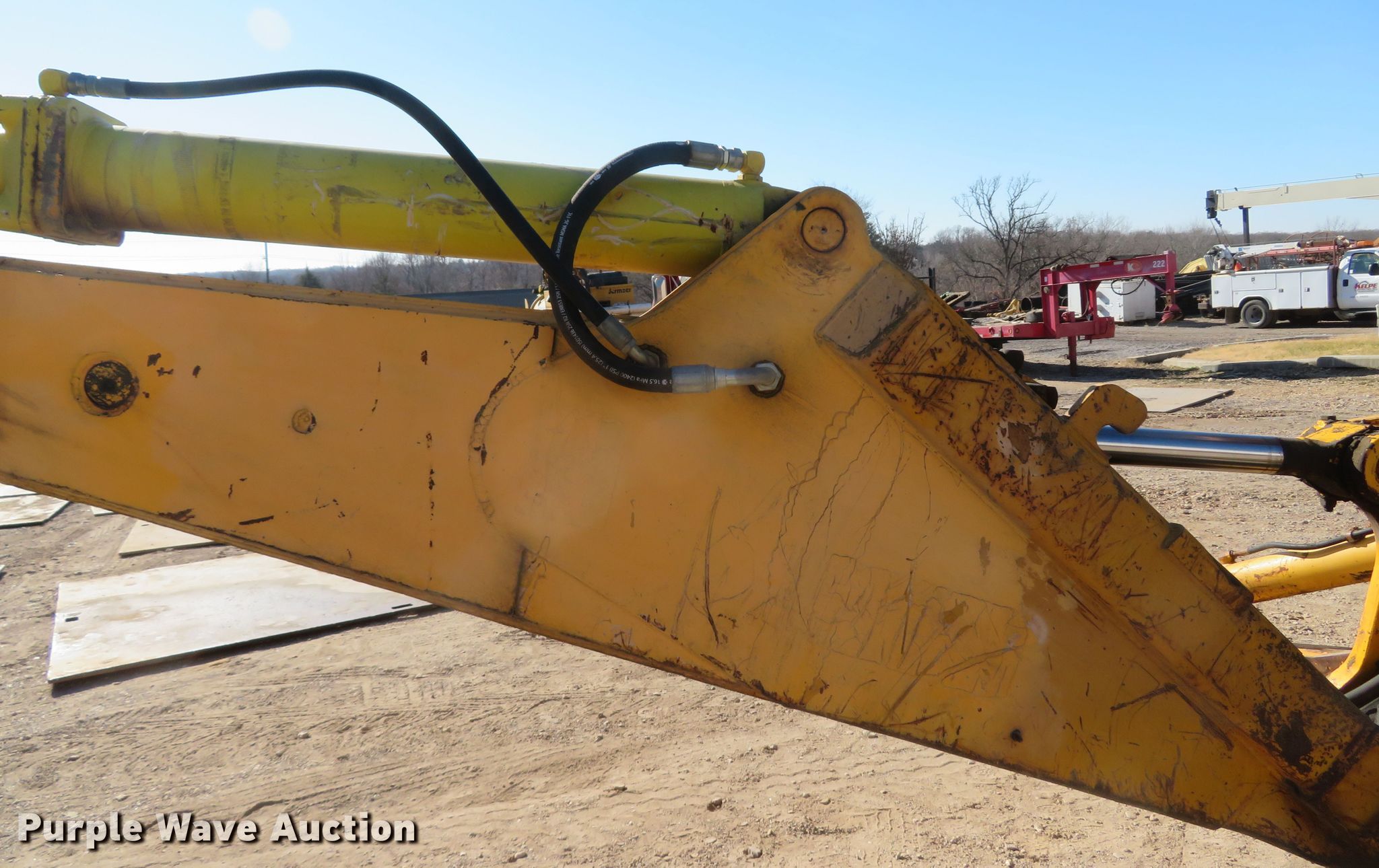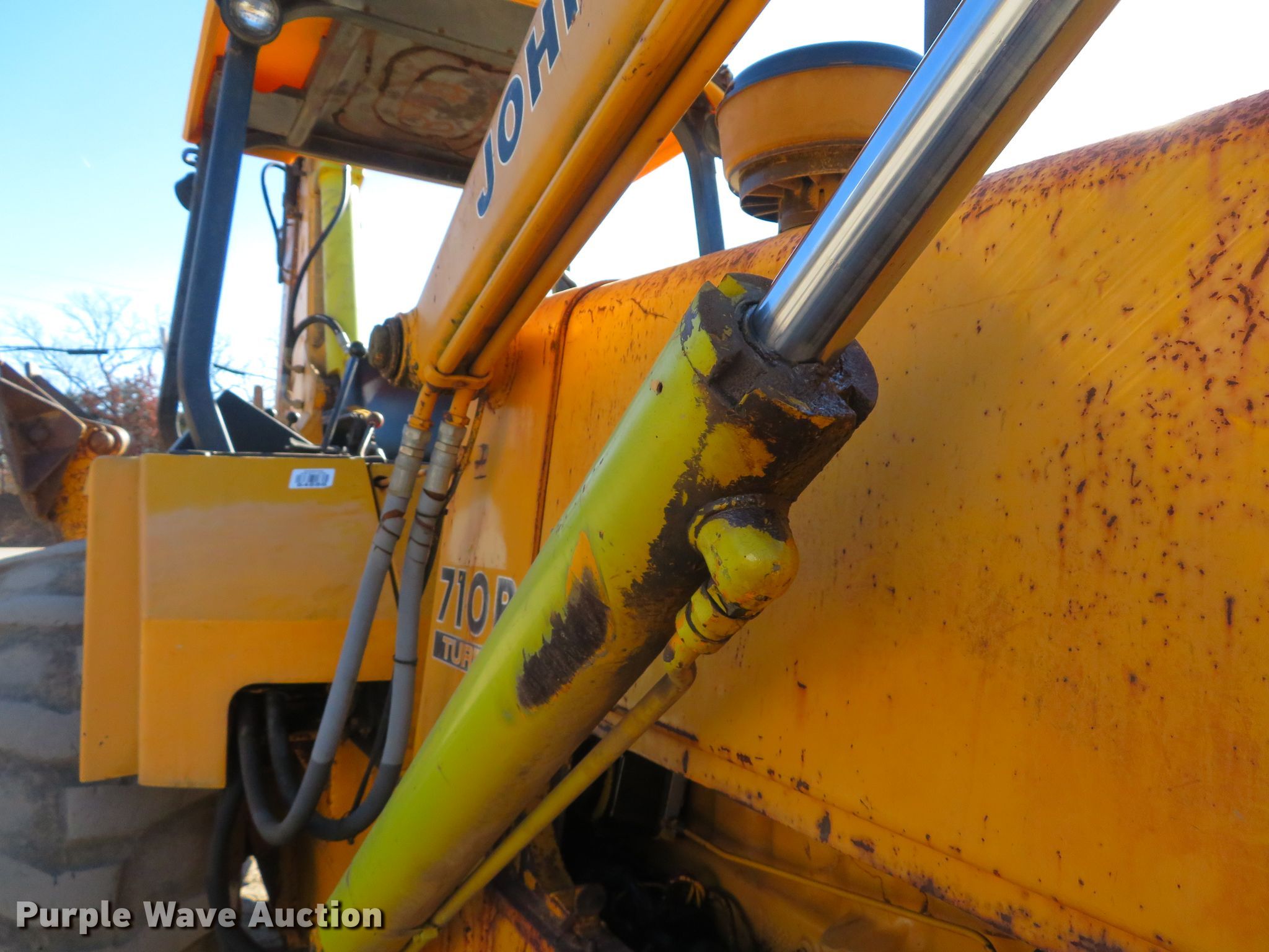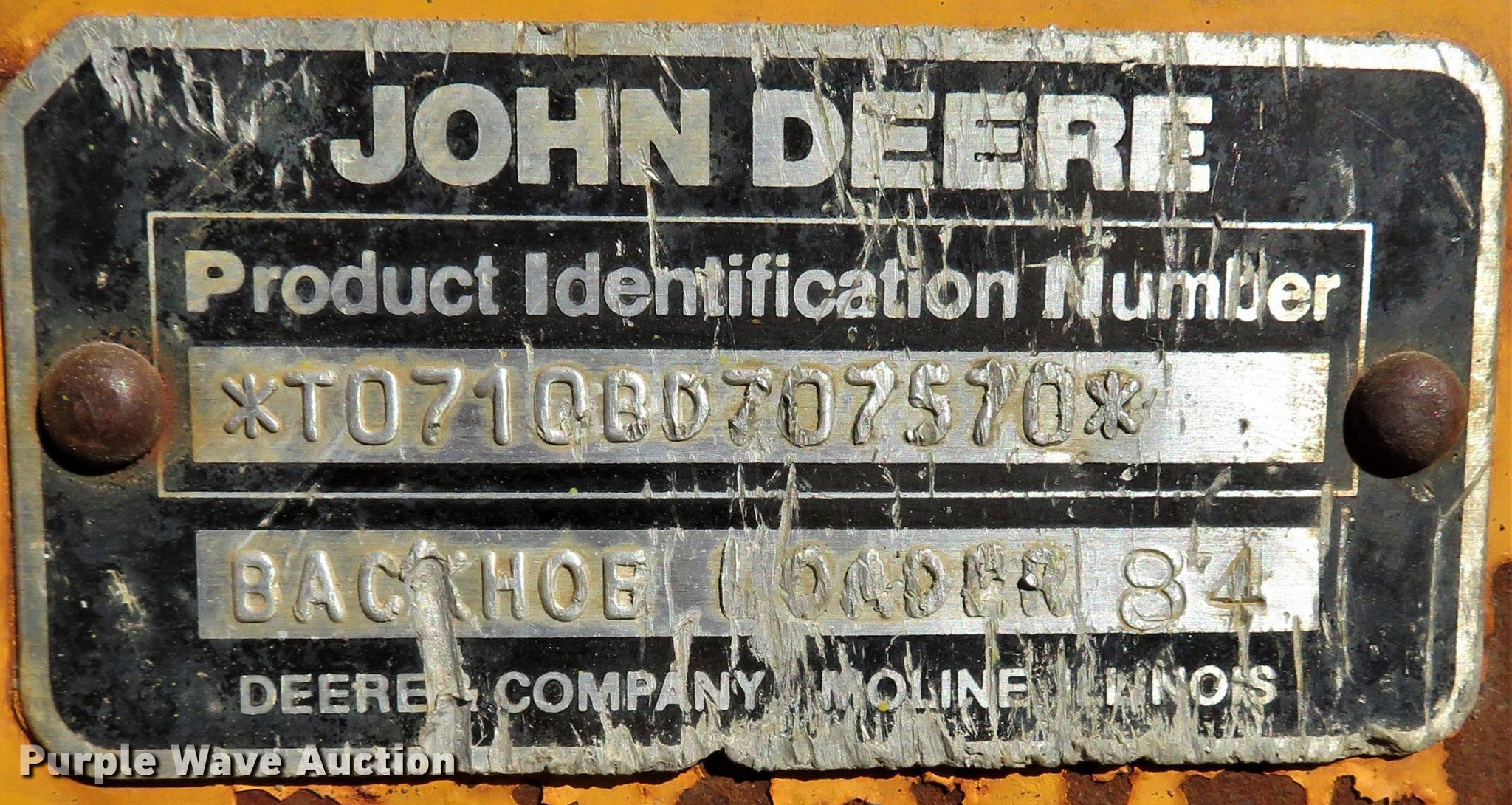 1984 John Deere 710B backhoe. Hours: 7,849 on meter, Hours: Unknown, Serial: T0710BD707570. Engine John Deere 6329T, Cylinders: 6, Fuel type: Diesel, HP: 100. Transmission Powershift, 8F - 4R. Chassis Differential lock. Operators station OROPS, Backhoe controls: Wobble stick / two stick. Operational Loader Bucket John Deere, Width: 91", Backhoe Extendable stick, Bucket Width: 24", Teeth: 5.. Tires Front: 14.5/75-16, Rear: 21L-24. Notes Non-operational hour meter, Hydraulic pump leak. RLJ Construction. Wildwood, MO 63038
