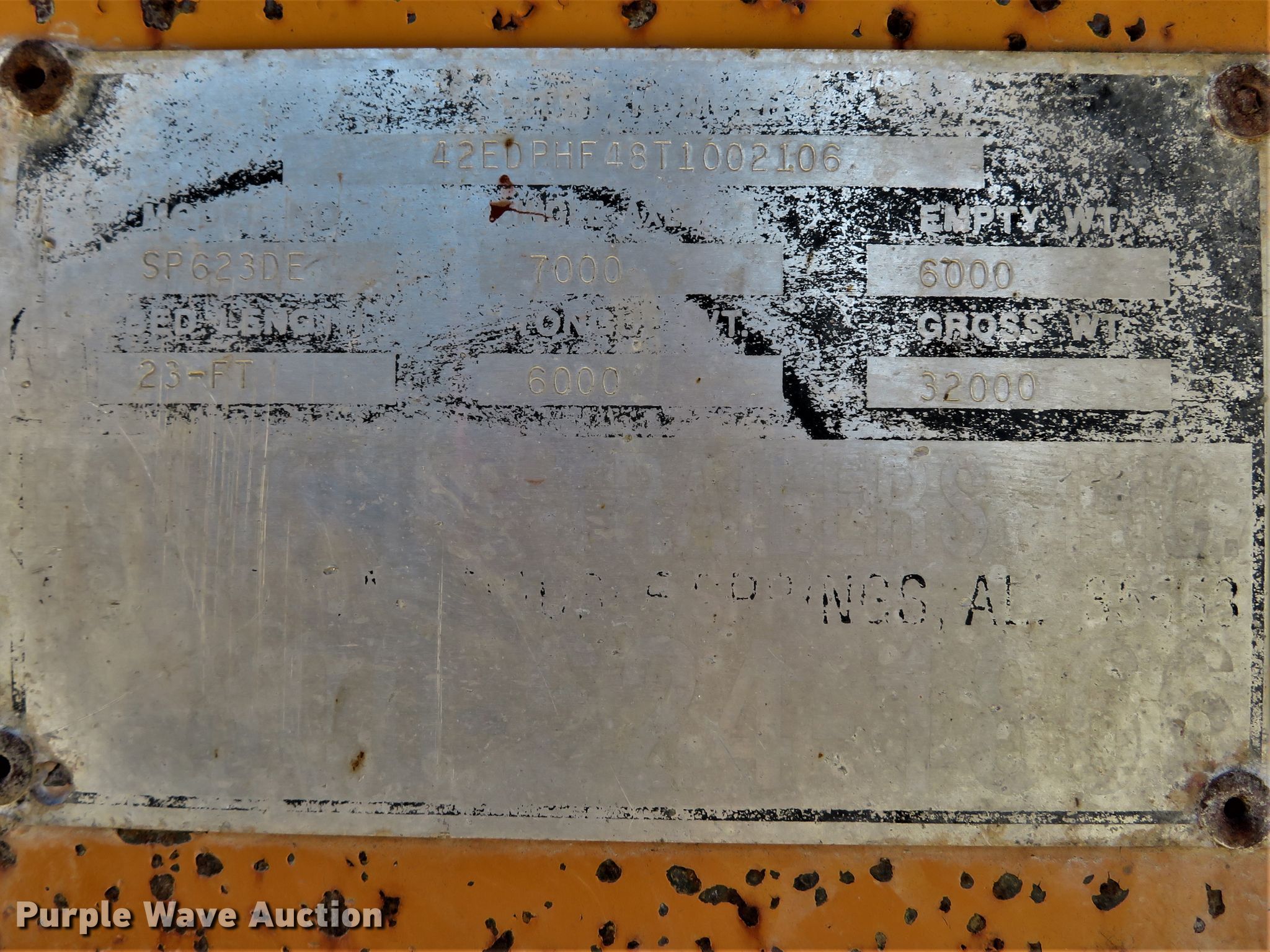 1997 Econoline SP623DE equipment trailer. VIN: DRX000221305MO. Dimensions Overall: 27' L x 96" W, Deck: 18' L x 96" W, Deck height: 32", Tail length: 5', Ramps: Manual Length: 5'. Operational Deck type: Wood. Chassis Hitch: Pintle, Suspension: Spring, Brakes: Electric, Axles: Tandem, GVWR: 32,000 lbs. Tires Steel wheels, Size: 9-14.5. Missouri title. Colbert Crew LLC. Troy, MO 63379