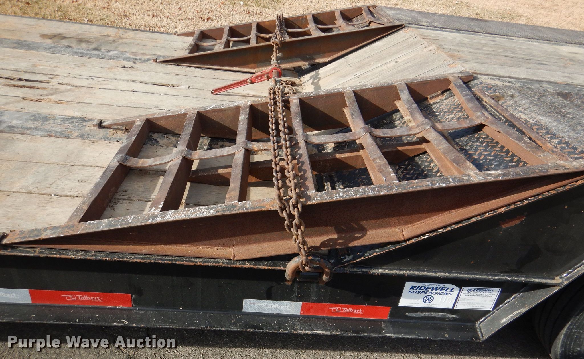 2016 Talbert TDW-35-FG-T1-DVTL drop deck equipment trailer. VIN: 40FS05125G5035391, Unit #: LB22. Dimensions Overall: 50' 6" L x 102" W, Deck: 24' L x 102" W, Top deck length: 7' 10", Rear deck length: 8', Hydratail length: 40", Ramps: Manual Length: 68". Operational Deck type: Wood. Chassis Landing gear: Dual, Suspension: Air, Brakes: Air, Axles: Tandem, GVWR: 17,500 lbs, GAWR: 89,480 lbs. Tires Aluminum wheels, Size: 235/75R17.5, Tire inflation system. Missouri title. 18017 S State Rte Y. Belton, MO 64012