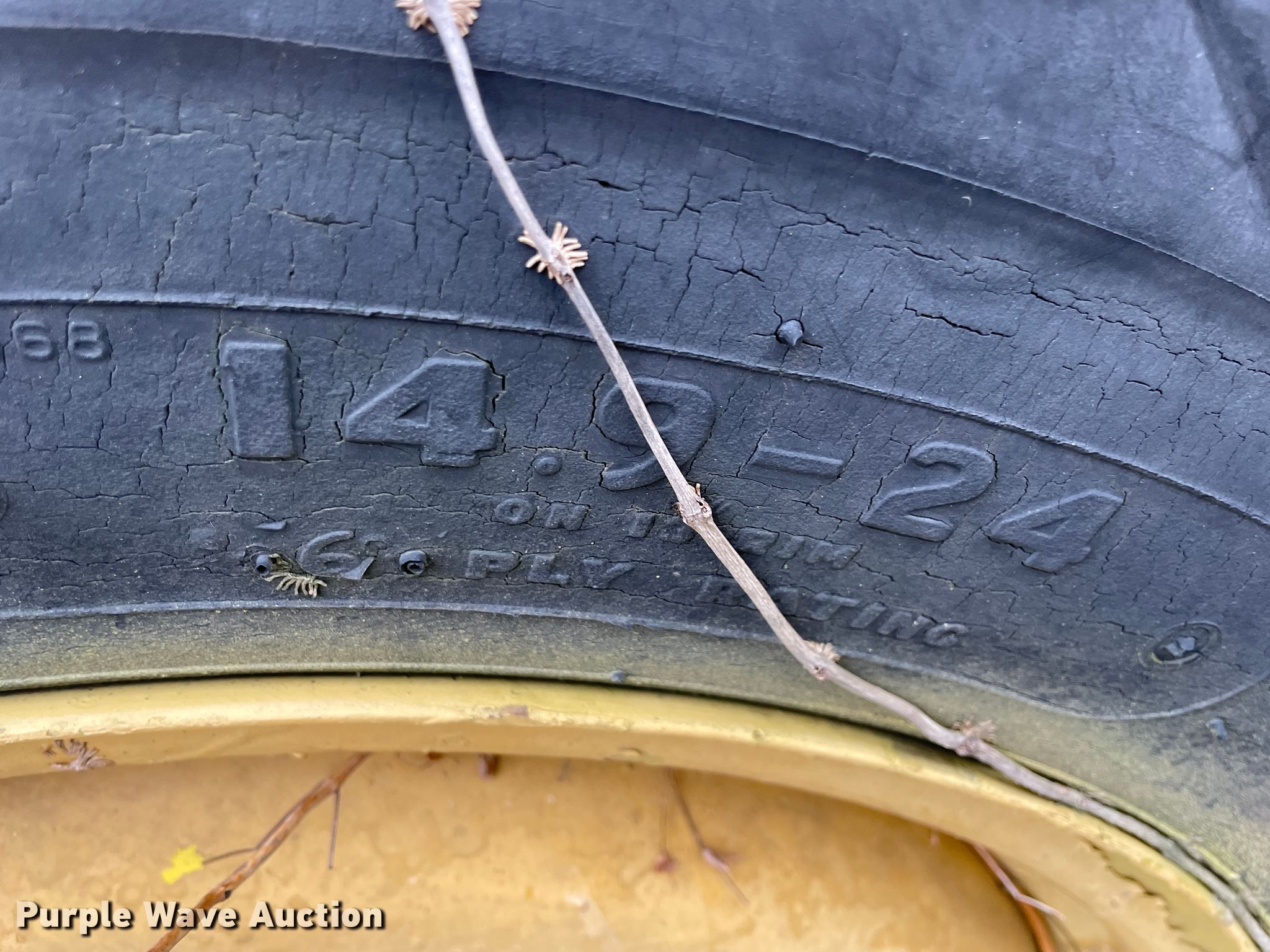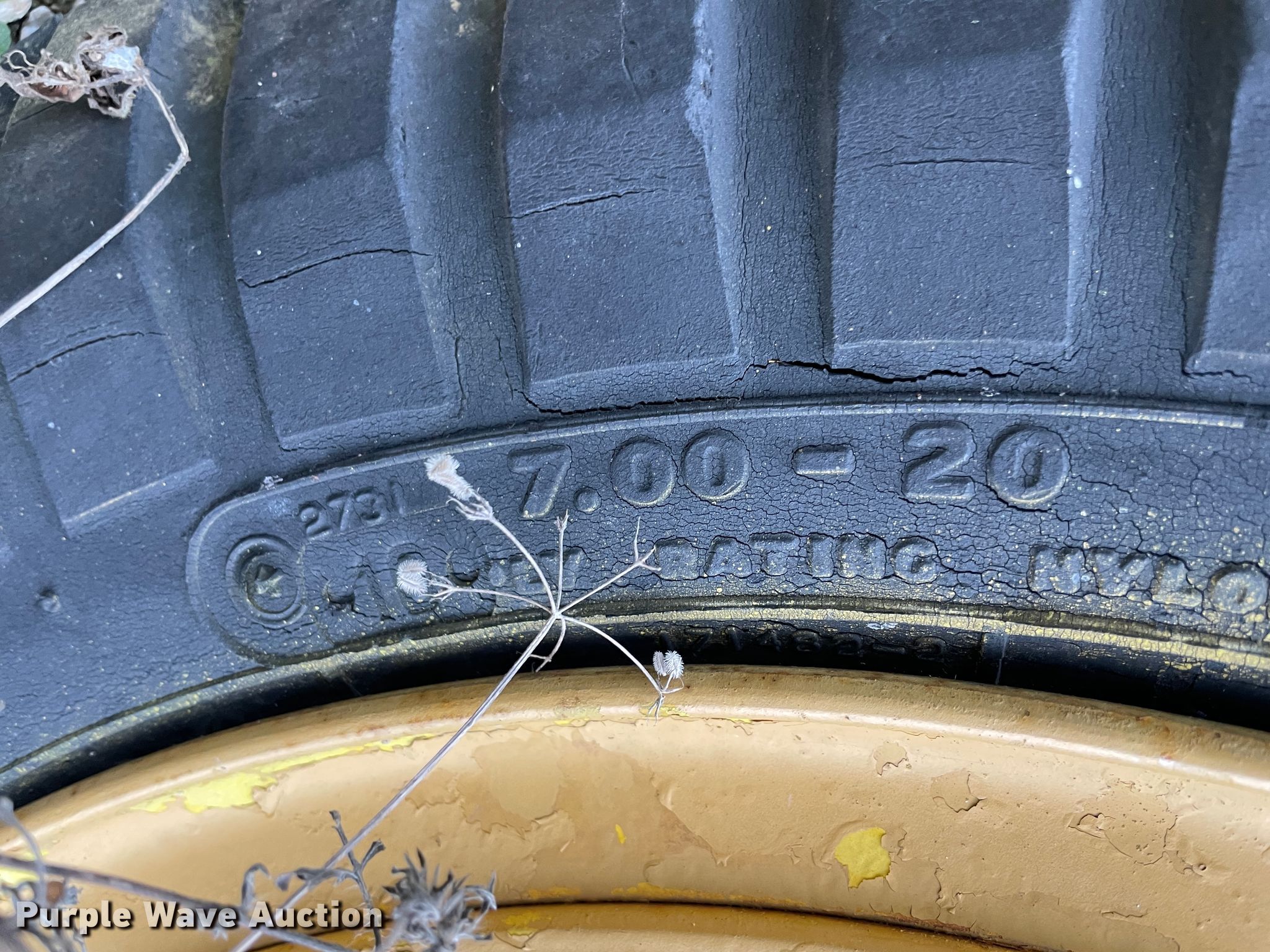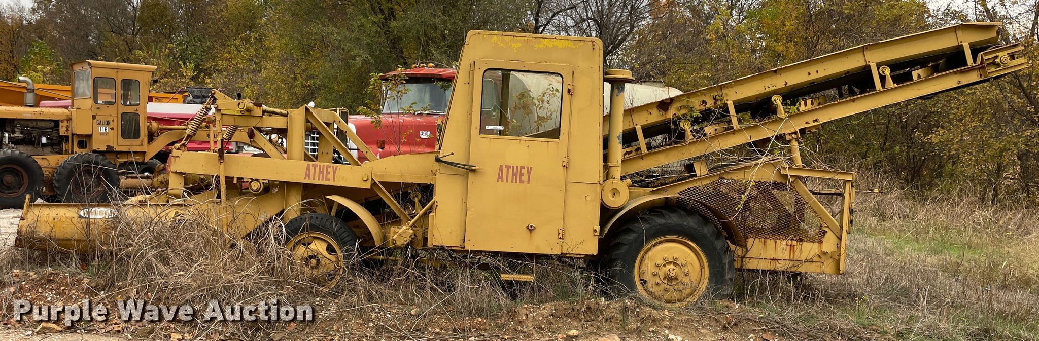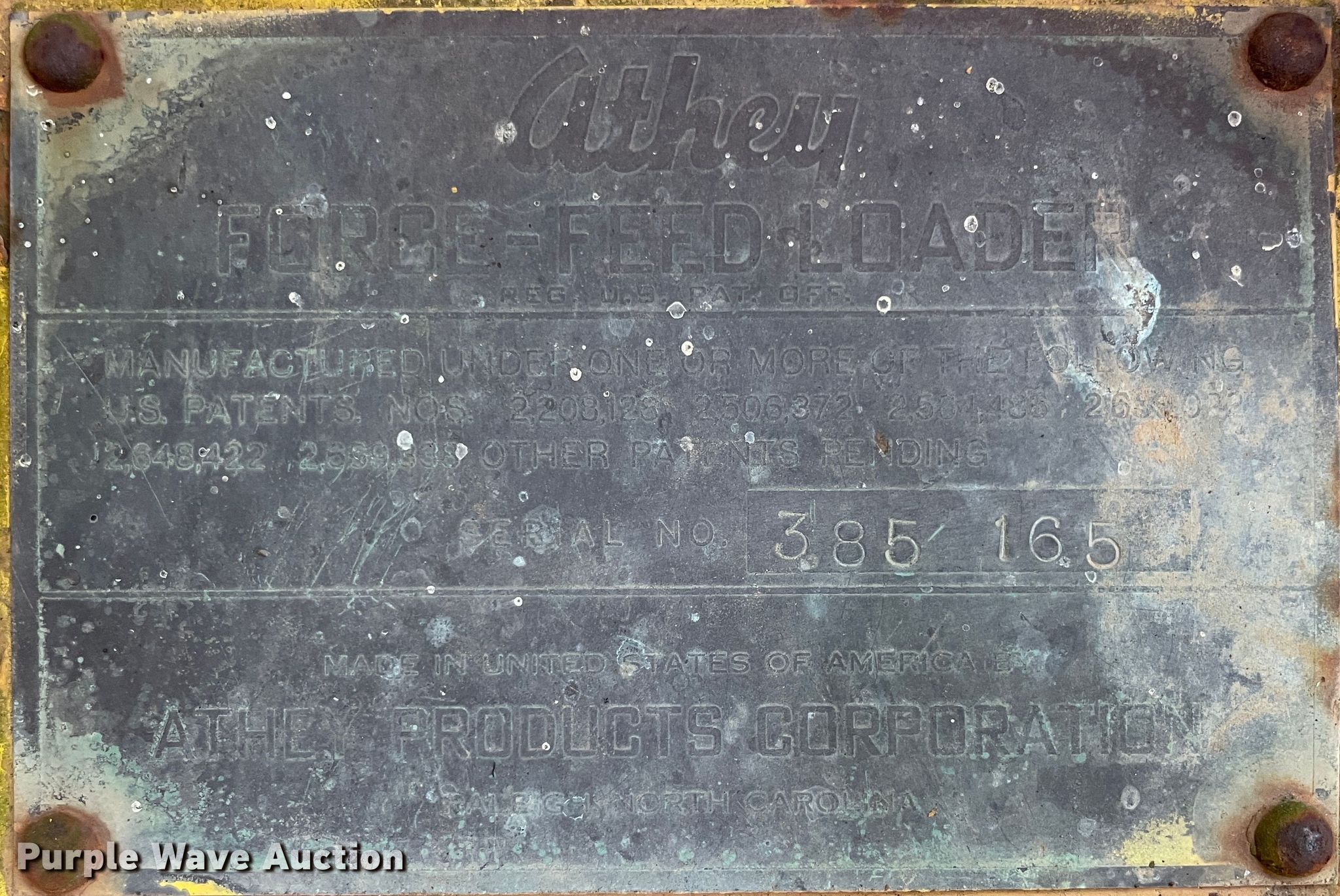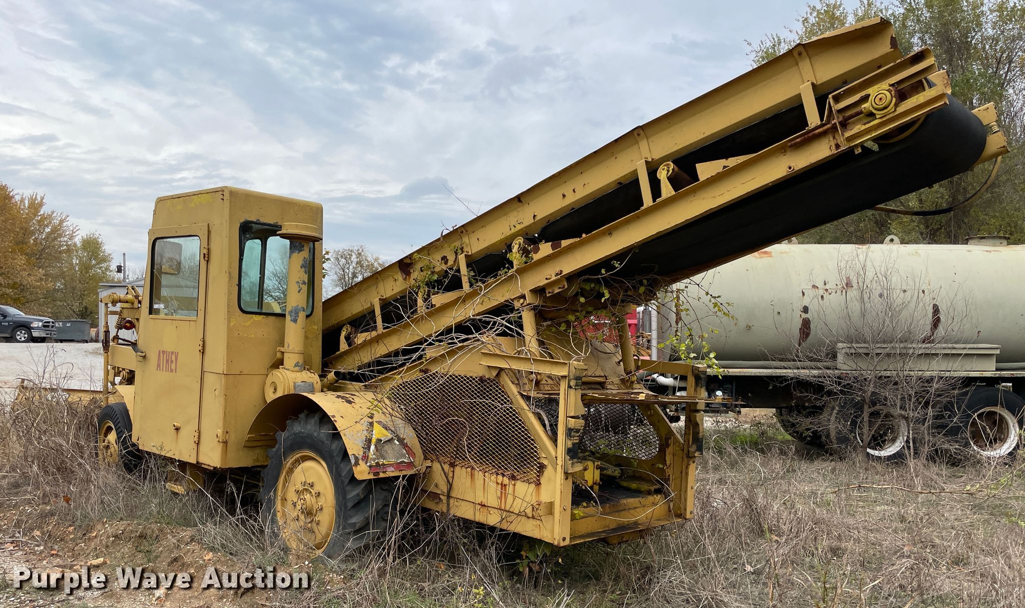 Atheys windrow elevator. Hours: Unknown, Serial: 385/165. Engine Cylinders: 4, Fuel type: Gas. Transmission Hydrostatic. Operational Hydraulic height adjustment, 7' wide opening, 25'L conveyor. Tires Front: 7.00-20, Rear: 14.9-24. Notes No hour meter, Missing radiator, Non-operational unit. Dotson Trucking, LLC. 296 Baker St. Oronogo, MO 64855
