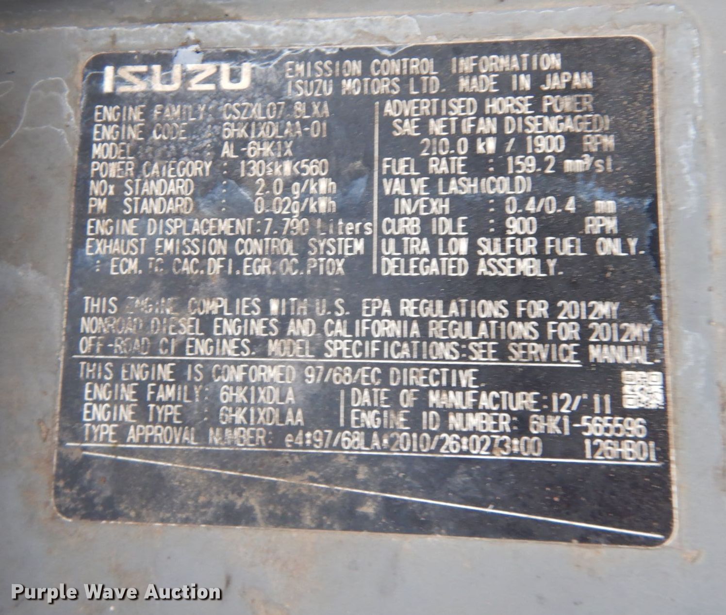 2012 Hitachi ZX350LC-5N excavator. Hours: 6,577 on meter. Engine Izuzu, Cylinders: 6, Fuel type: Diesel. Transmission Hydrostatic. Operators station Enclosed cab, Heat. Operational Boom Standard, Stick Stick length: 13', Thumb: Hydraulic, Bucket Width: 34", Cutting edge: Weld on, Teeth: 5. Tracks Width: 31.5", Steel, Grouser pads: Triple. Fitzgerald Excavating & Trucking. 21432 350th St. Goodhue, MN 55027