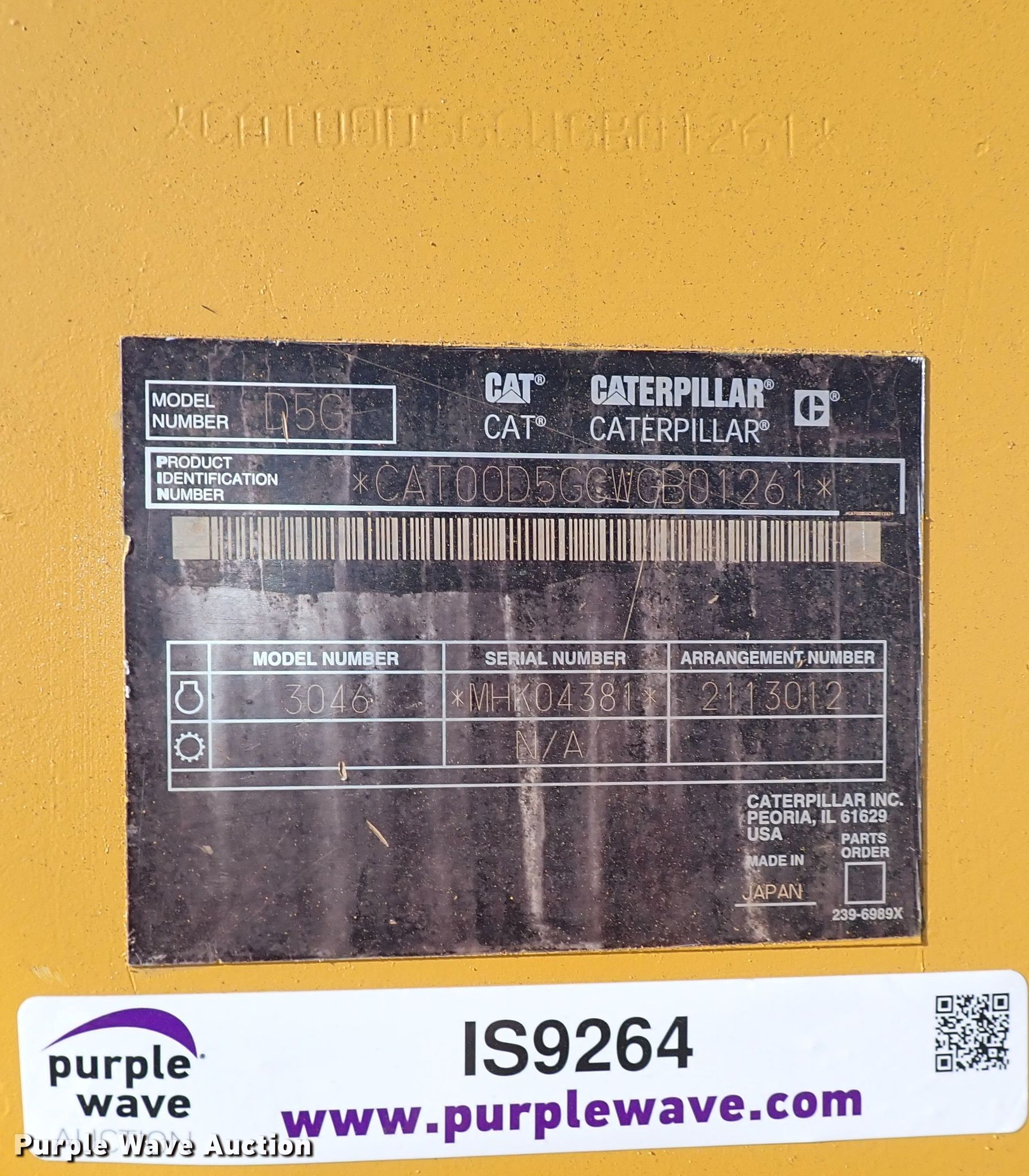 2004 Caterpillar D5G XL dozer. Hours: 682 on meter, Serial: CAT00D5GCWGB01261. Engine Caterpillar 3046, Serial: MHK04381, Displacement: 5.0L, Cylinders: 4, Fuel type: Diesel, HP: 99. Transmission Hydrostatic. Operators station OROPS, Steering: Joystick. Operational Dozer blade Type: 6-way, Straight, Width: 102" W. Tracks Width: 20", Grouser pads: Single, Bottom rollers: 6. Norman, OK 73070
