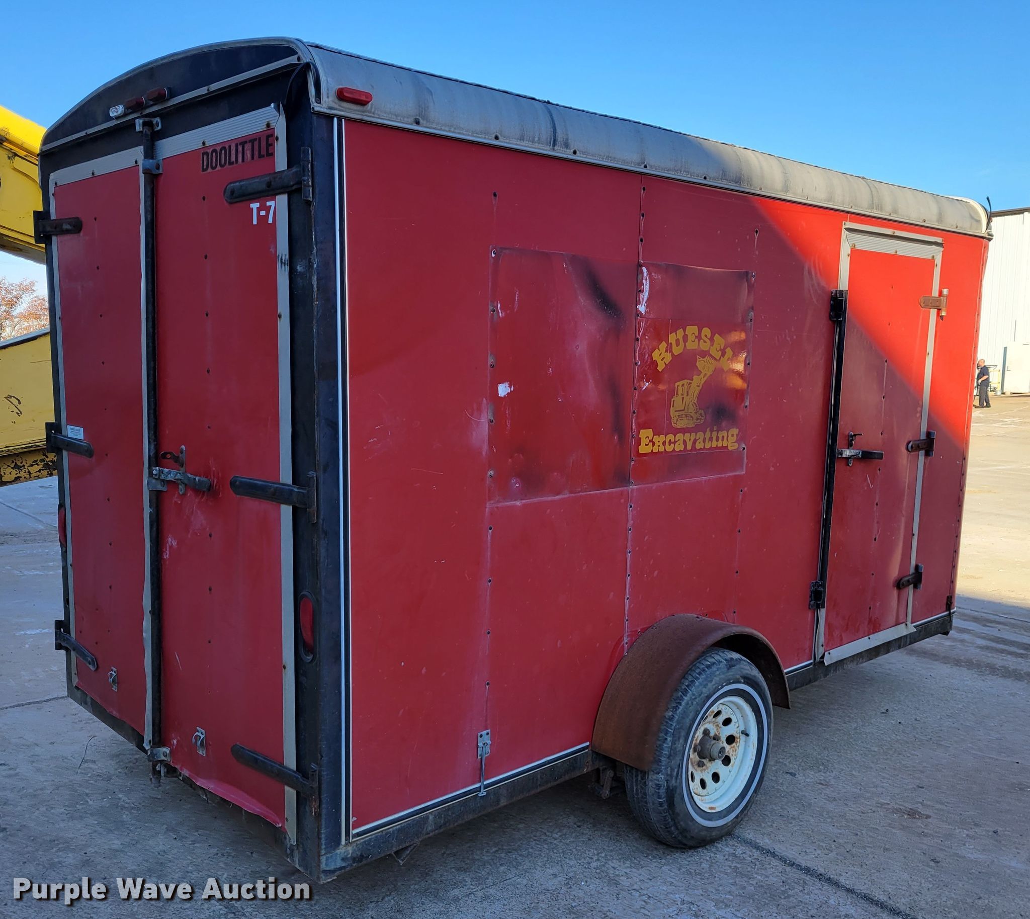 1995 Doolittle enclosed cargo trailer. VIN: 1DGCS1217SM023693. Dimensions Overall: 15' L x 92" W, Body: 12' L x 72" W. Operational Deck type: Wood. Chassis Ball hitch: 2", Landing gear: Single, Suspension: Spring, GVWR: 2,990 lbs. Tires Steel wheels, Size: 205/75R15. Missouri title. Kuesel Excavating Company. O Fallon, MO 63366