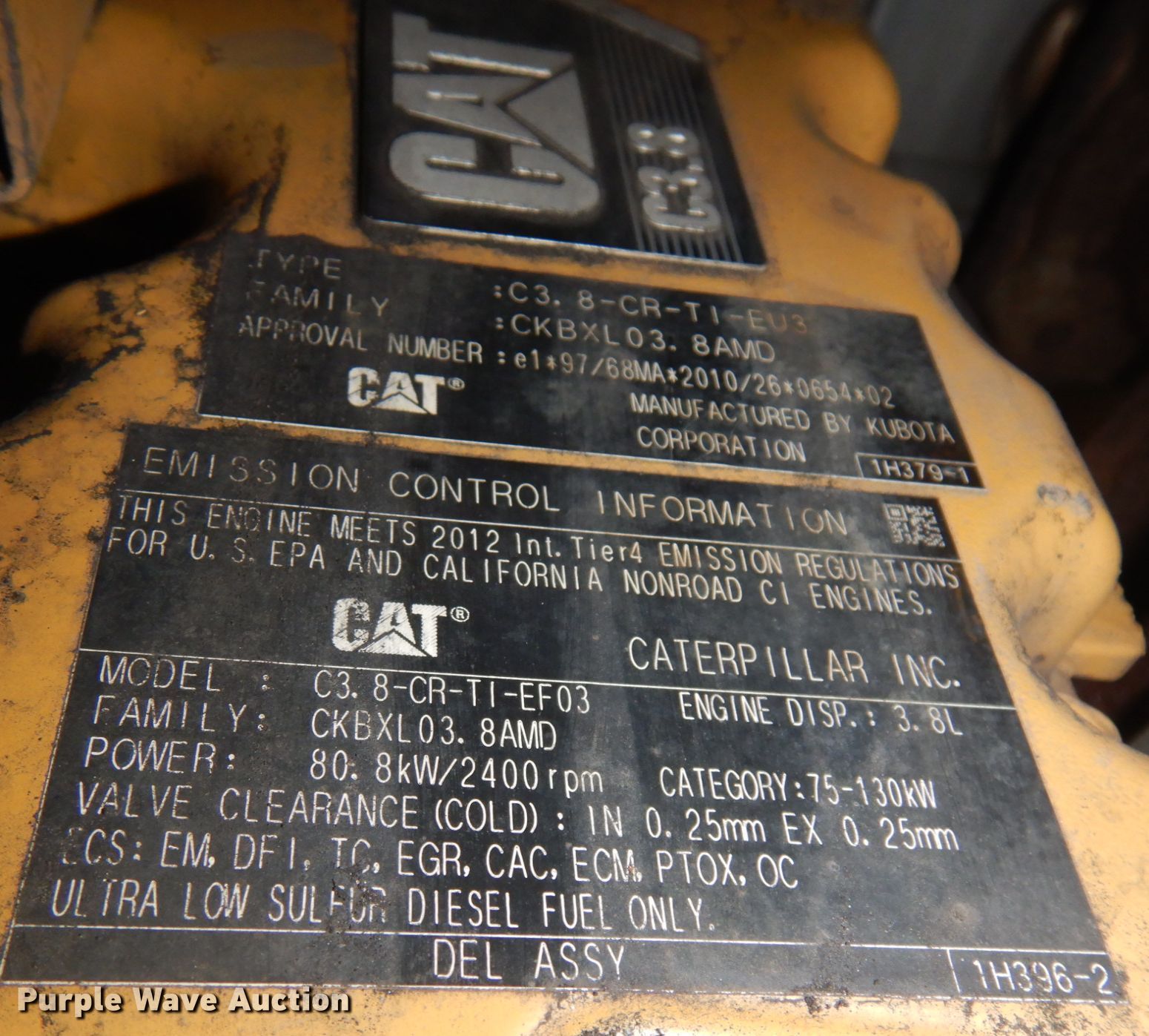 2012 Caterpillar 272D XHP skid steer loader. Hours: 648 on meter, Miles or hours may vary, unit still in use, Serial: CAT0272DESHY00346. Engine Caterpillar C3.8-CR-TI-EF03, Displacement: 3.8L, Cylinders: 4, Fuel type: Diesel, HP: 110. Transmission Hydrostatic, Two speed travel. Operators station EROPS AC, Heat, Bucket control: Hand, Electronic Monitoring System panel. Operational Auxiliary hydraulics, Auxiliary electrical outlet, Quick coupler: Hydraulic, Counter weights, Bucket Caterpillar 279-5372, Capacity: 0.58 cu.yd., Width: 73", Low profile, Cutting edge: Bolt-on, Forks Caterpillar 351-9371 48". Tires Size: 14-17.5. Notes Backup camera. Tinuum Services, LLC. Centralia, WA 98531