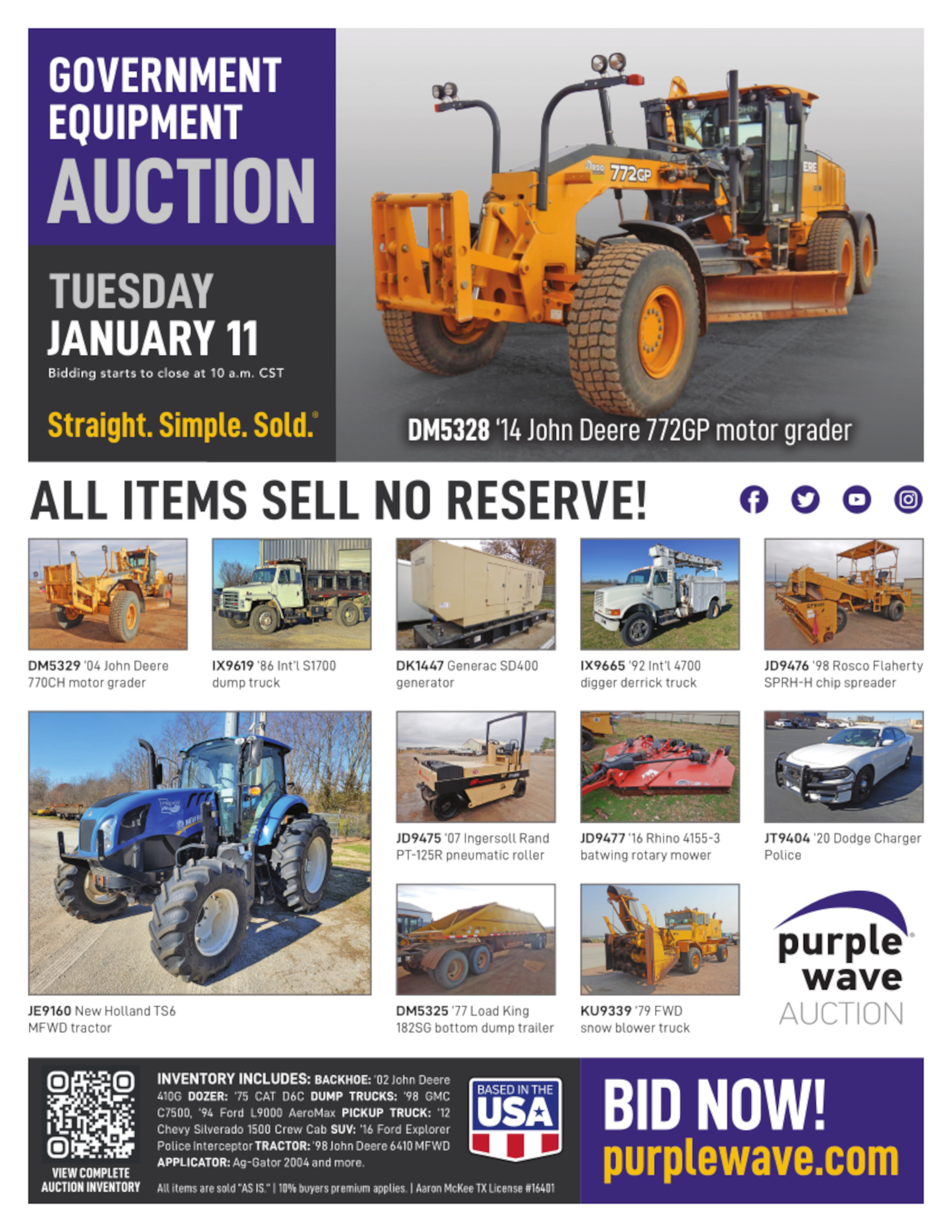 This auction is conducted by Purple Wave, Inc., whose home office is 825 Levee Drive, Manhattan, Kansas. Aaron McKee, Texas auctioneer license # 16401, operates Purple Wave, Inc. Complaints against us may be directed to the Texas Department of Licensing and Regulation, P.O. Box 12157, Austin, Texas 78711, (512) 463-6599. For additional required information, see the attached document.