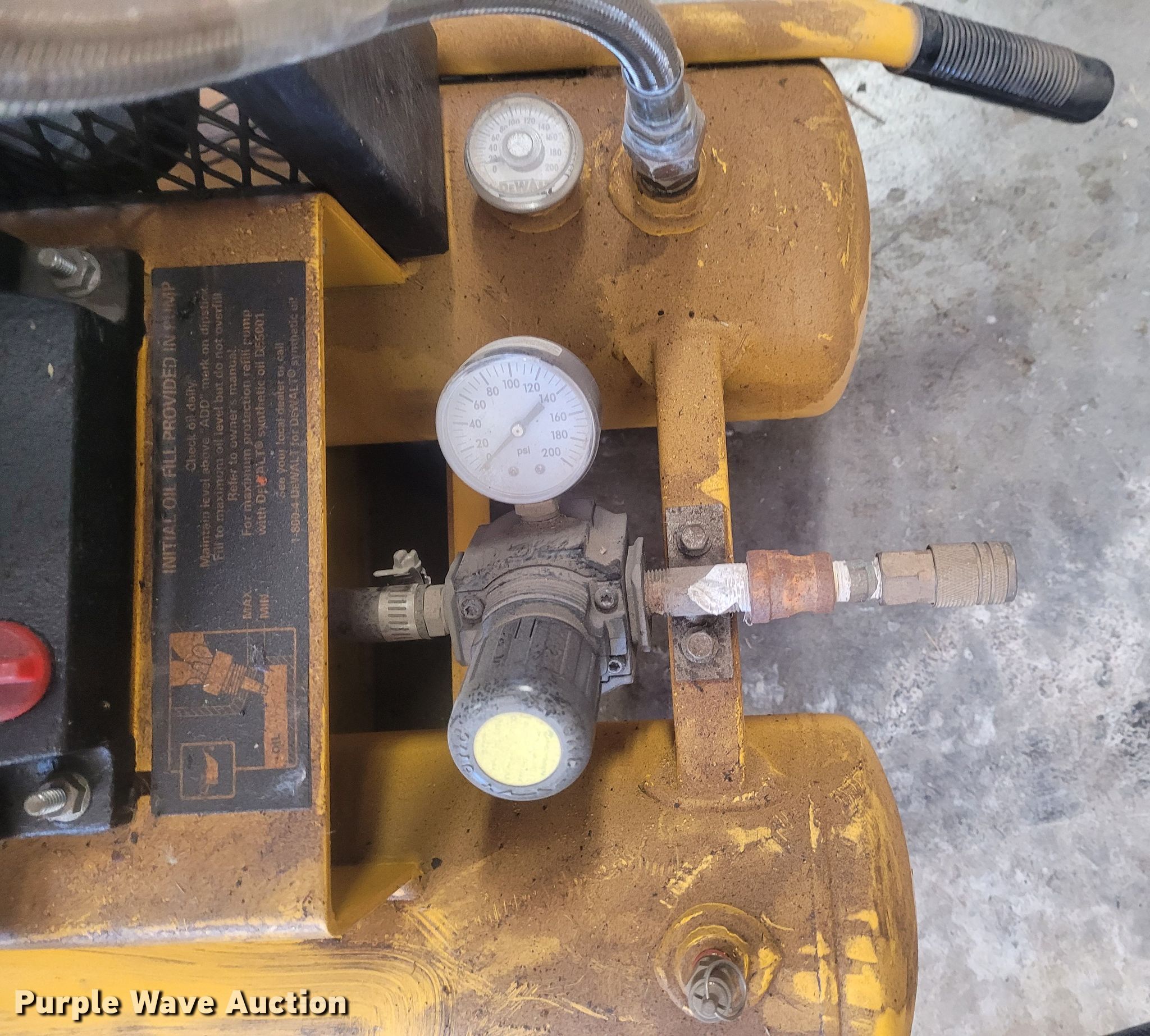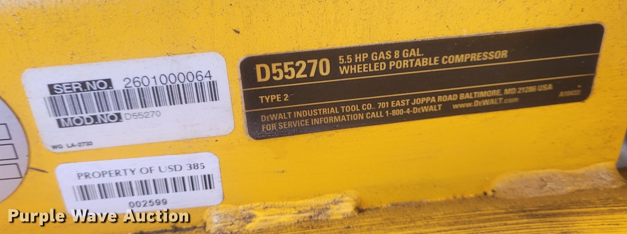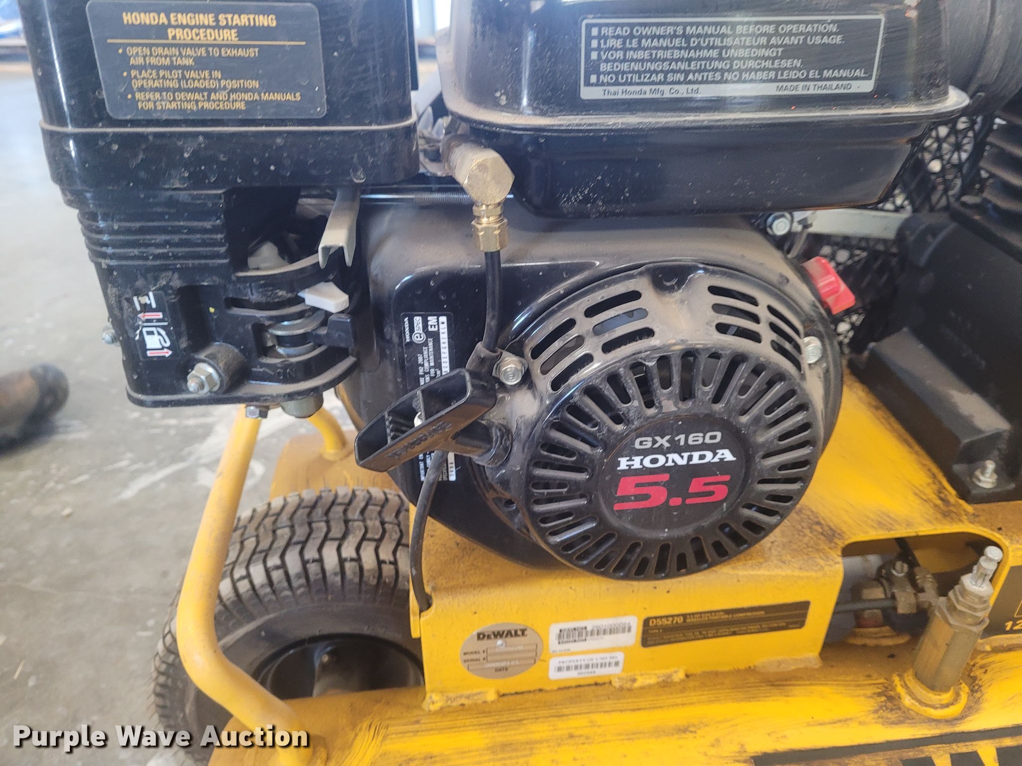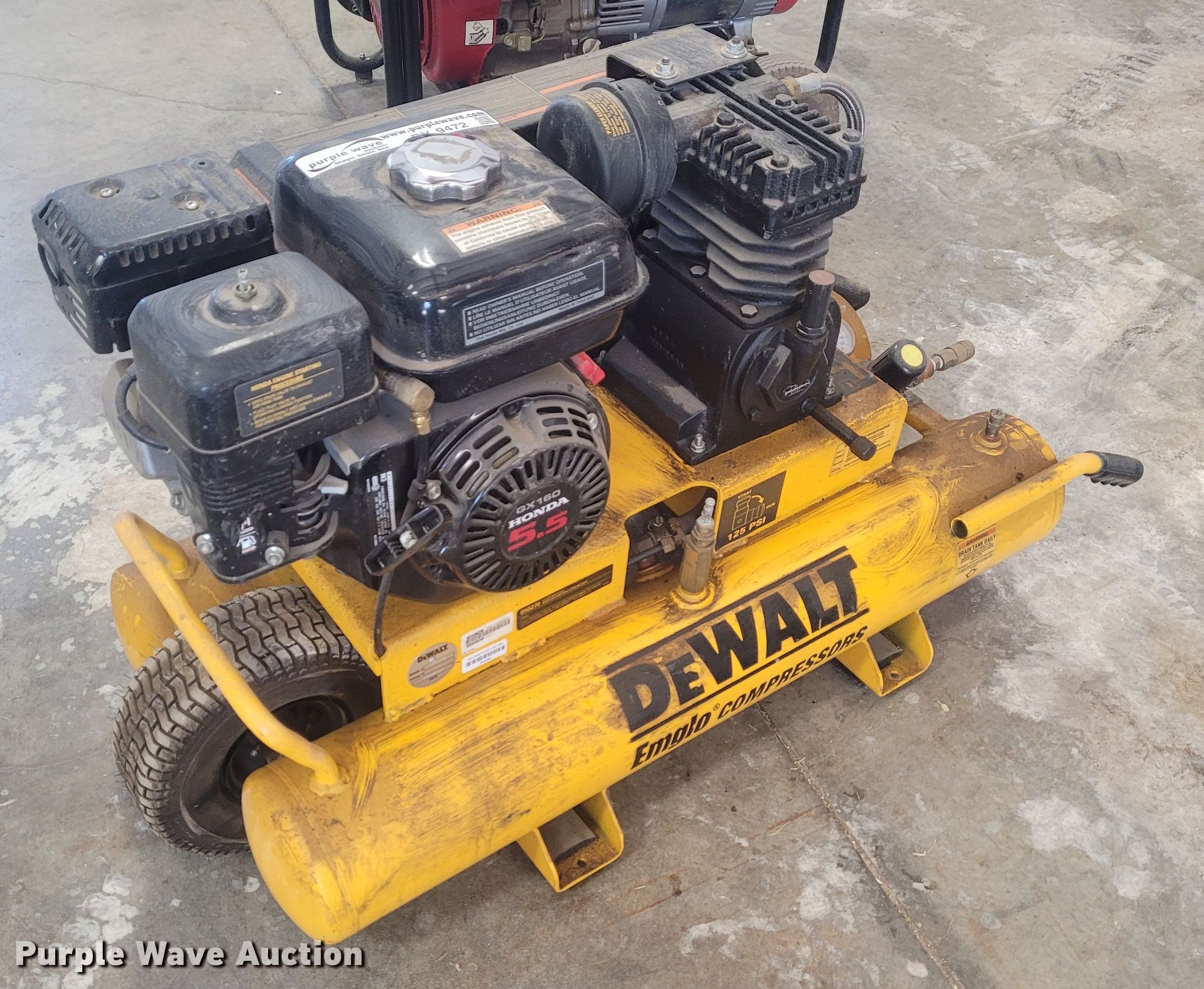 Purple Wave is selling a used Air Compressor in Kansas. This item is a 2006 DeWalt Emglo D55270 air compressor with the following: Honda gas engine, 5.5 HP