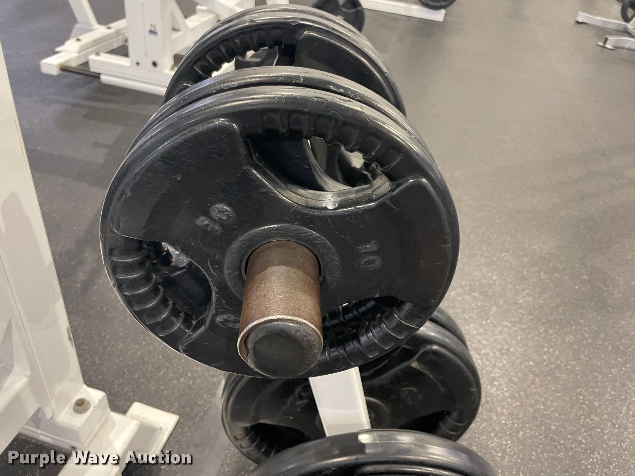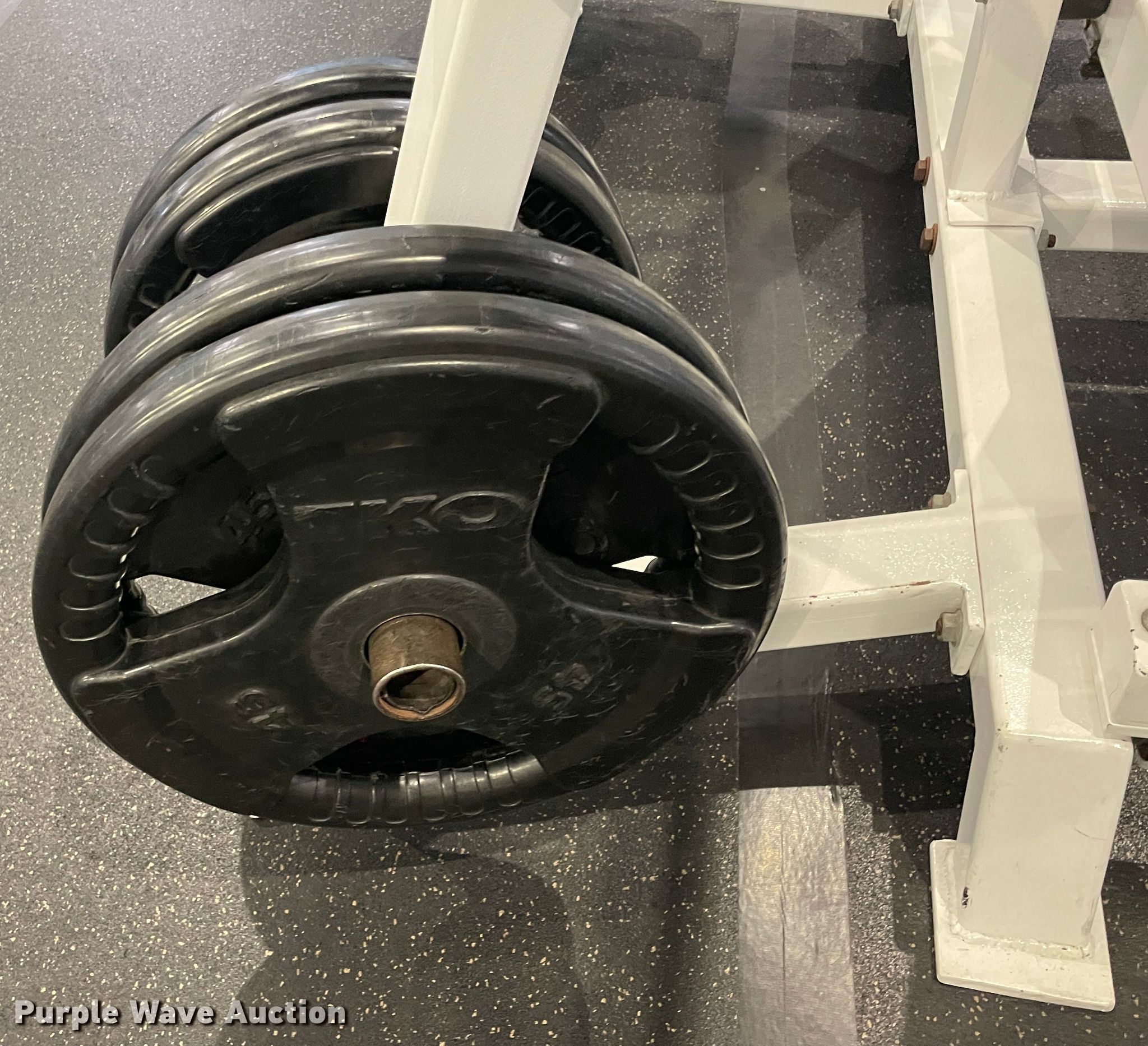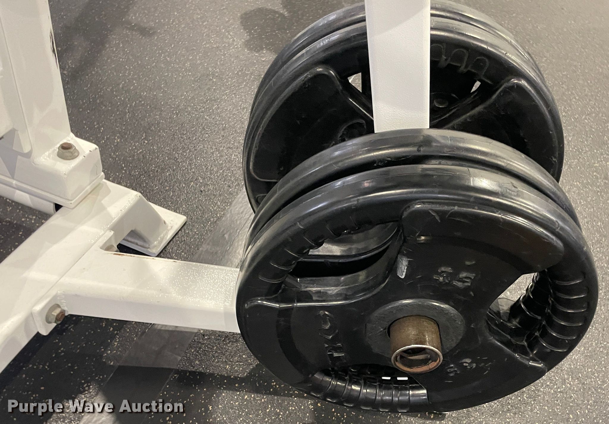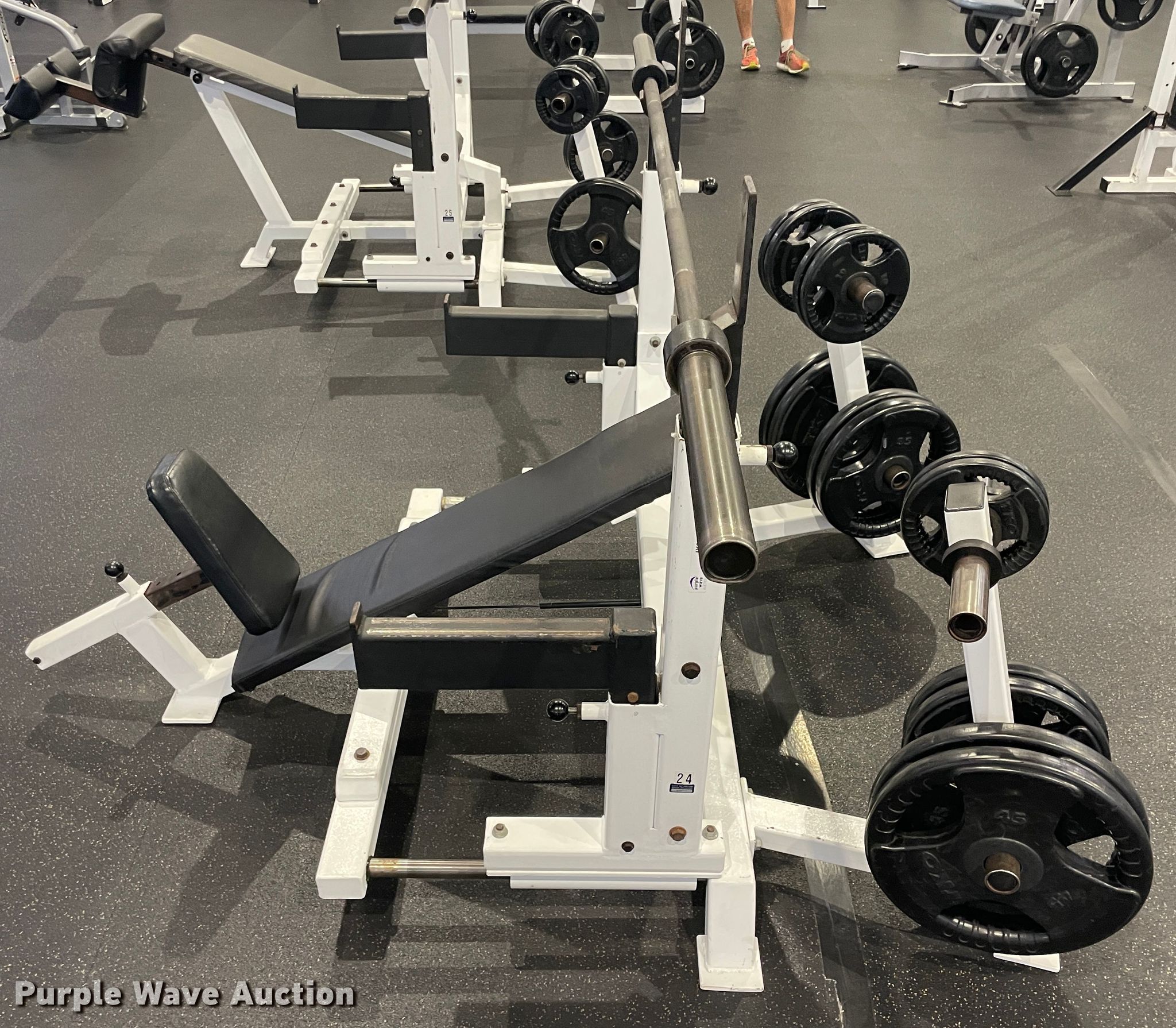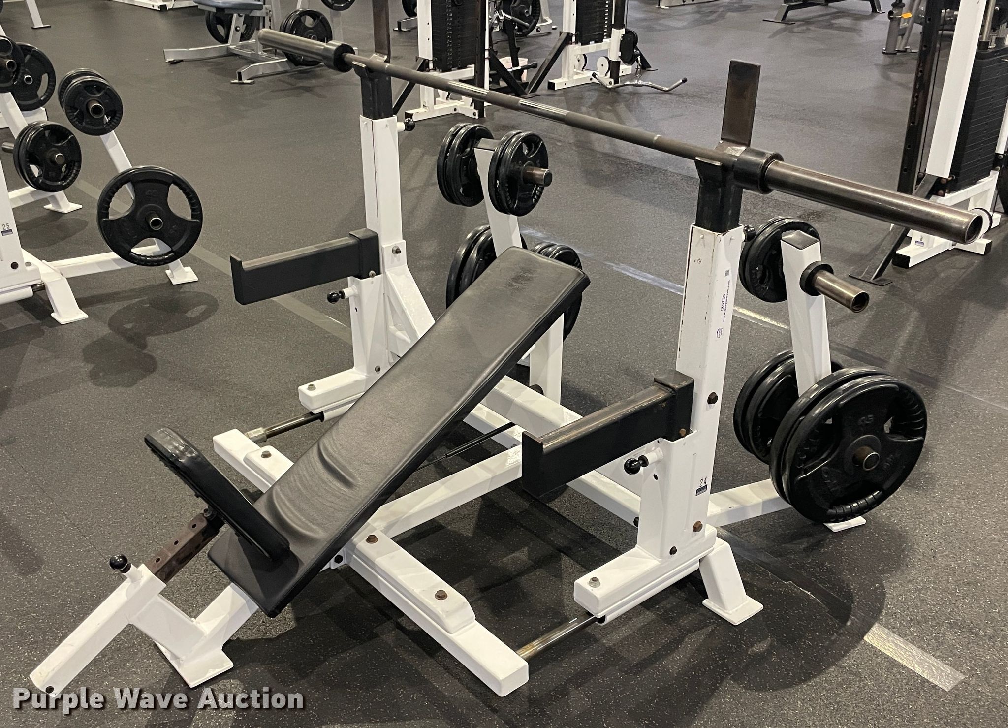 Purple Wave is selling a used Sporting Goods in Oklahoma. This item is a Incline bench with the following: Barbell, 5 lbs weights, 10 lbs weights, 25 lbs weights, 45 lbs weights, Adjustable rack height