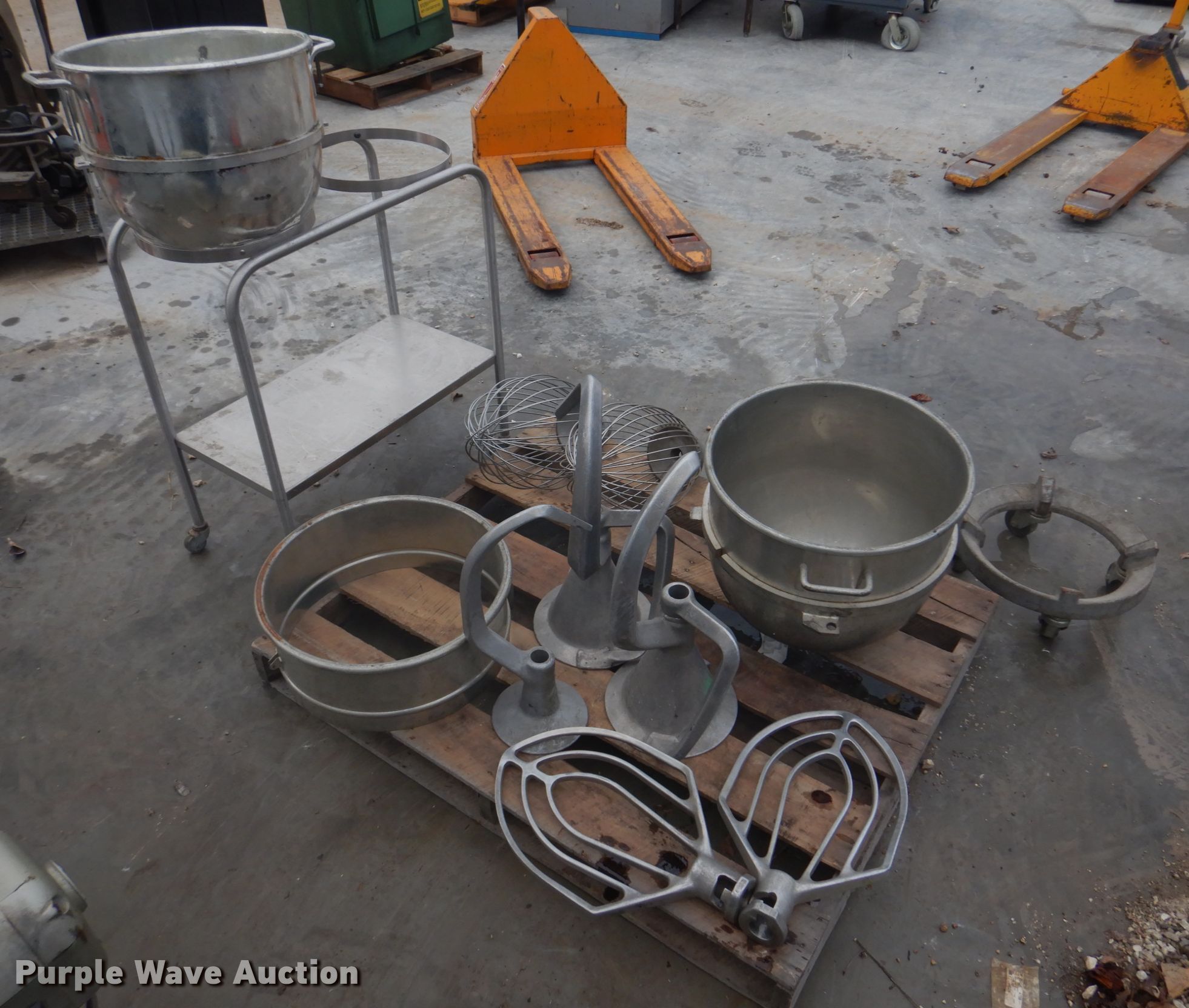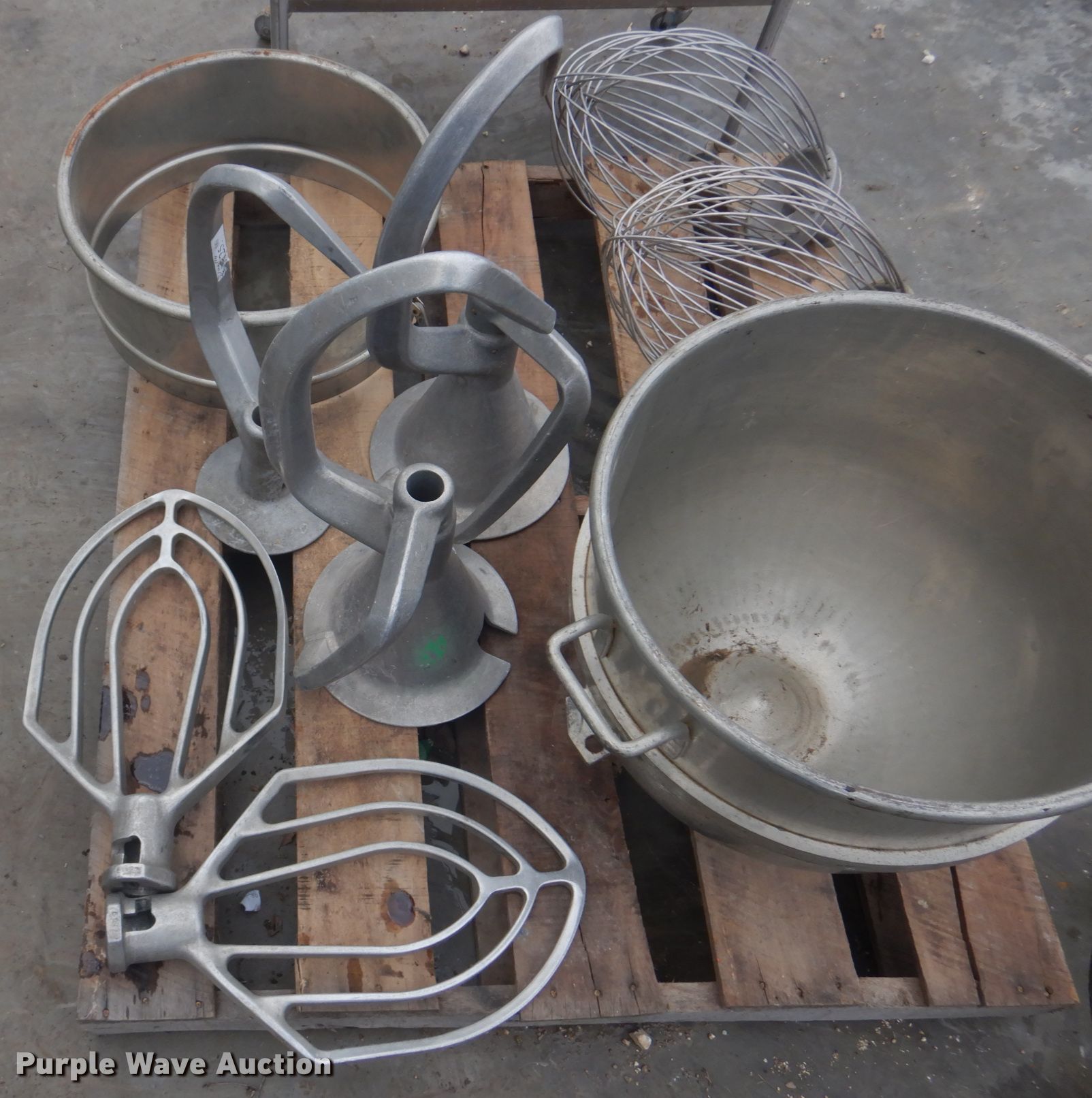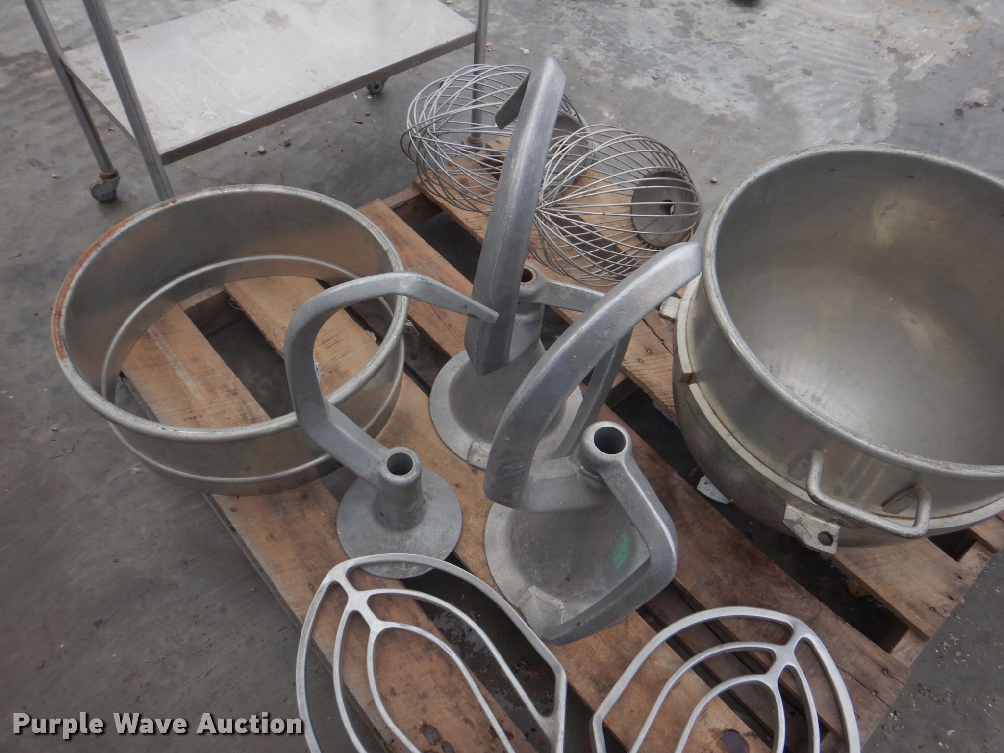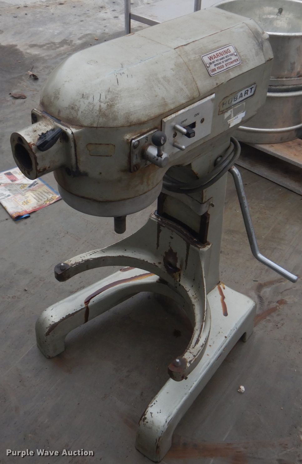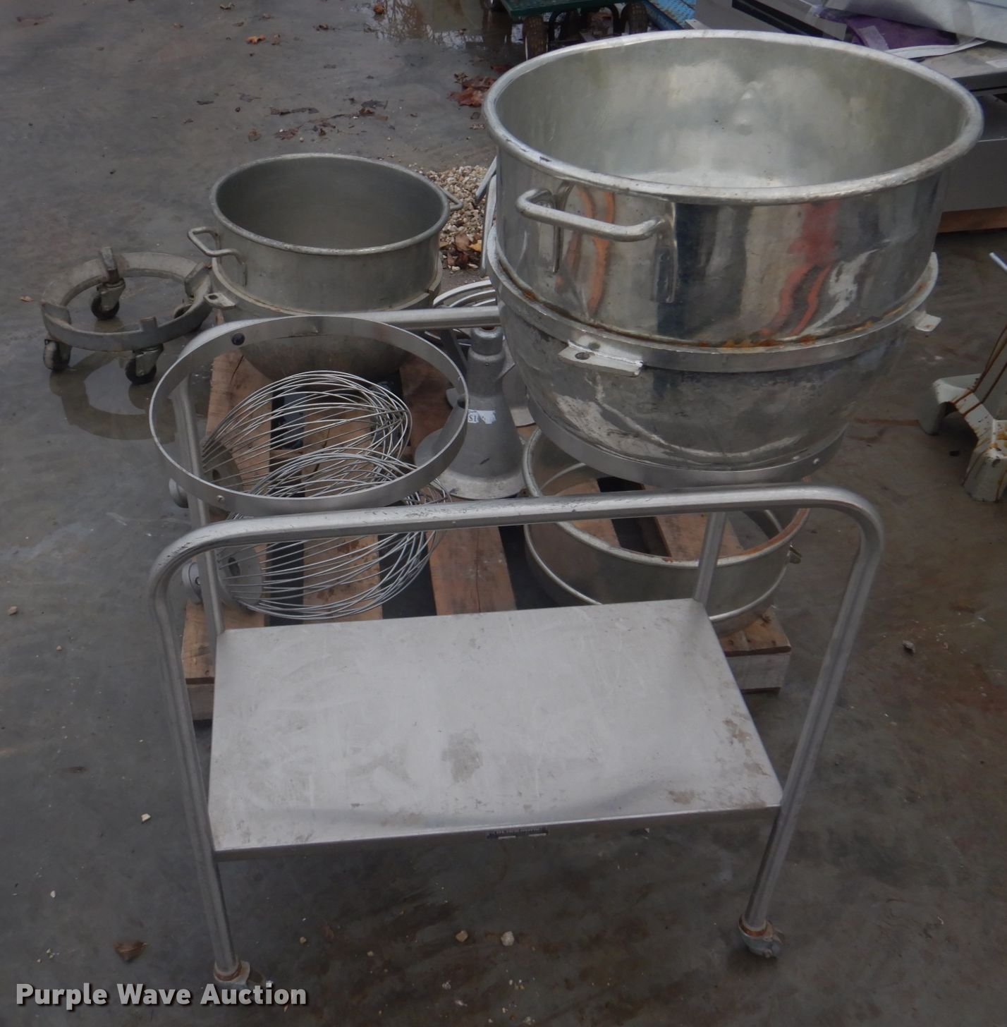 Purple Wave is selling a used Restaurant Equip. in Missouri. This item is a Restaurant equipment with the following: (3) mixers, Hobart L-800, 208V, Three phase, 1.5 HP, Serial: 1667006, Hobart A-200, 115V, Single phase, 1/3 HP, Serial: 11294146, Blakeslee B-20T, 120V, Single phase, 1/2 HP, Serial: 2-20723-1GCB,, Mixer attachments, (2) mixer bowls, True TUC-60 refrigerator, 60"W x 30"D x 33"H, (2) stainless steel cabinets, One with keys, Unknown operating condition