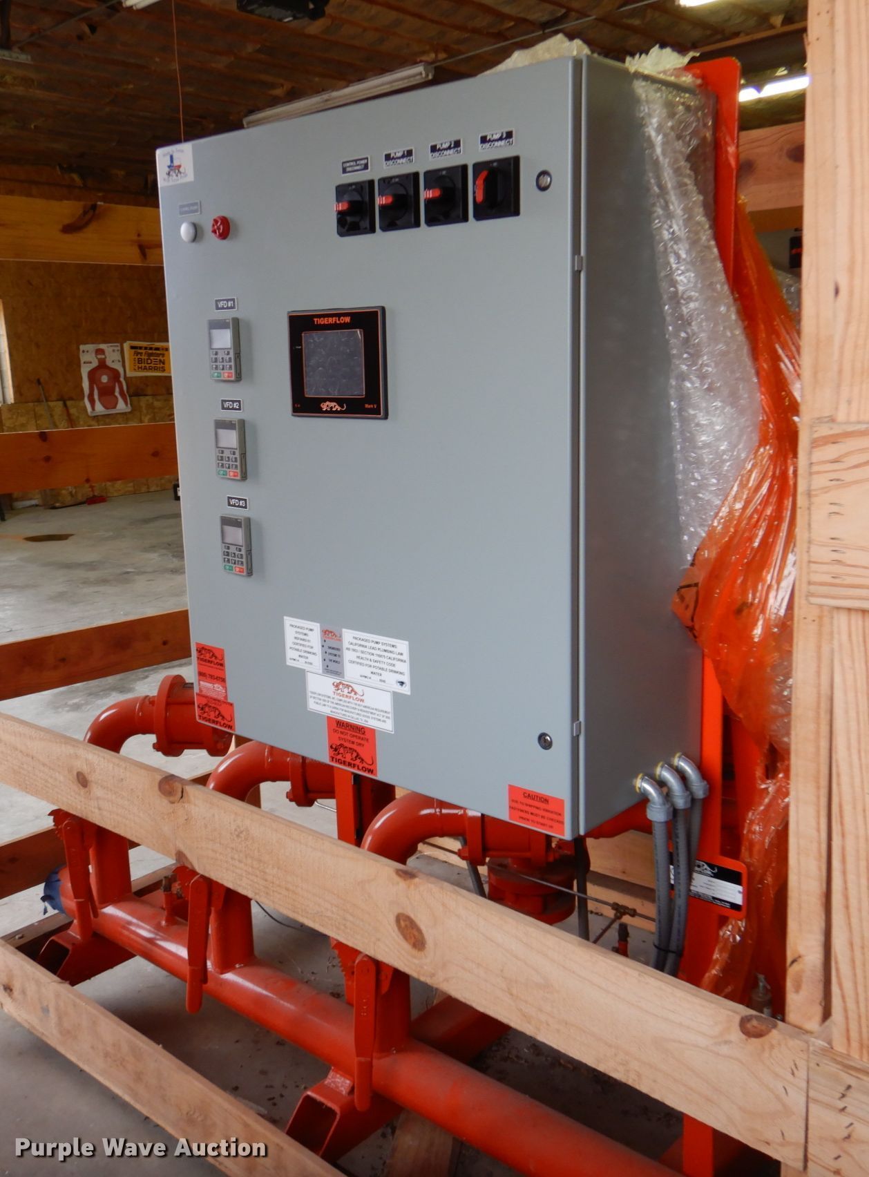 Purple Wave is selling a used Pump in Nebraska. This item is a Tigerflow ES-3000 Domestic Triplex VFD booster pump with the following: Volts: 460, Phase: Three, Hz: 60, HP: 15, (3) Baldor Reliance electric motors, Volts: 208-230/460, Phase: Three, HP: 15, (3) variable frequency drive pumps, Model: 1403A.3, Class: 125/250, Size: 3", CWP: 400 PSI, 175 GPM @ 150' TDH, Tigerflow TF-185 expansion tank, Type: WTL-680, Capacity: 185 gallons, PSI: 200, NSF-61 bladder tank, Tigerflow Mark V instrument panel, Digital read-out, Production no. 346967, Unused, Unit #: 6967