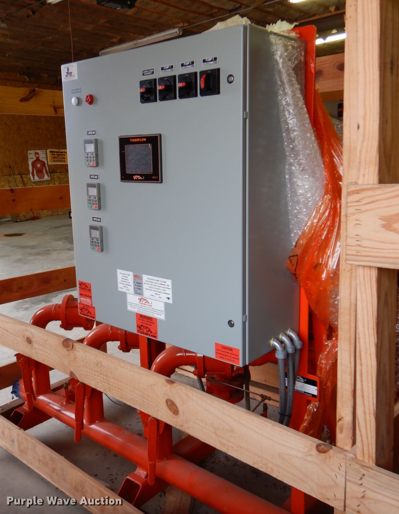 Purple Wave is selling a used Pump in Nebraska. This item is a Tigerflow ES-3000 Domestic Triplex VFD booster pump with the following: Volts: 460, Phase: Three, Hz: 60, HP: 15, (3) Baldor Reliance electric motors, Volts: 208-230/460, Phase: Three, HP: 15, (3) variable frequency drive pumps, Model: 1403A.3, Class: 125/250, Size: 3", CWP: 400 PSI, 175 GPM @ 150' TDH, Tigerflow TF-185 expansion tank, Type: WTL-680, Capacity: 185 gallons, PSI: 200, NSF-61 bladder tank, Tigerflow Mark V instrument panel, Digital read-out, Production no. 346974, Unused, Unit #: 6974