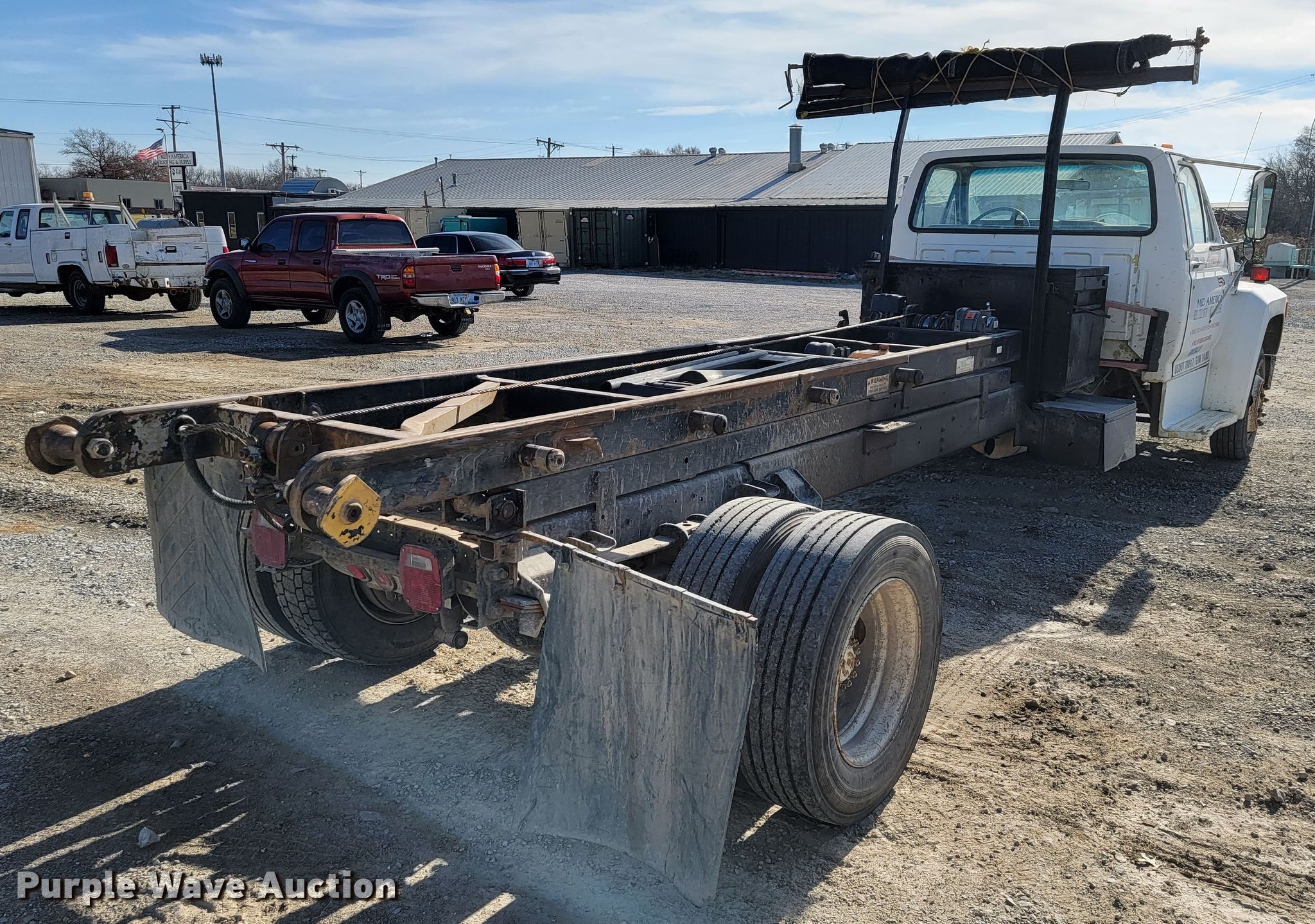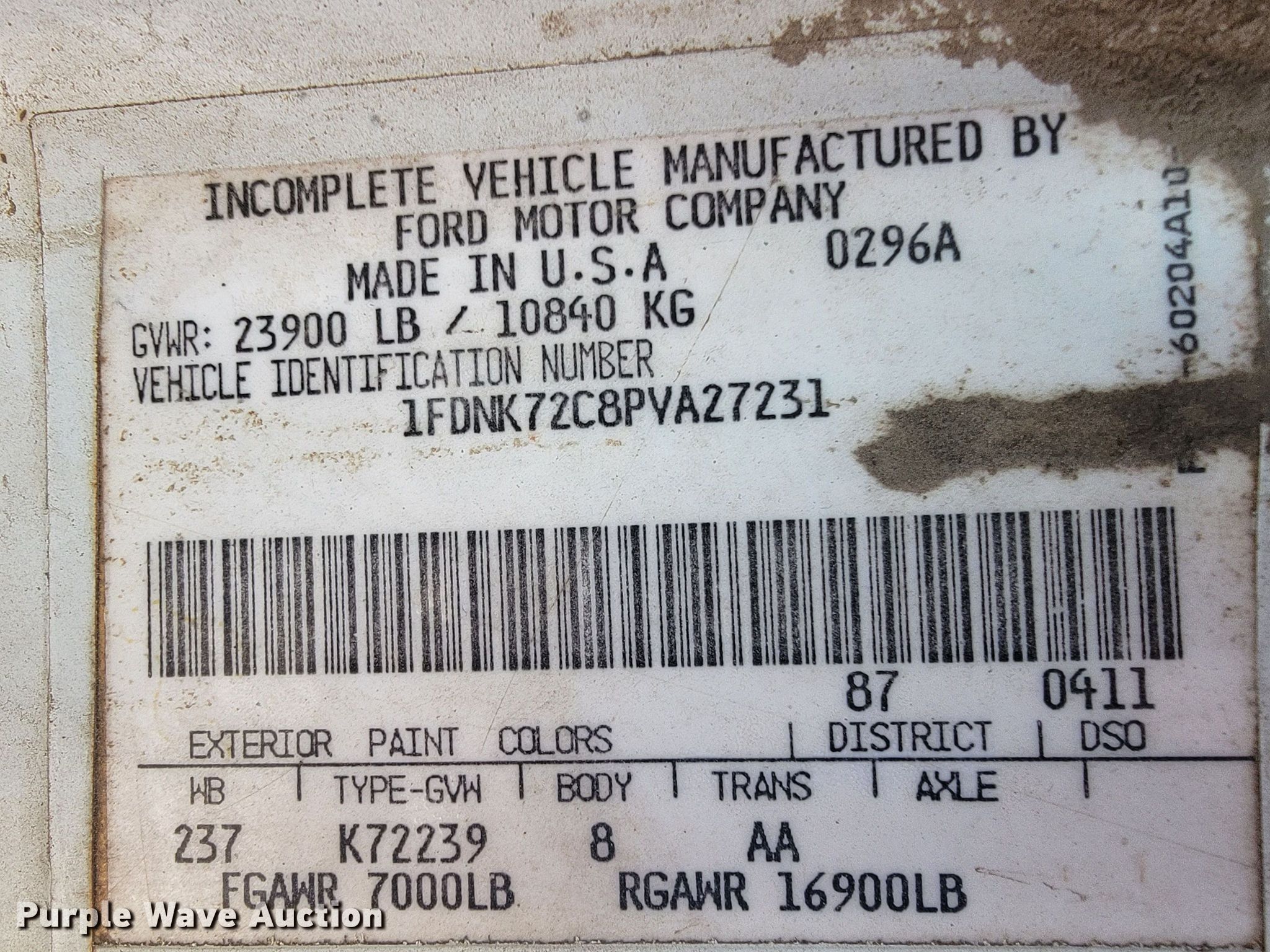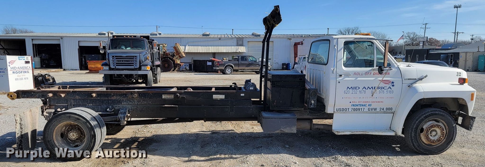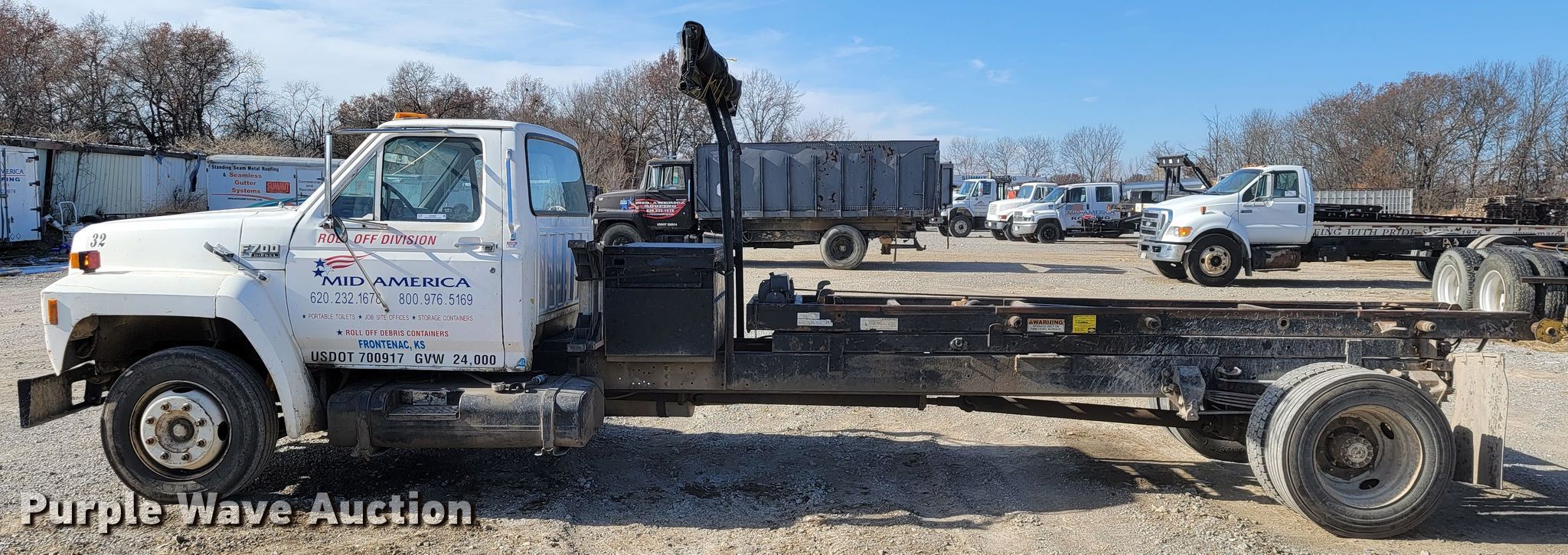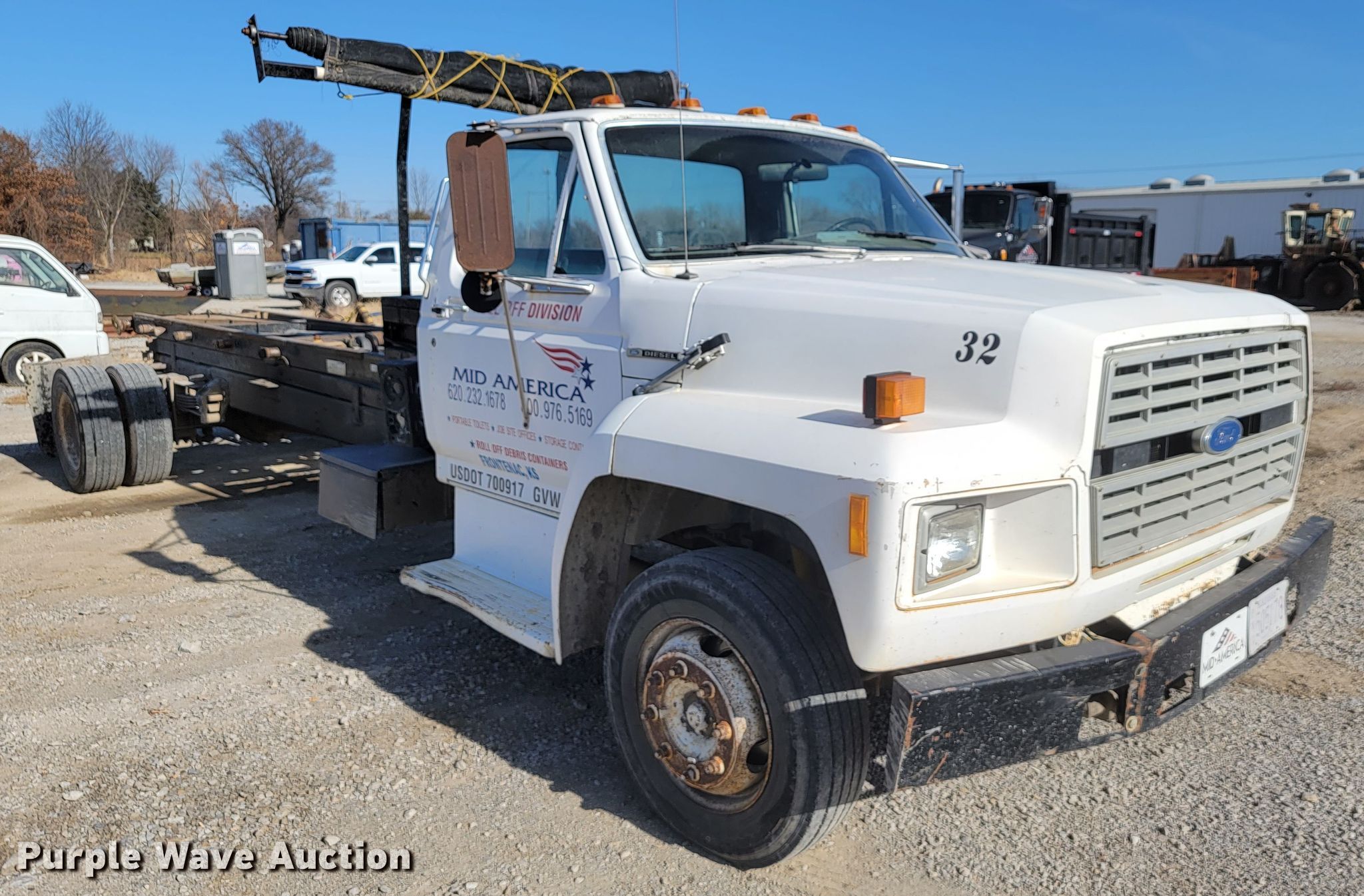 1993 Ford F700 truck chassis. Miles: 336,230 on odometer, VIN: 1FDNK72C8PVA27231. Engine Cylinders: 6, Fuel type: Diesel. Transmission Automatic. Chassis Axles: Single, Suspension: Spring, Brakes: Air, PTO, GVWR: 23,900 lbs, Wheelbase: 238". Interior Heat. Tires Size: 245/70R19.5. Notes Roll-off system not included, will be removed prior to auction. Kansas title. Vehicle has an E-Title in the State of Kansas. A paper title will be distributed to the buyer within 30 days from verification of funds. Mid-America Roofing. 1035 N Hwy 69. Frontenac, KS 66763