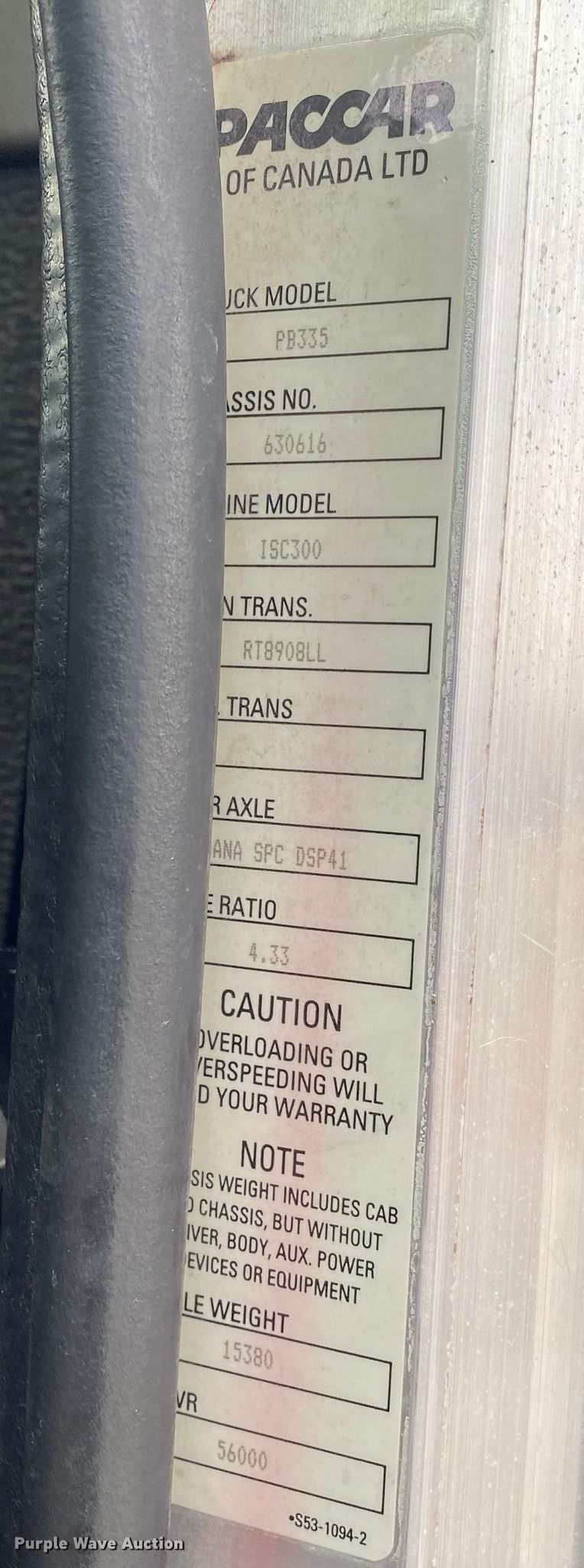 2006 Peterbilt 335 dump truck. Miles: 106,368 on odometer, Hours: 6,534 on meter, VIN: 2NPLLZ9X26M630616. Engine Cummins ISC300, Displacement: 8.3L, Cylinders: 6, Fuel type: Diesel. Transmission Manual. Chassis Double frame, Axles: Tandem, Differential lock: Full, Suspension: Walking beam, Brakes: Air, PTO, GVWR: 56,000 lbs FAWR: 16,000 lbs, IAWR: 20,000 lbs, RAWR: 20,000 lbs. Interior AC, Heat, Cruise control. Operational Dump bed Warren, Inc. MAF651HD-16, 16' L x 96' W, Side height: 52", Side board height: 9", Bed type: Steel, Roll tarp, Ram: Single , End gate: Air operated. Tires Size: 11R22.5. Notes Windshield chipped or cracked. Oklahoma title. 15600 N 145th E Ave. Collinsville, OK 74021