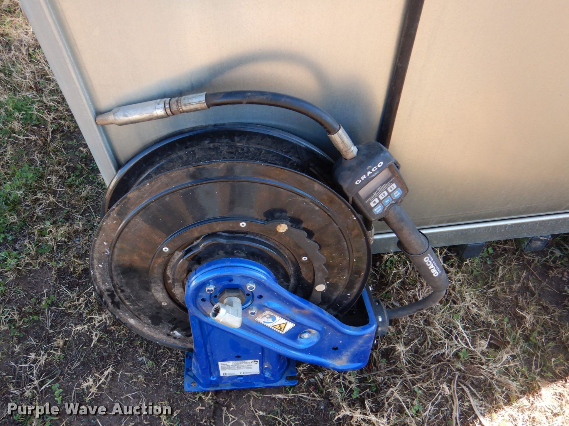 Purple Wave is selling a used Fuel and Lube in Oklahoma. This item is a 2018 Roth oil tank with the following: Serial: 0851805506917, 62" x 30" x 68.5", Capacity: 400 gallons, Fire-Ball 300 pneumatic pump, Graco nozzle