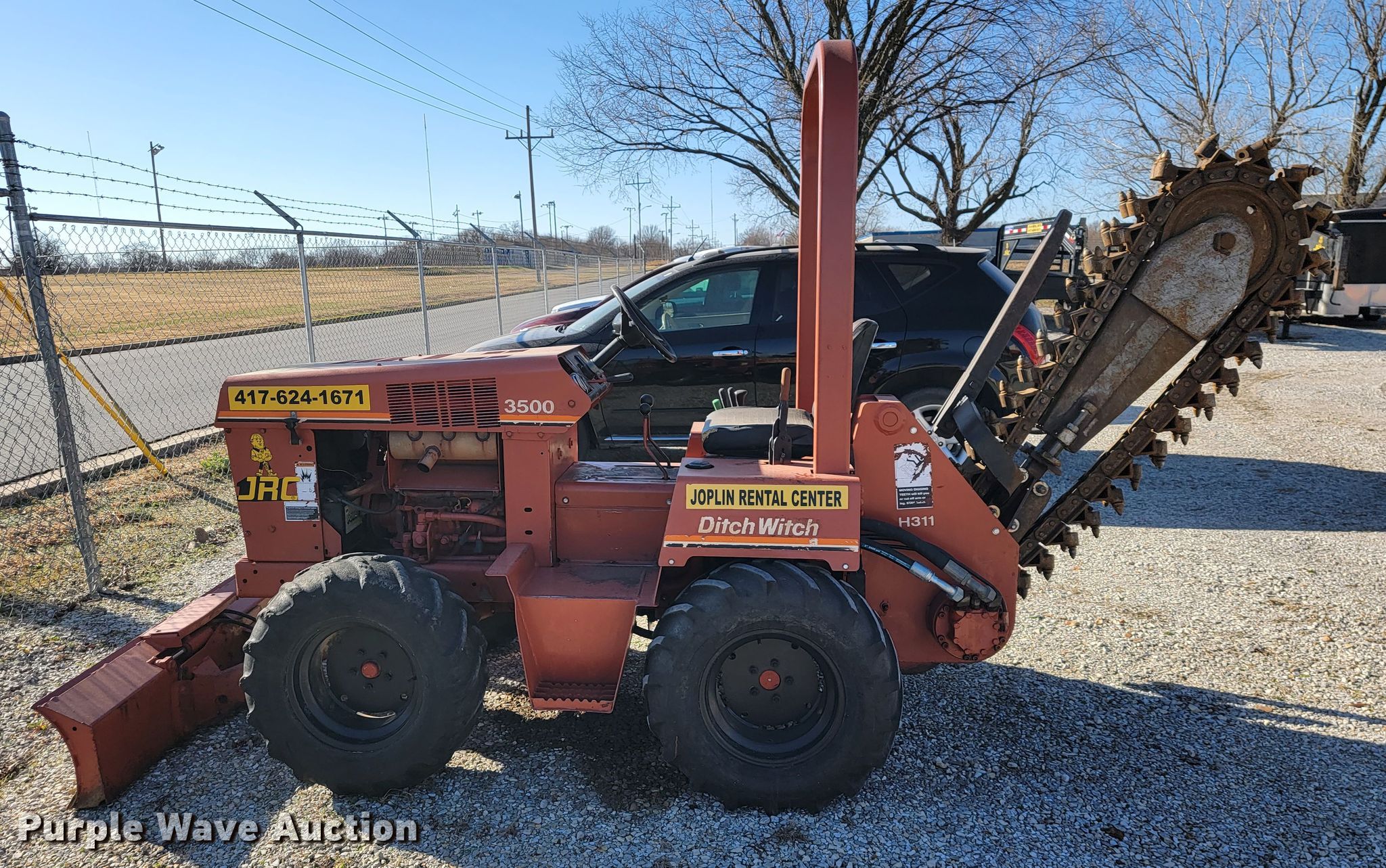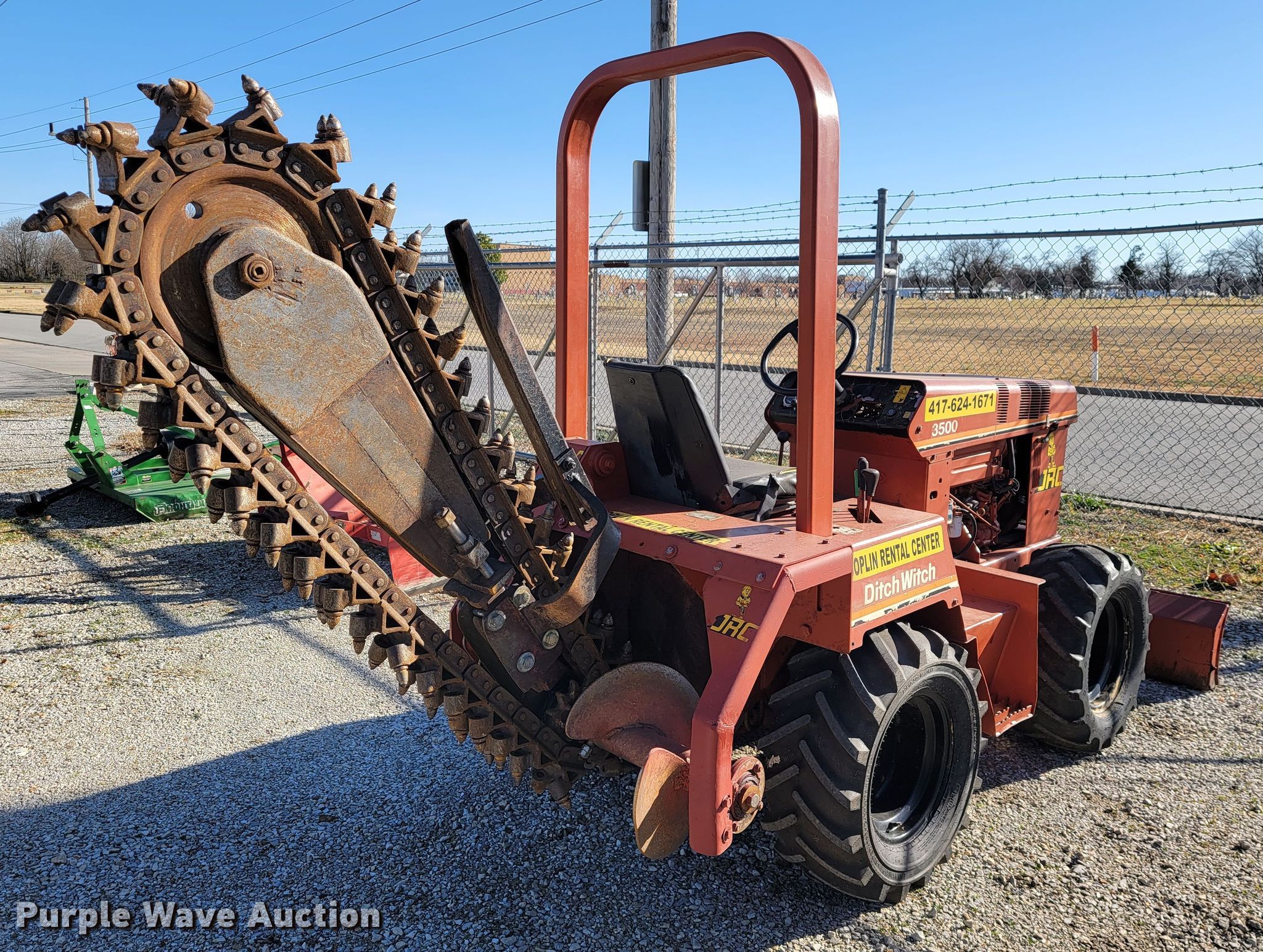 1997 Ditch Witch 3500 trencher. Hours: 1,468 on meter, Serial: 3P0066. Engine Cylinders: 3, Fuel type: Diesel. Transmission Hydrostatic, Four wheel drive. Operators station OROPS. Operational Trencher Estimated dig depth: 48", Cutting width: 5", Teeth: Rock, Backfill blade Width: 64". Tires Size: 29x12.50-15. Joplin Rental Center, LLC - Open inspection Jan. 13, 14. 1617 W 10th St. Joplin, MO 64801