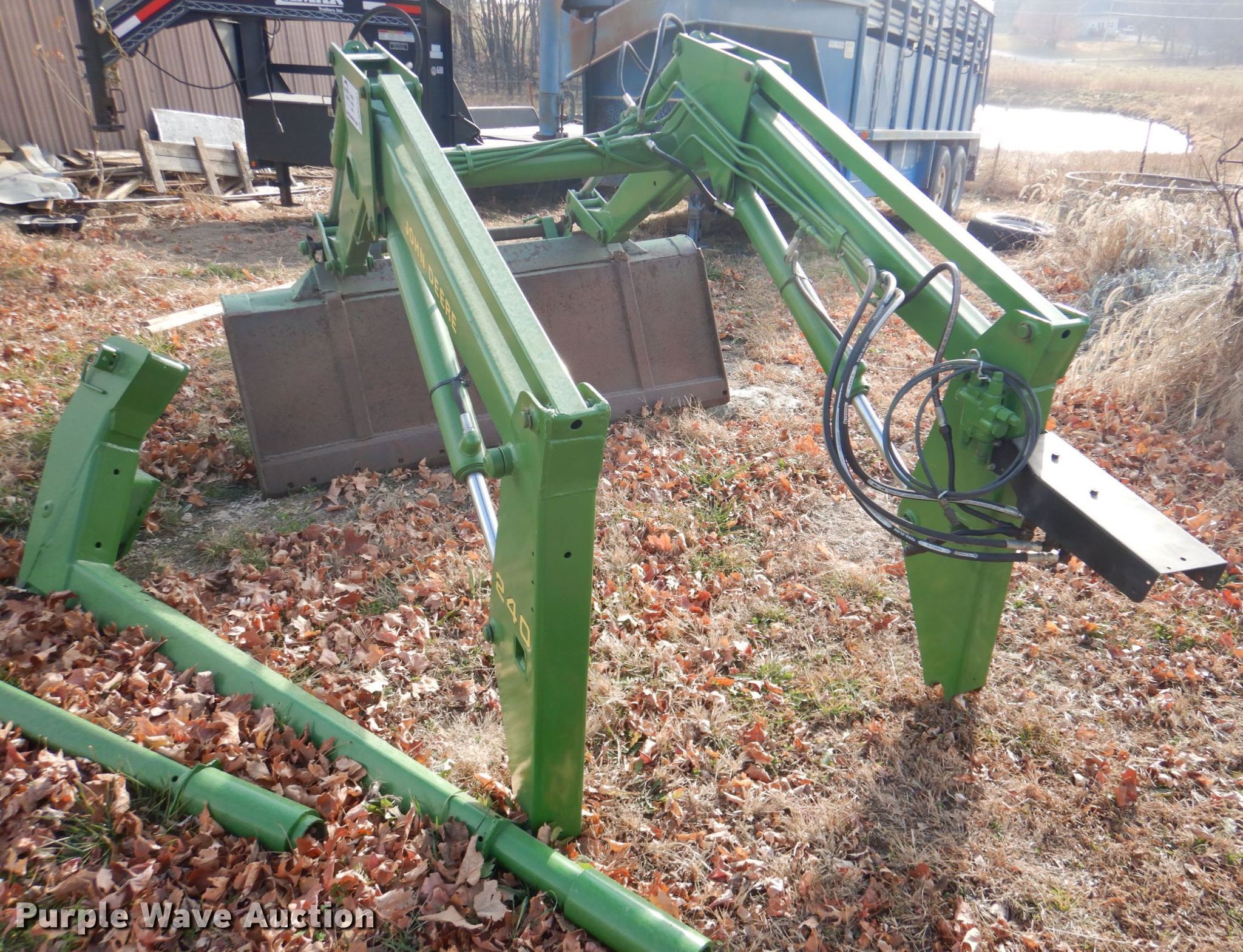 Purple Wave is selling a used Ag Tractor Loader or Attach. in Kansas. This item is a John Deere 240 loader with the following: Self-leveling, Bucket, Width: 74", Mounting brackets