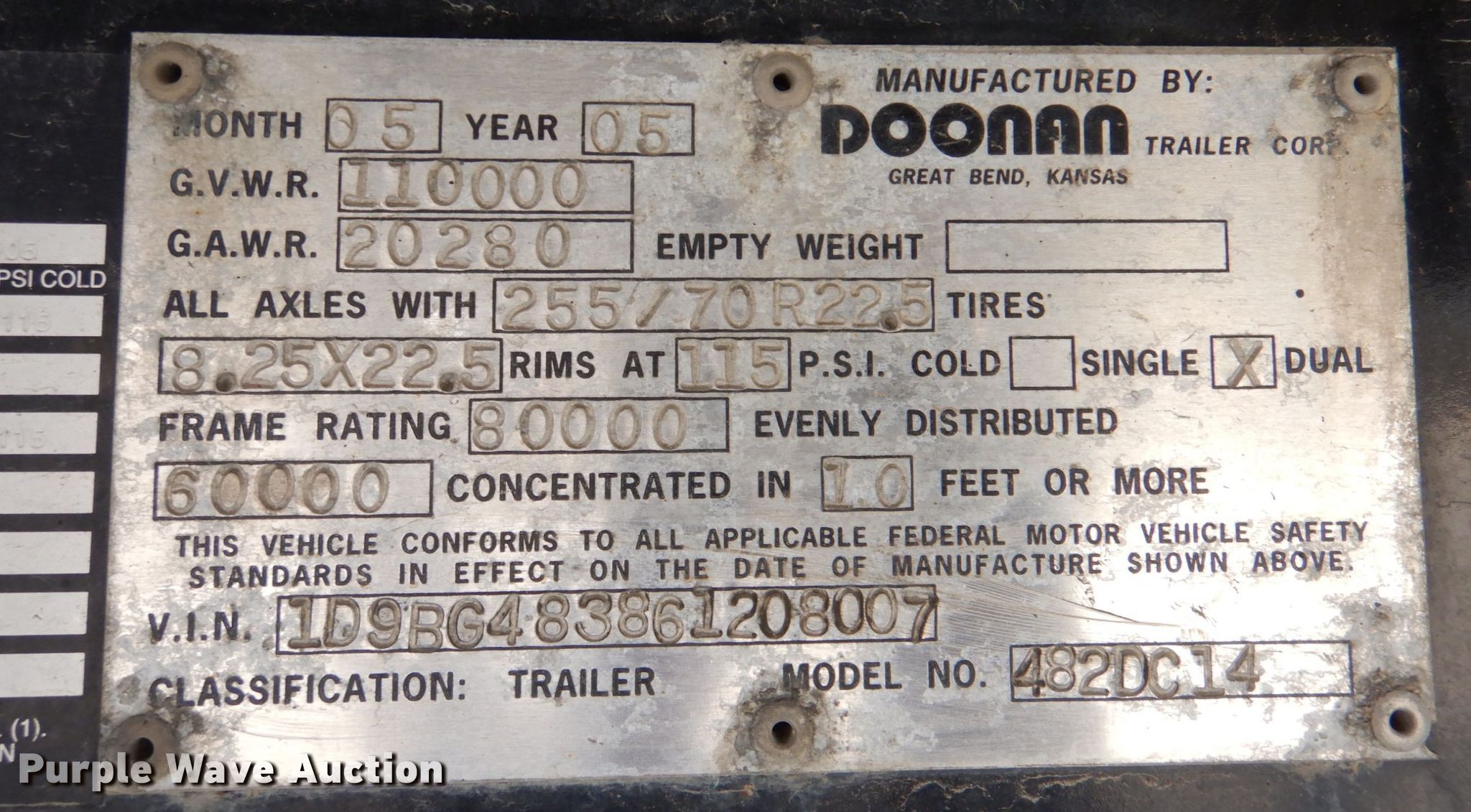 2006 Doonan 482DC14 drop deck trailer. VIN: 1D9BG483861208007, Unit #: 27. Dimensions Overall: 48' L x 102" W, Deck: 38' L x 102" W, Top deck length: 10'. Operational Deck type: Wood. Chassis Landing gear: Dual, Suspension: Air, Brakes: Air, Axles: Triple, GVWR: 110,000 lbs, GAWR: 20,280 lbs. Tires Aluminum wheels, Size: 255/70R22.5. Kansas title. Title distribution may be delayed up to 14 days from verification of funds. Lynn's Heavy Hauling. 22780 College Blvd. Olathe, KS 66061