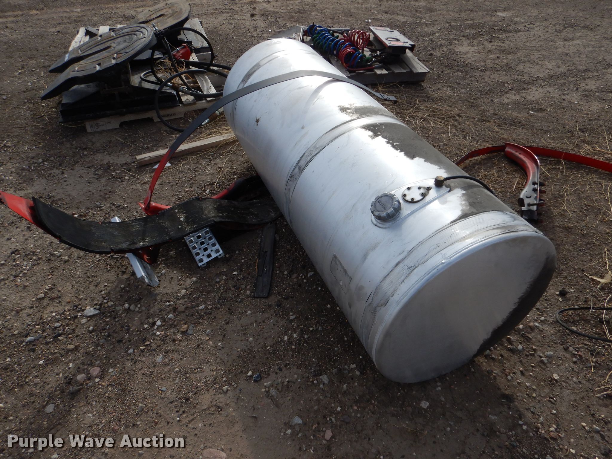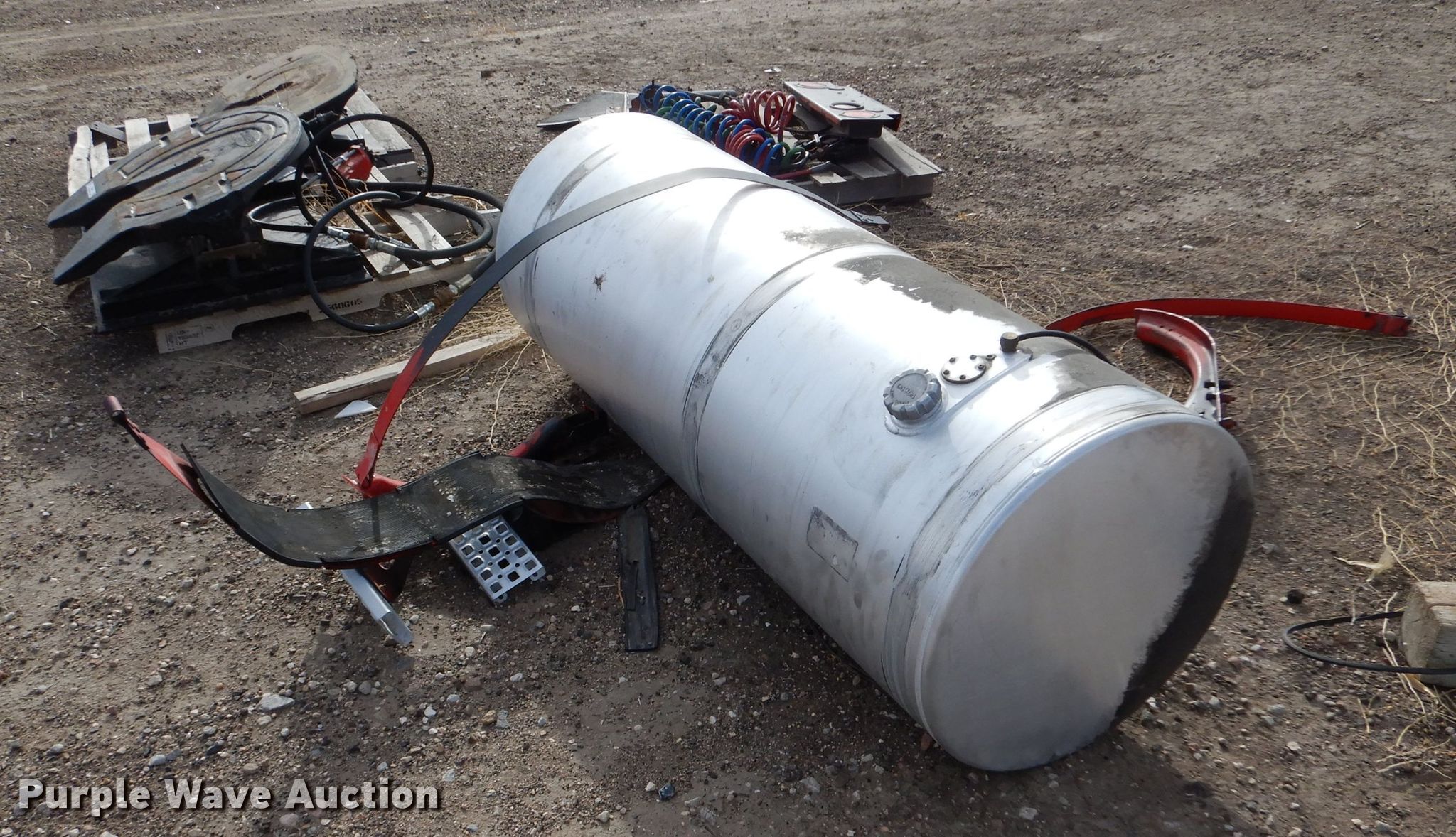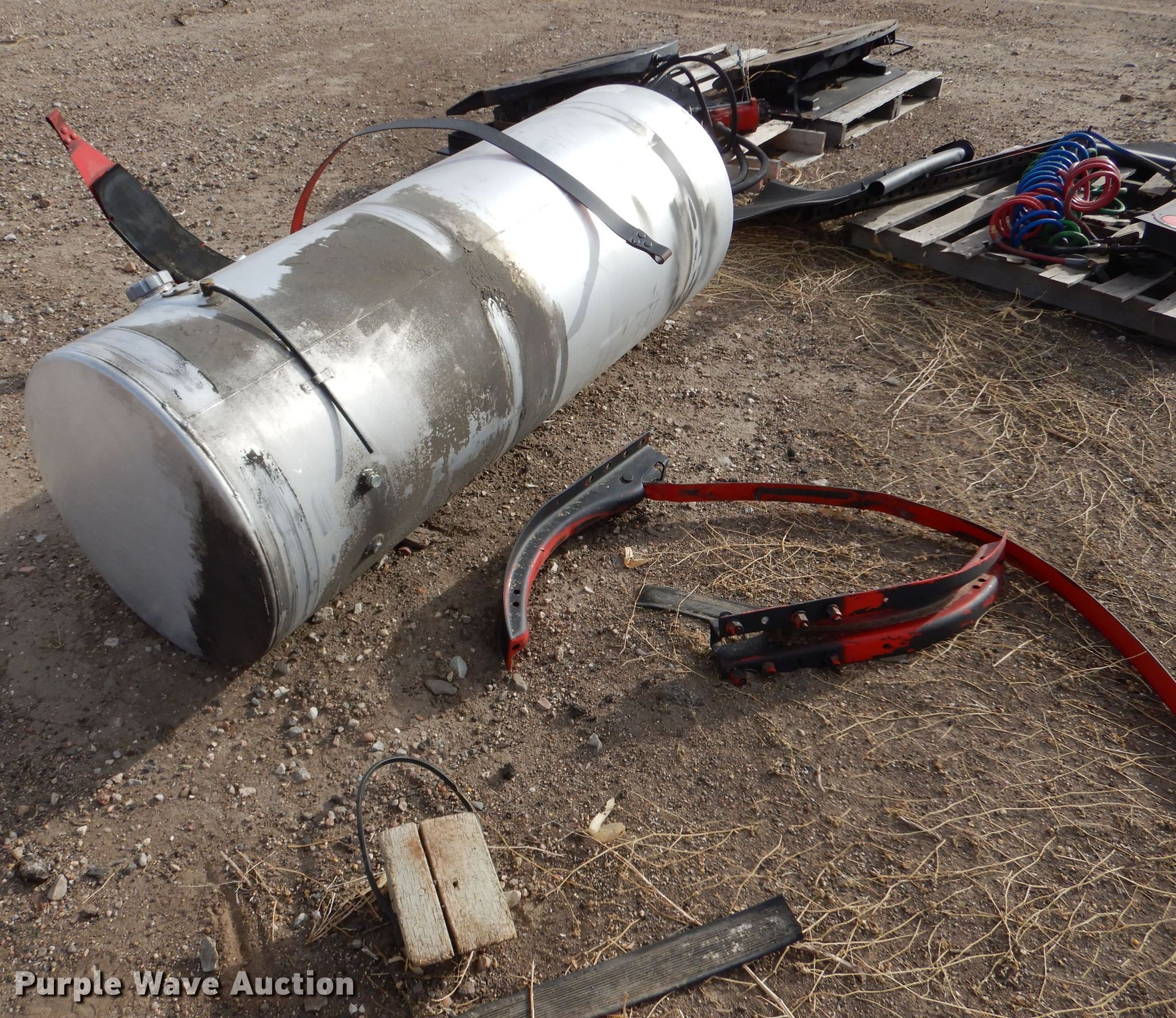 Purple Wave is selling a used Truck Part and Attach. in Kansas. This item is a Truck parts with the following: 69"L x 26" diameter fuel tank, (2) Holland fifth wheel plates, Mudflaps, Bracket, Air and electric service lines