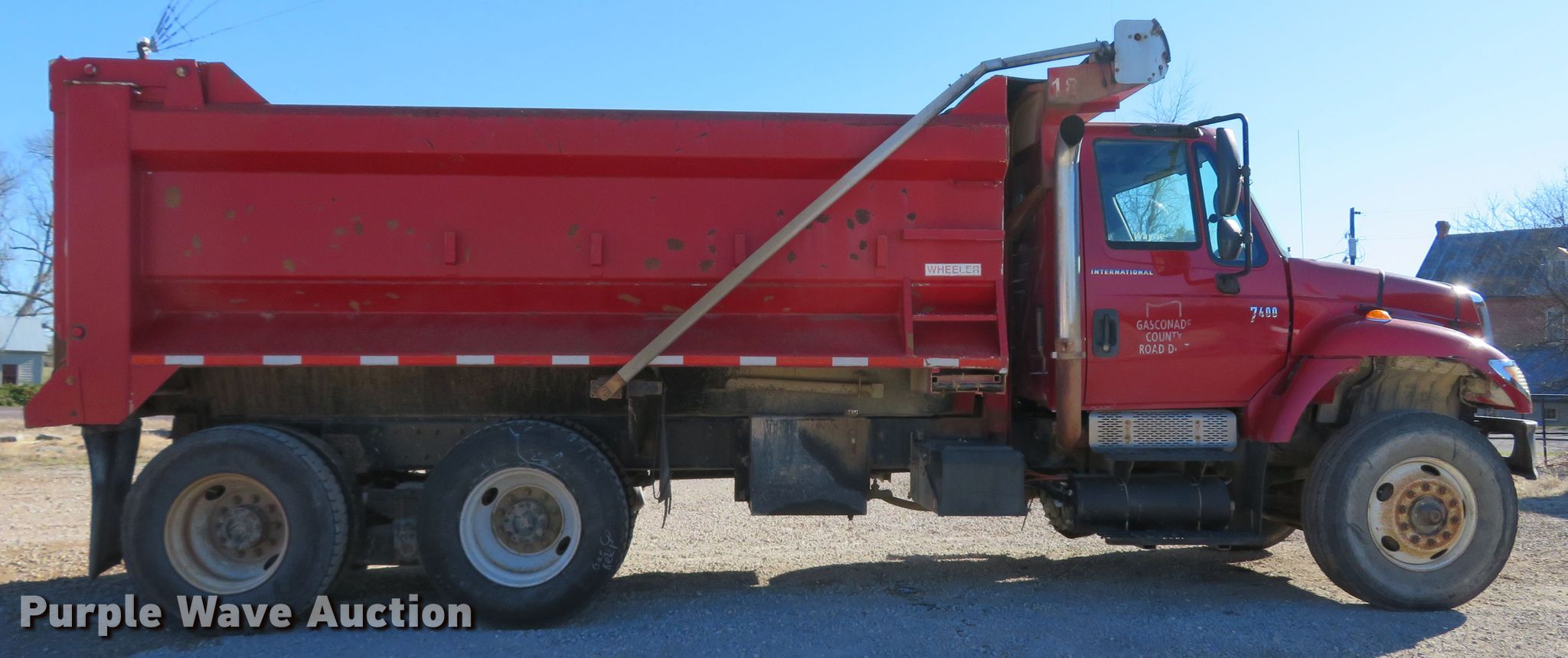 2005 International 7400 dump truck. Miles: 291,284 on odometer, VIN: 1HTWHAZT15J038380. Engine International HT570, Displacement: 9.3L, Cylinders: 6, Fuel type: Diesel, HP: 310, Engine brake. Transmission Allison, Automatic. Chassis Double frame, Axles: Tandem, Differential lock: Inter-axle, Suspension: Spring over walking beam, Brakes: Air, PTO, GVWR: 56,000 lbs FAWR: 16,000 lbs, IAWR: 20,000 lbs, RAWR: 20,000 lbs, Wheelbase: 209". Interior AC, Heat, Heated mirrors, Cruise control. Operational Dump bed Wheeler, 15' L x 97" W, Side height: 48", Bed type: Steel, Barrel, Bed vibrator, Roll tarp, Ram: Single , End gate: Air operated. Tires Front: 315/80R22.5, Rear: 11R22.5. Notes Dash warning indicator: ABS, Engine issues, Non-operational AC, condenser missing, Non-operational roll tarp motor, Unit must bed towed or hauled. Missouri title. Gasconade County, MO. Owensville, MO 65066