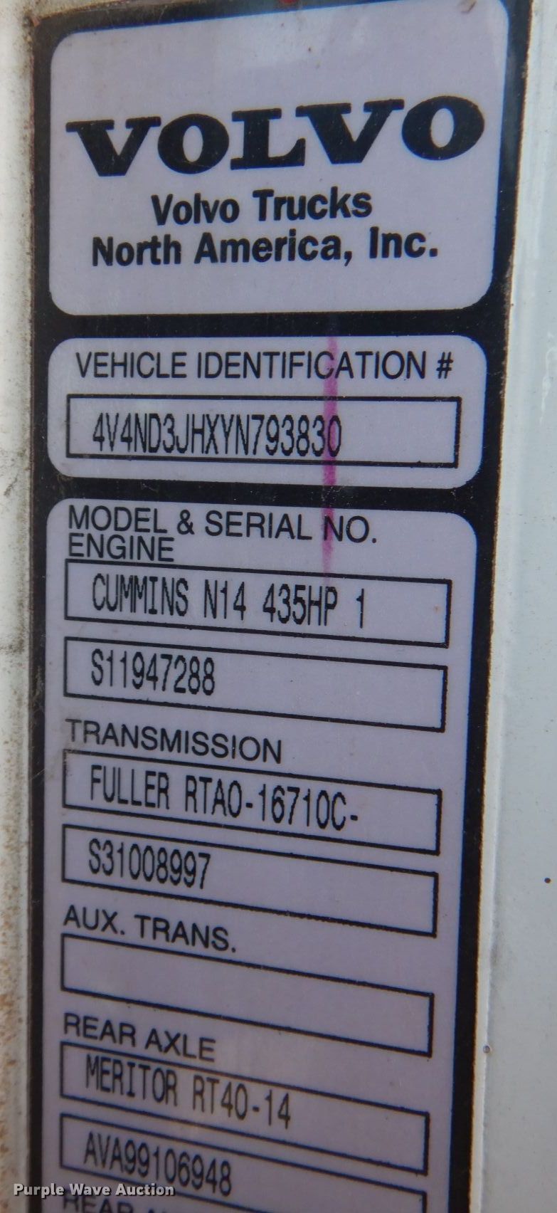 2000 Volvo VN water truck. Miles: 28,546 on odometer, VIN: 4V4ND3JHXYN793830. Engine Cummins N14, Displacement: 14.0L, Cylinders: 6, Fuel type: Diesel. Transmission Automatic. Chassis Axles: Tandem, Suspension: Air, Brakes: Air, PTO, GVWR: 50,350 lbs. Interior AC, Heat, Heated mirrors. Operational Bed / tank 16' L x 8' W, Spray bar: Rear, Rear outlet: 3". Tires Size: 295/75R22.5. Notes Dash warning indicator: ABS, Traction Control. Oklahoma rebuilt salvage title. Garvin County. 1275 6th St. Maysville, OK 73057