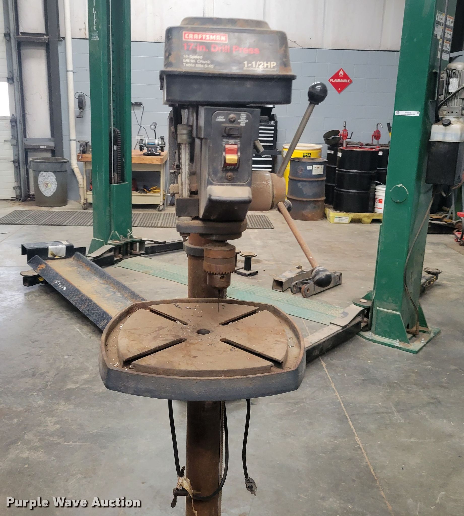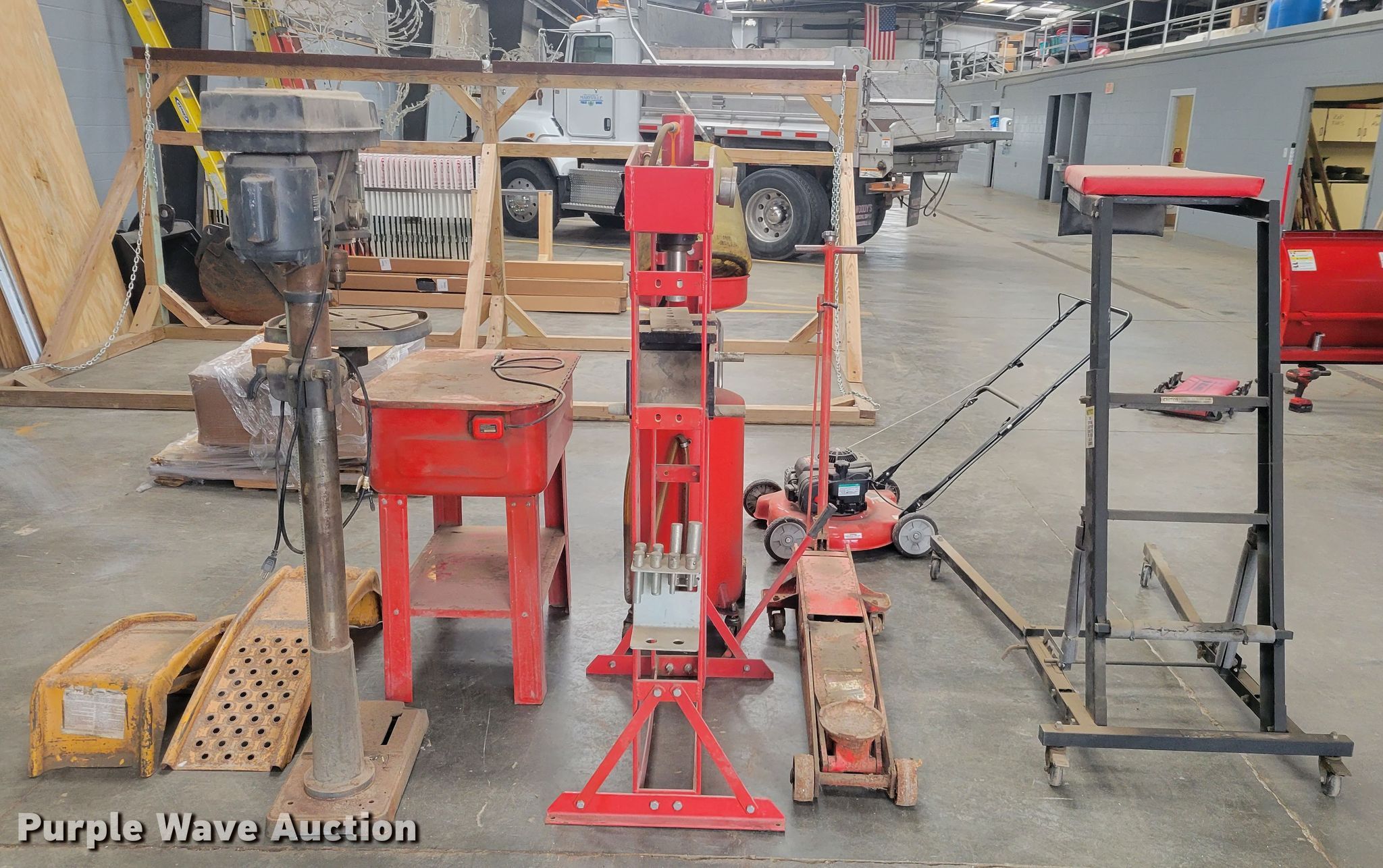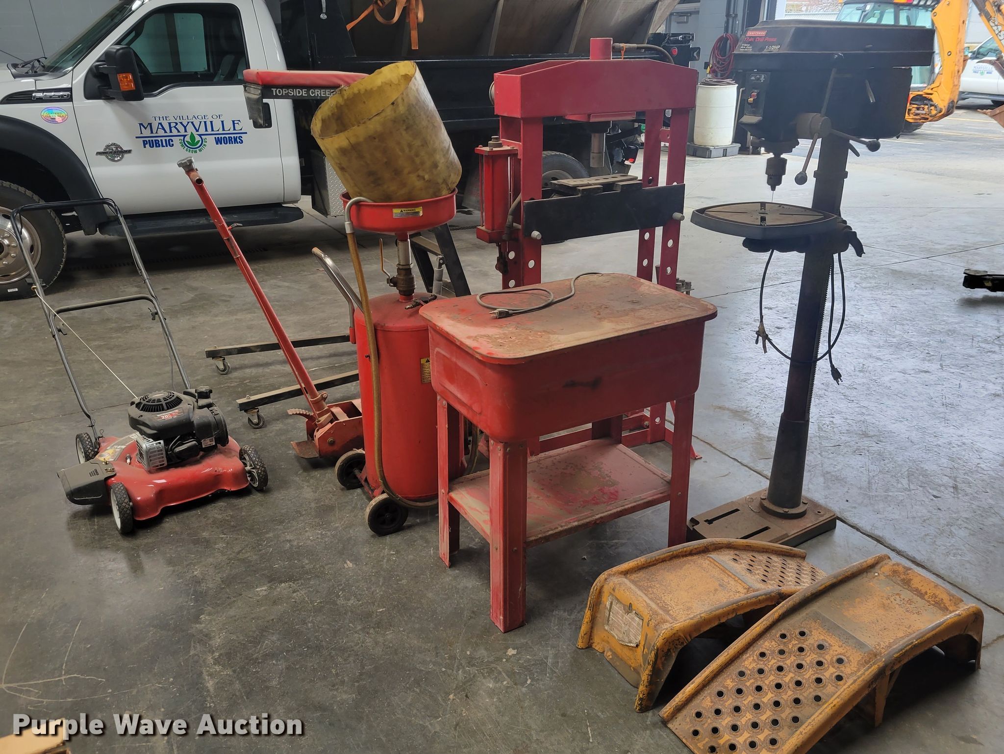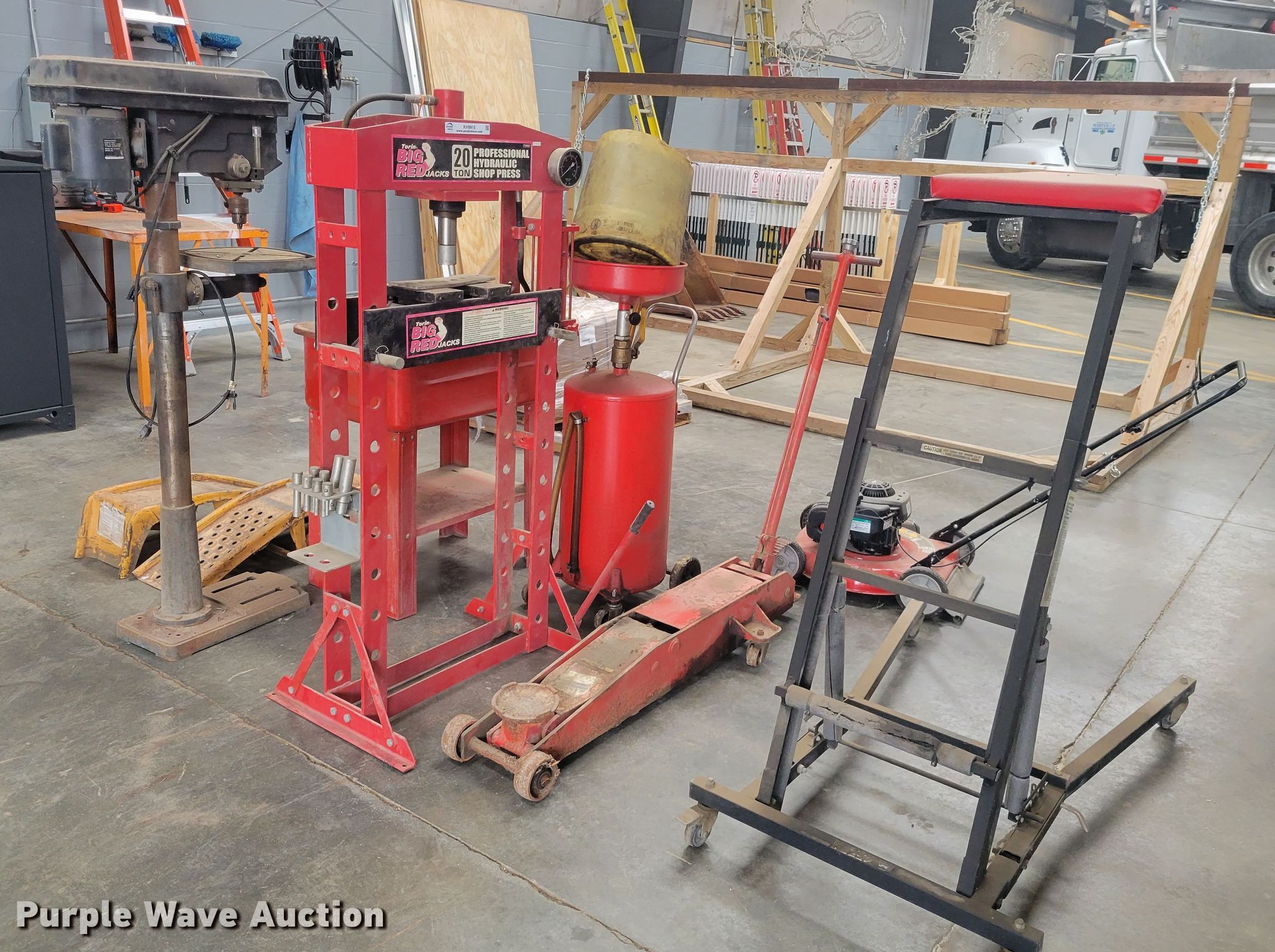 Purple Wave is selling a used Tools in Illinois. This item is a Tools with the following: 20 ton hydraulic press, Craftsman 17" drill press, Ramps, Oil drain tank, Parts washer, Five ton floor jack, Topside creeper
