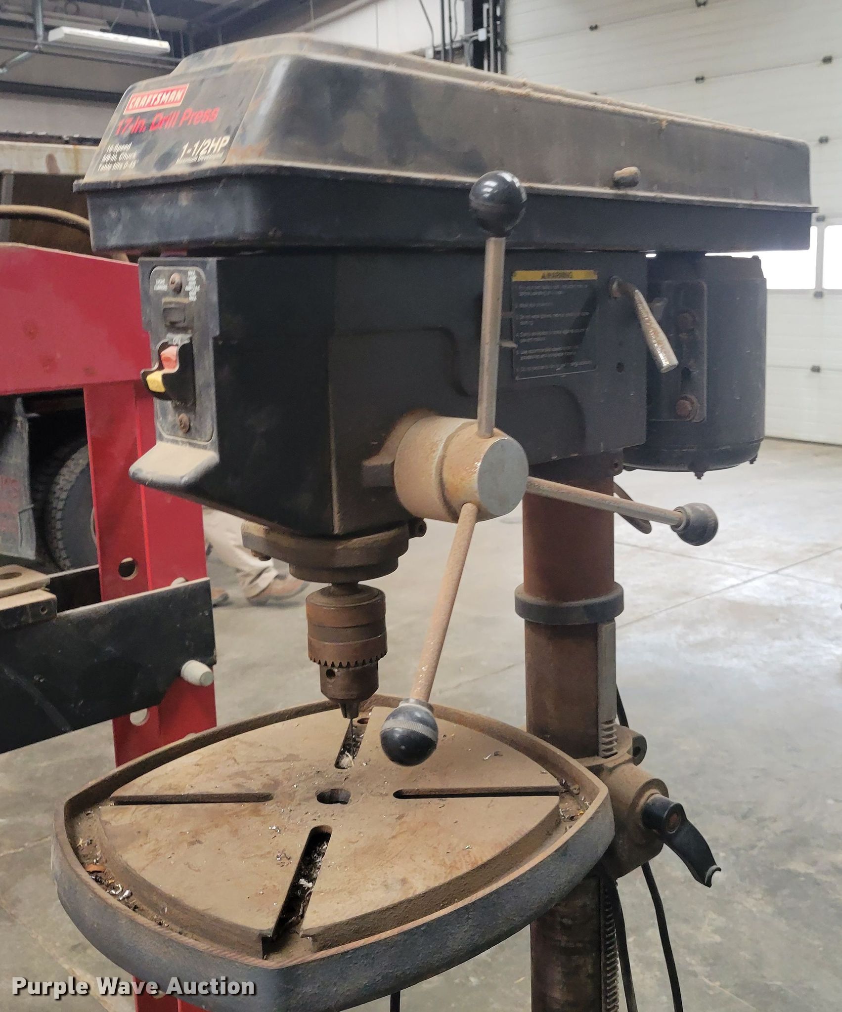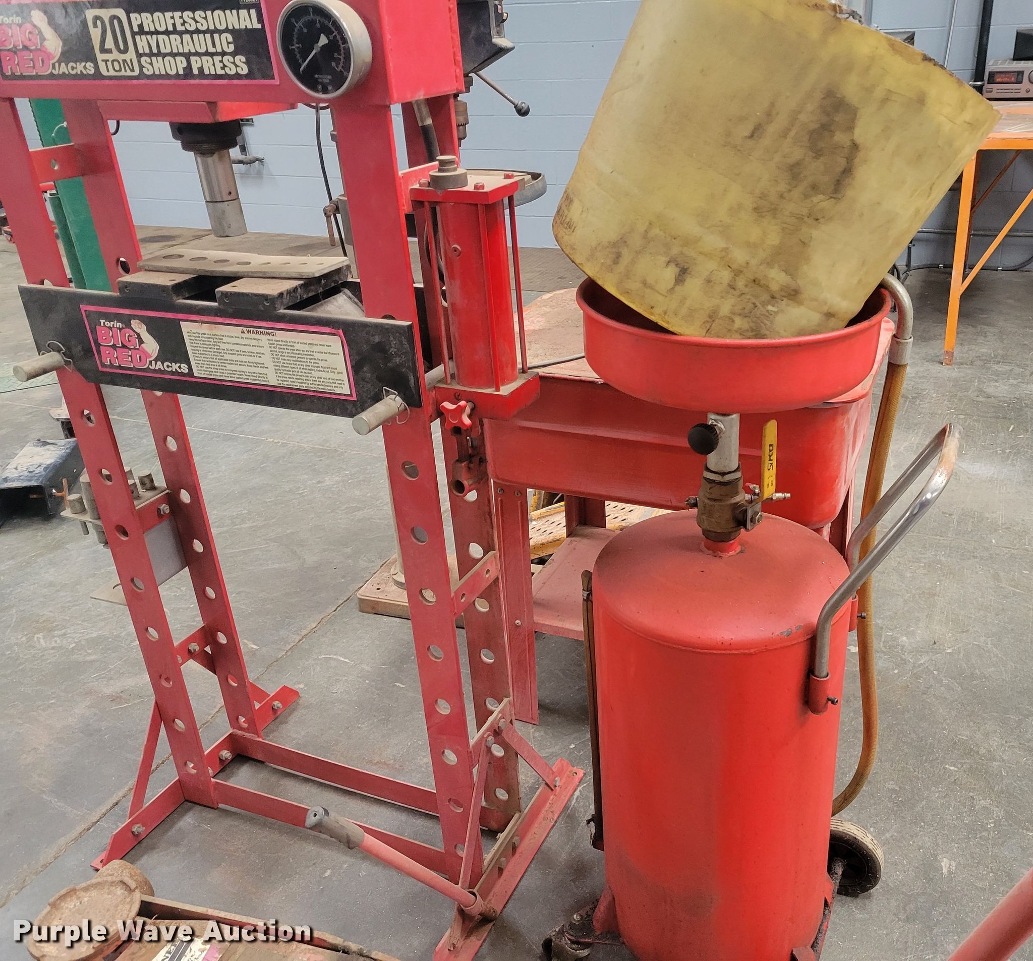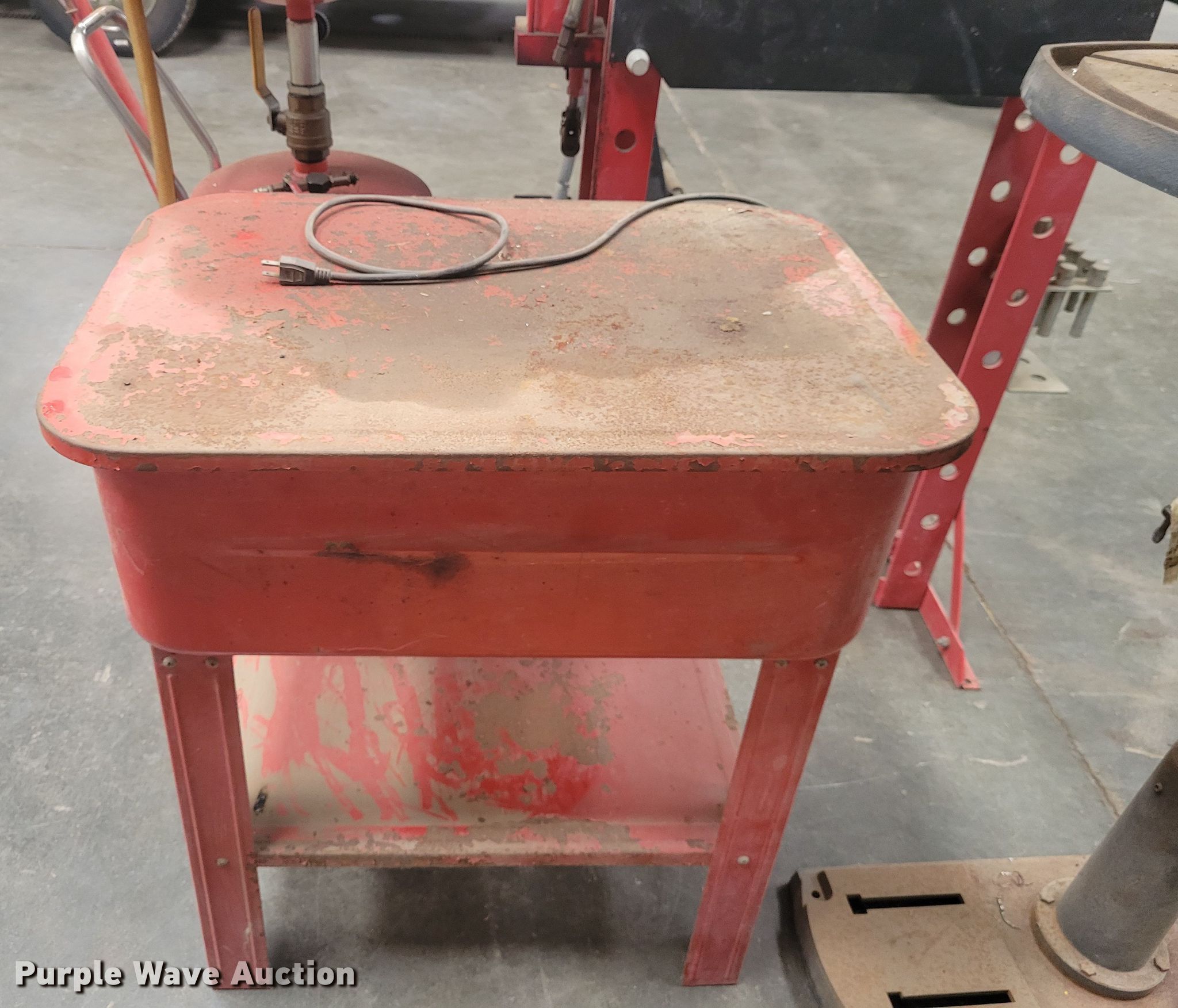 Purple Wave is selling a used Tools in Illinois. This item is a Tools with the following: 20 ton hydraulic press, Craftsman 17" drill press, Ramps, Oil drain tank, Parts washer, Five ton floor jack, Topside creeper