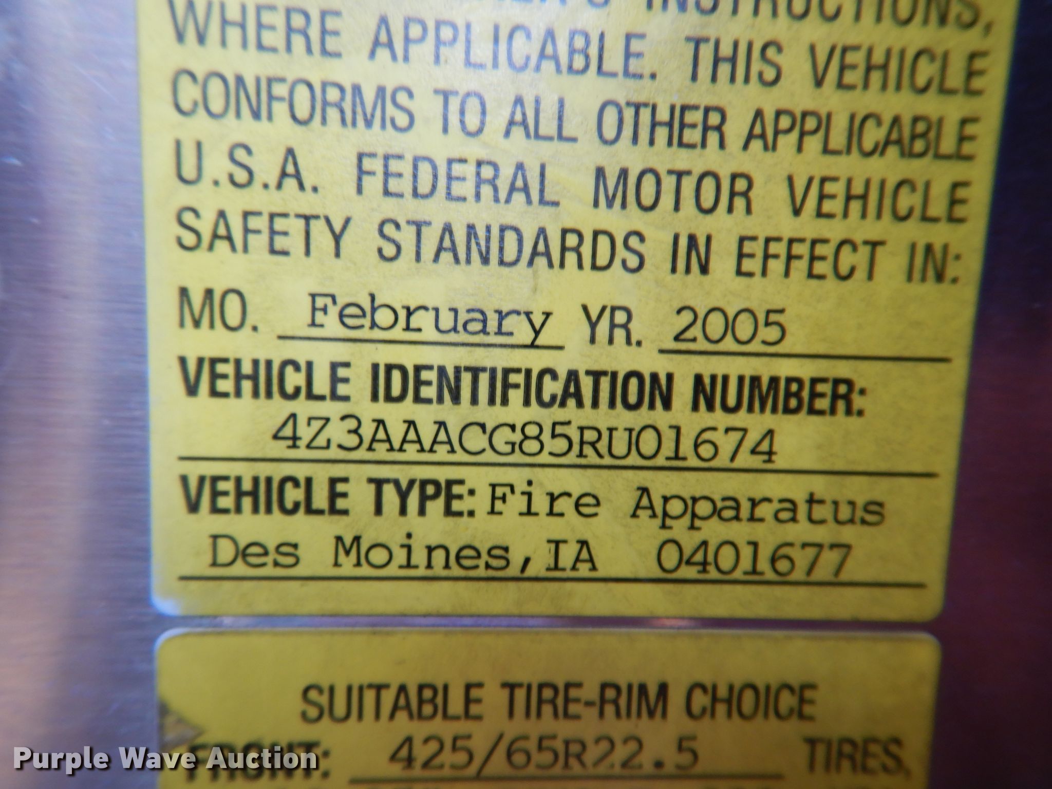 Purple Wave is selling a used Fire Truck or Emergency Vehicle in Iowa. This item is a 2005 American Lafrance L24M-75 aerial platform fire truck with the following: Miles: 102,331 on odometer, Hours: 10,056 on meter, VIN: 4Z3AAACG85RU01674