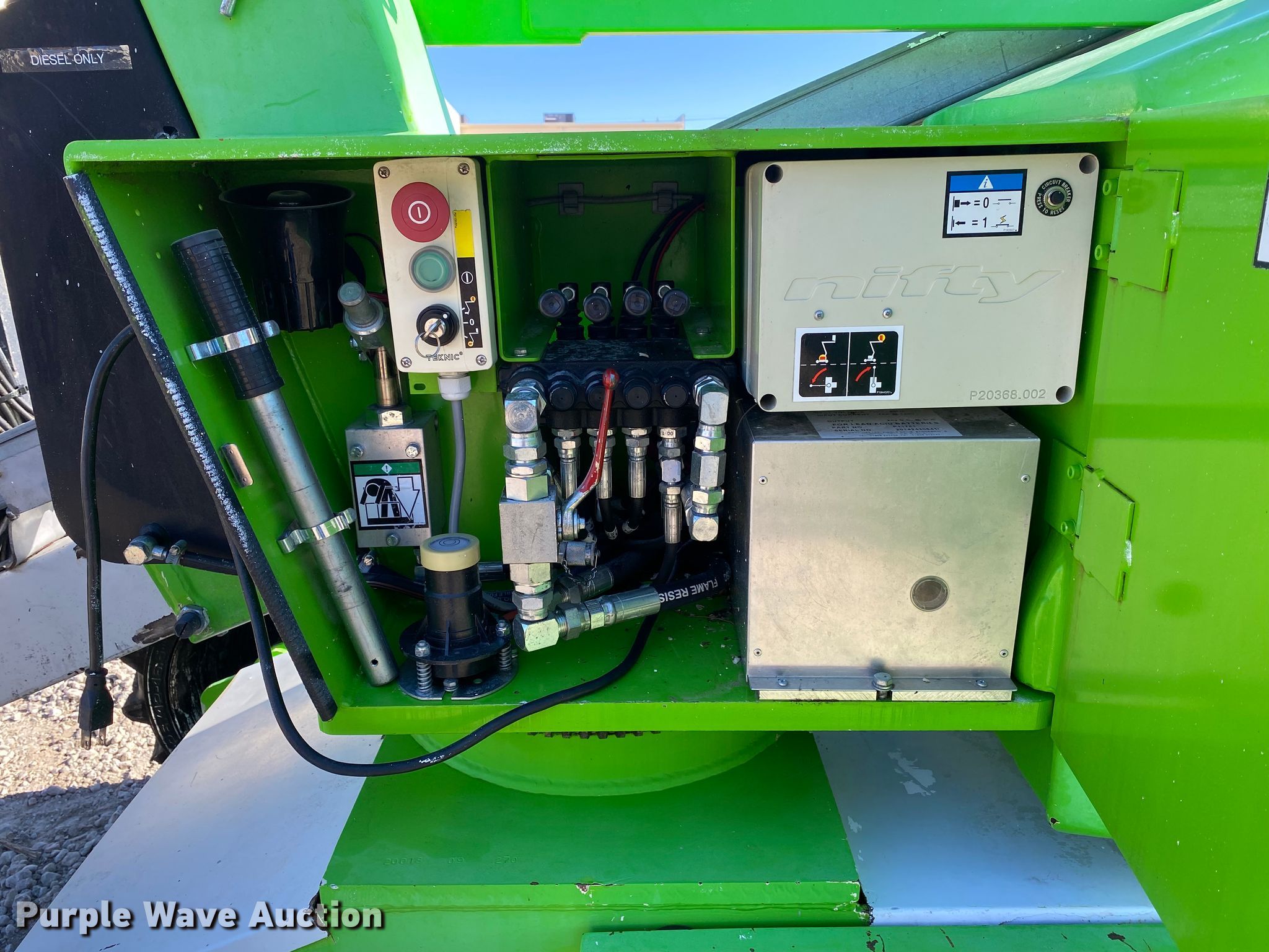 Nifty Lift SP34DE 4WD boom lift. Hours: Unknown, Serial: 12 28268. Engine Fuel type: Diesel. Chassis Four wheel drive. Operational Articulating boom, Maximum lift capacity: 500 lbs, Maximum reach length: 20', Maximum lift height: 34', Platform: 38" L x 26" W, Controls: Platform, Ground, Platform rotation: Hydraulic, Travel speed: 2.2 mph, Safety alarm. Tires Tire size: 26x12-16.5, Solid. Notes Non-operational hour meter. Bloss Sales & Rentals. 5883 S Mingo Rd E. Tulsa, OK 74146