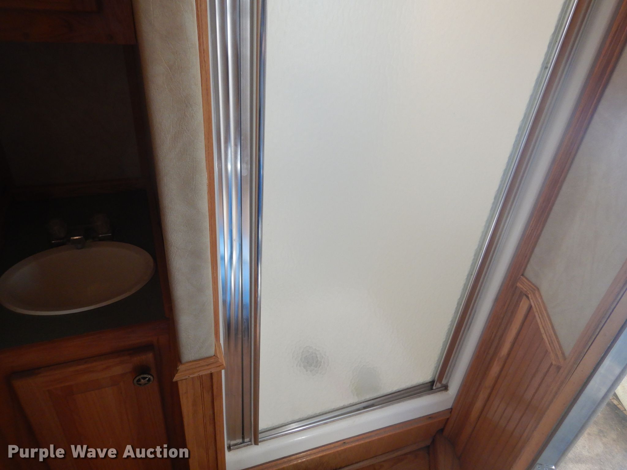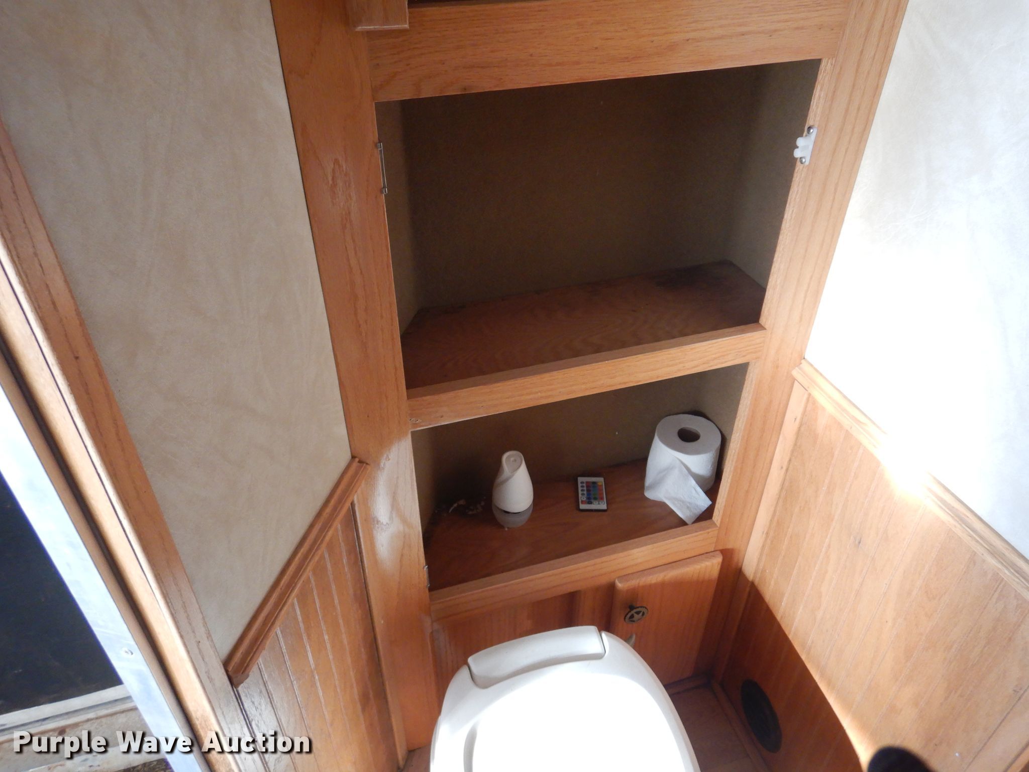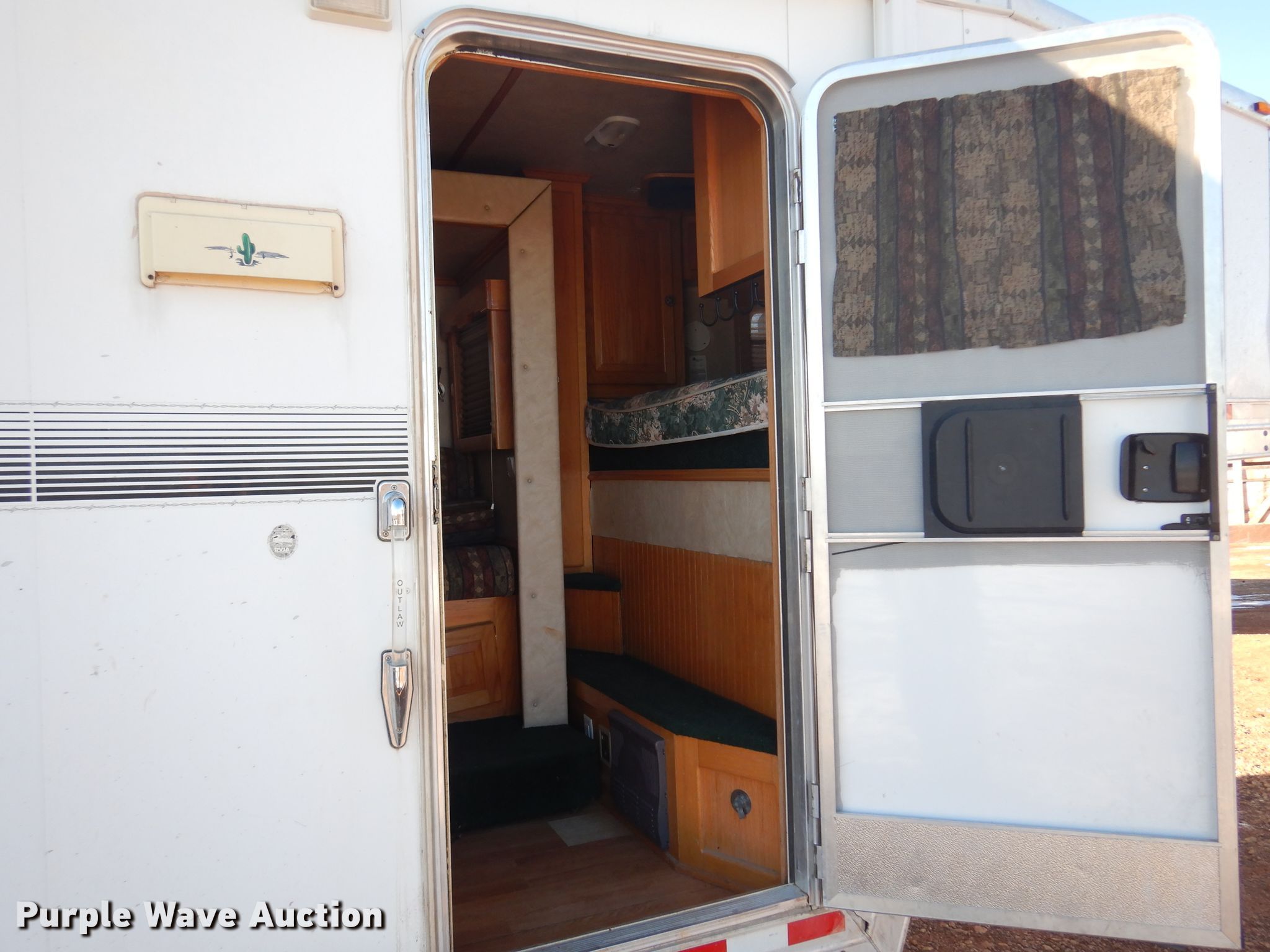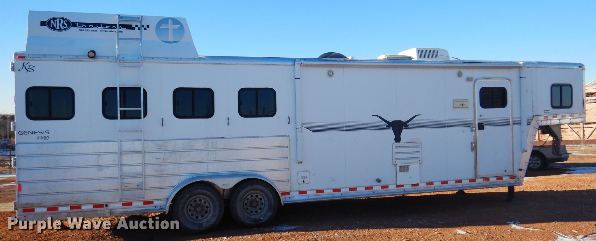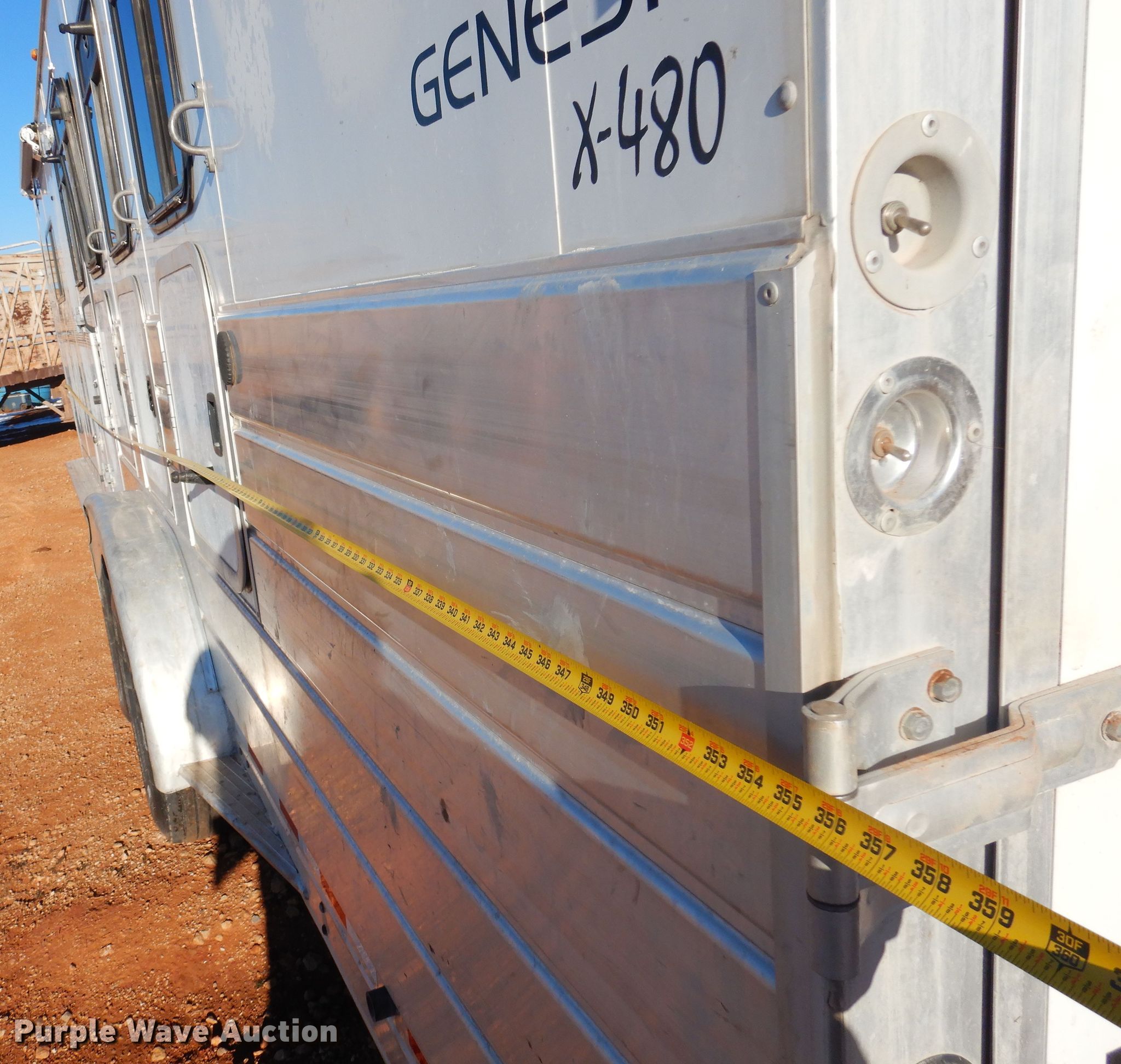 2004 Kiefer Built Genesis X-480 livestock trailer. VIN: 1DVGH28264S046319, Claim# 1-816537. Dimensions Overall: 36' 4" L x 102" W, Body: 29' 8" L x 87" W. Operational Horse capacity: 4, Rubber floor mat, Living quarters Full bath w/ shower, On board Generac generator Hours: 349 on meter. Chassis Hitch: Gooseneck, Landing gear: Dual, Suspension: Spring, Brakes: Electric, Axles: Tandem. Tires Steel wheels, Size: 235/85R16. Notes Welds broken on gooseneck, unit can not be towed, Non-operational unit. Insurance salvage unit.. Oklahoma title. Oklahoma Farm Bureau Insurance. 22012 Fox Dr. Covington, OK 73730