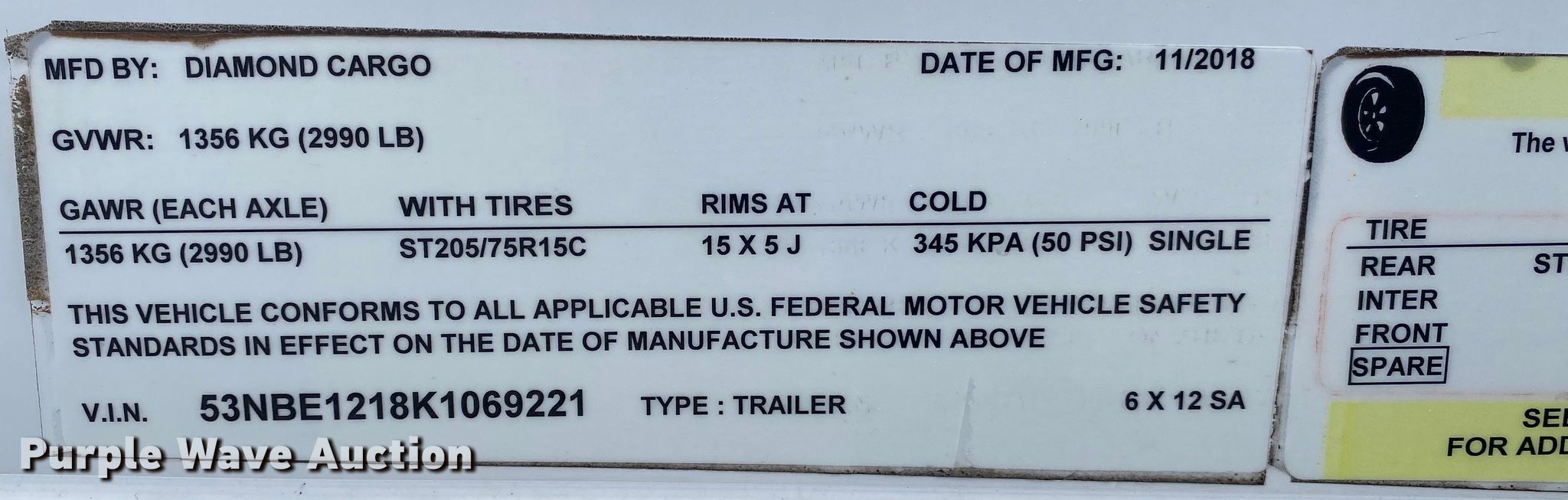 Purple Wave is selling a used Enclosed Cargo Trailer in Oklahoma. This item is a 2019 Diamond enclosed cargo trailer with the following: VIN: 53NBE1218K1069221