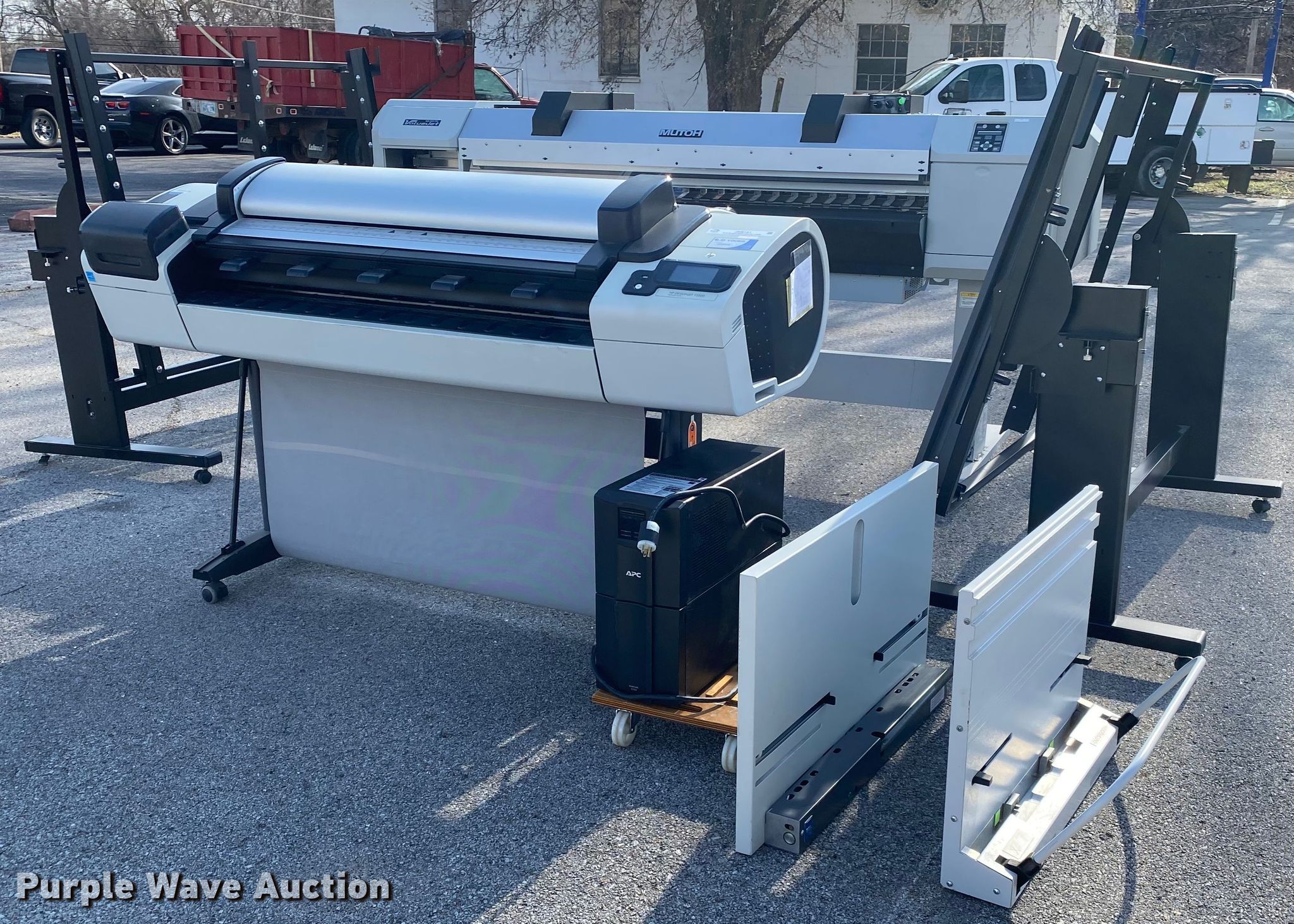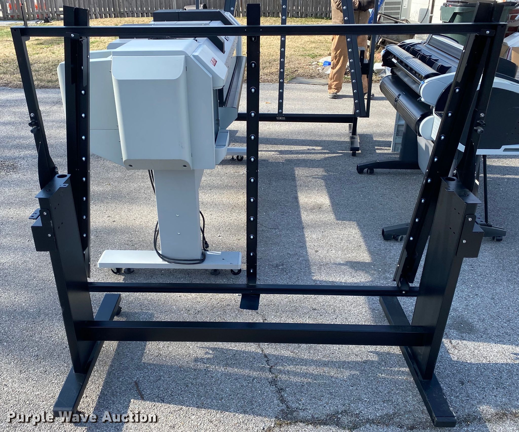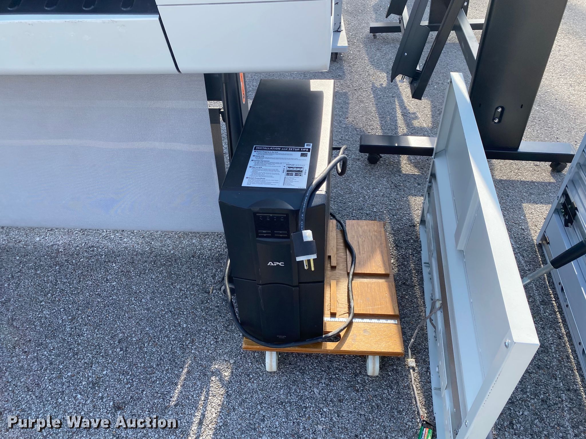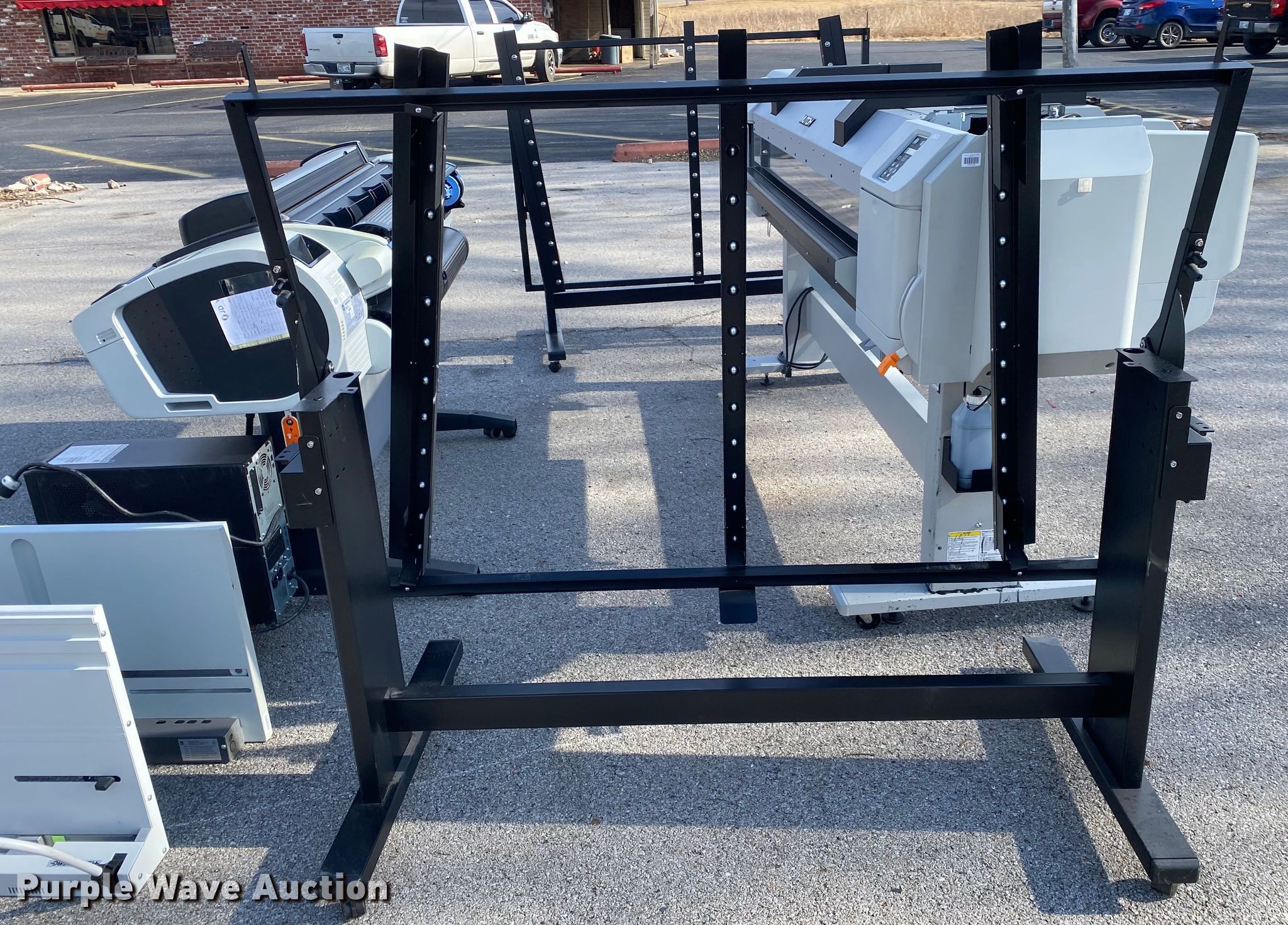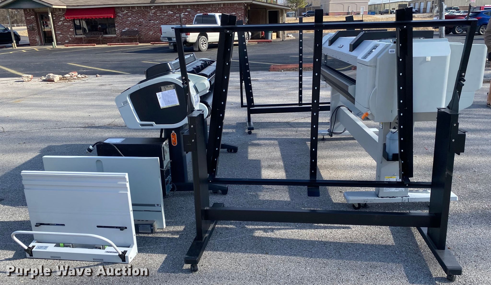 Purple Wave is selling a used Office Supplies and Equip. in Oklahoma. This item is a Office equipment with the following: HP Designjet T2300, Mutoh VJ-617H, (2) stands, (2) shelves, APC battery backup