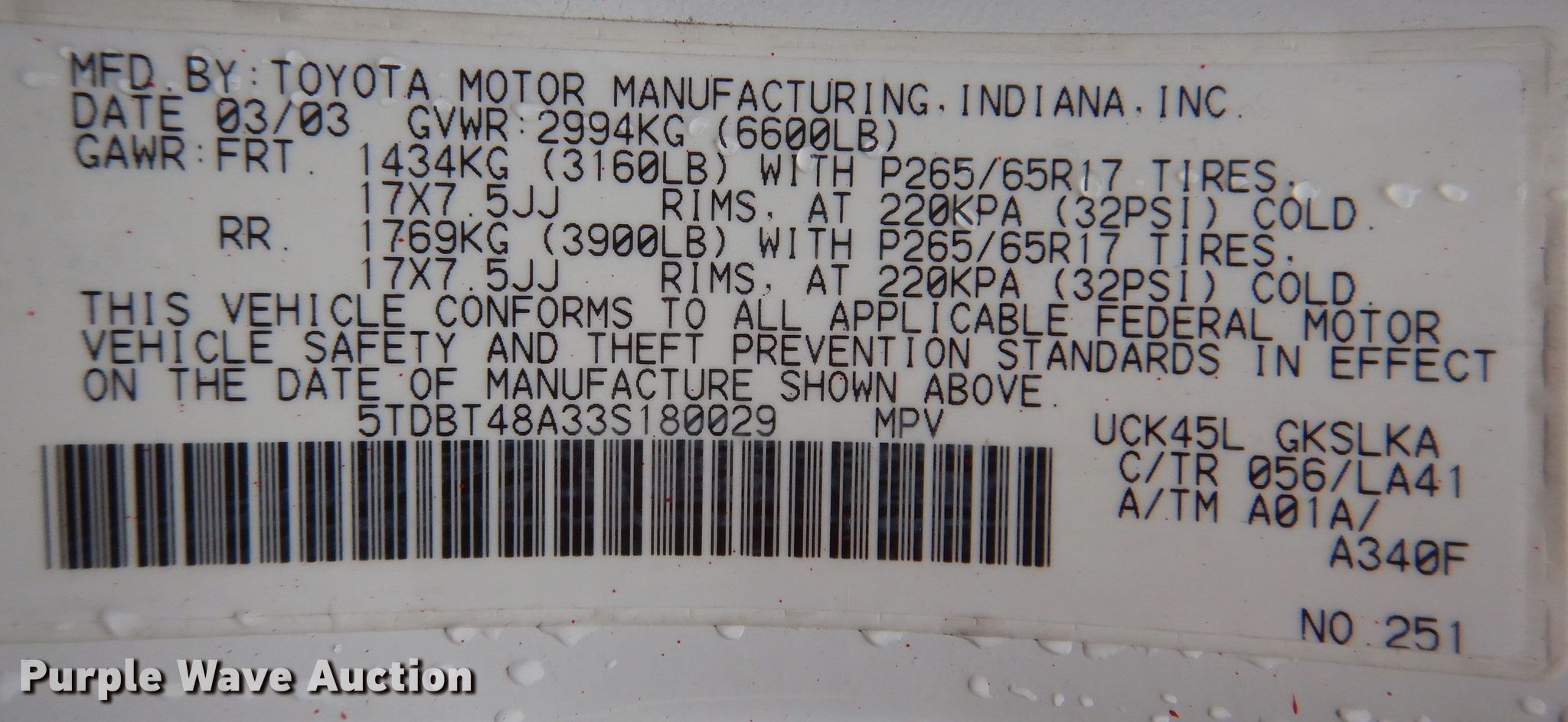 Purple Wave is selling a used Passenger Vehicle in Iowa. This item is a 2003 Toyota Sequoia SUV with the following: Miles: 255,868 on odometer, VIN: 5TDBT48A33S180029