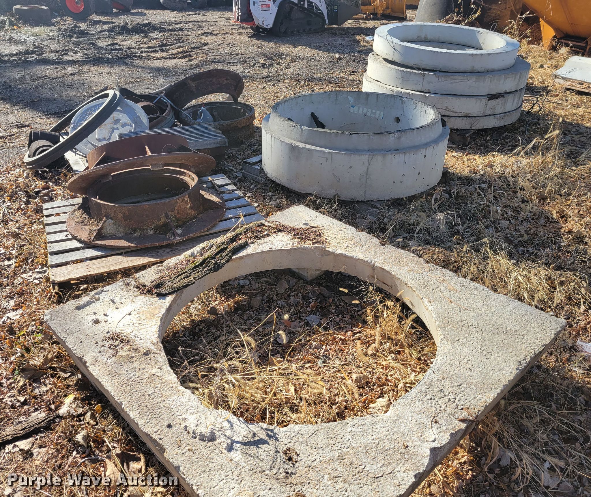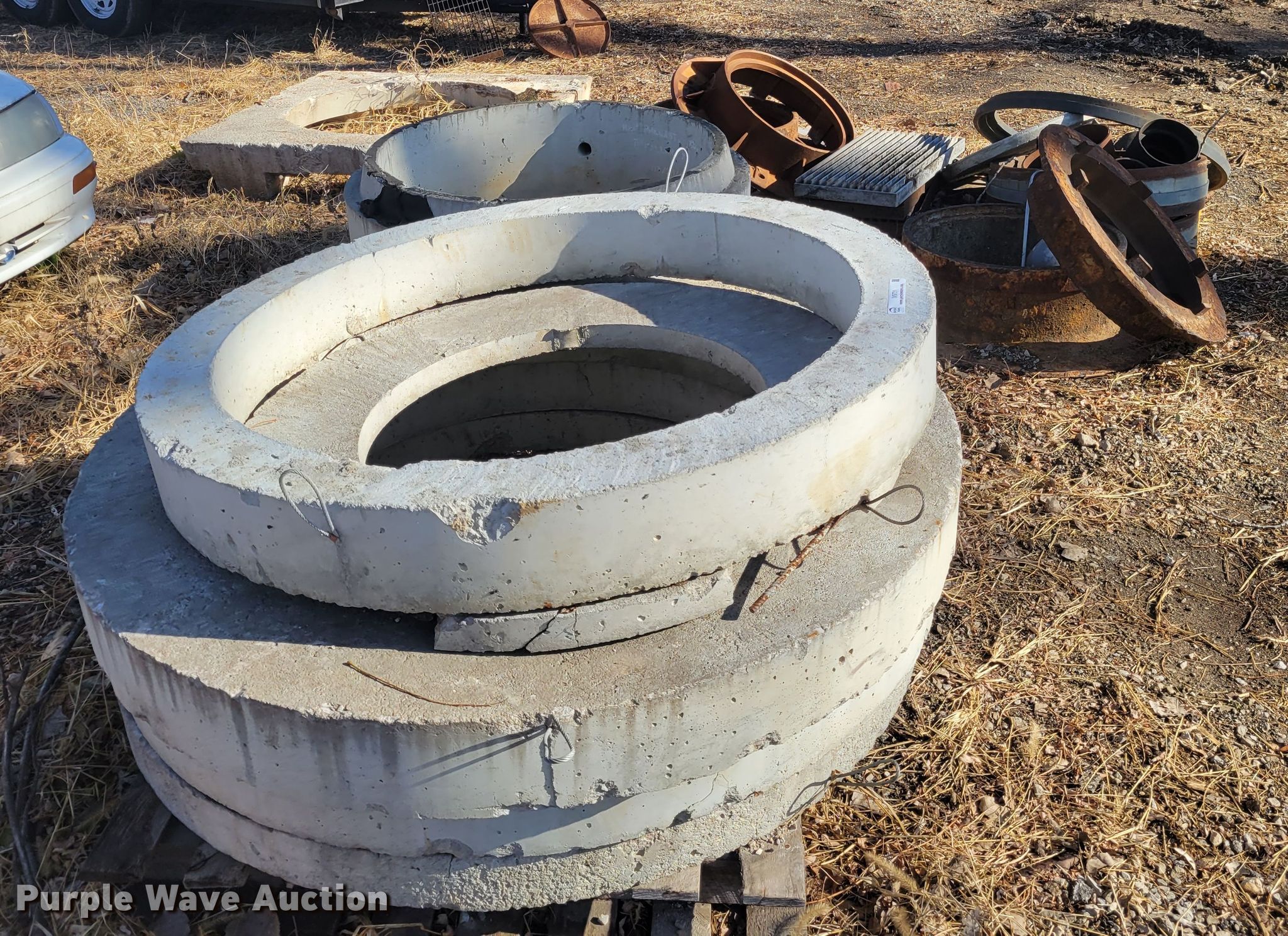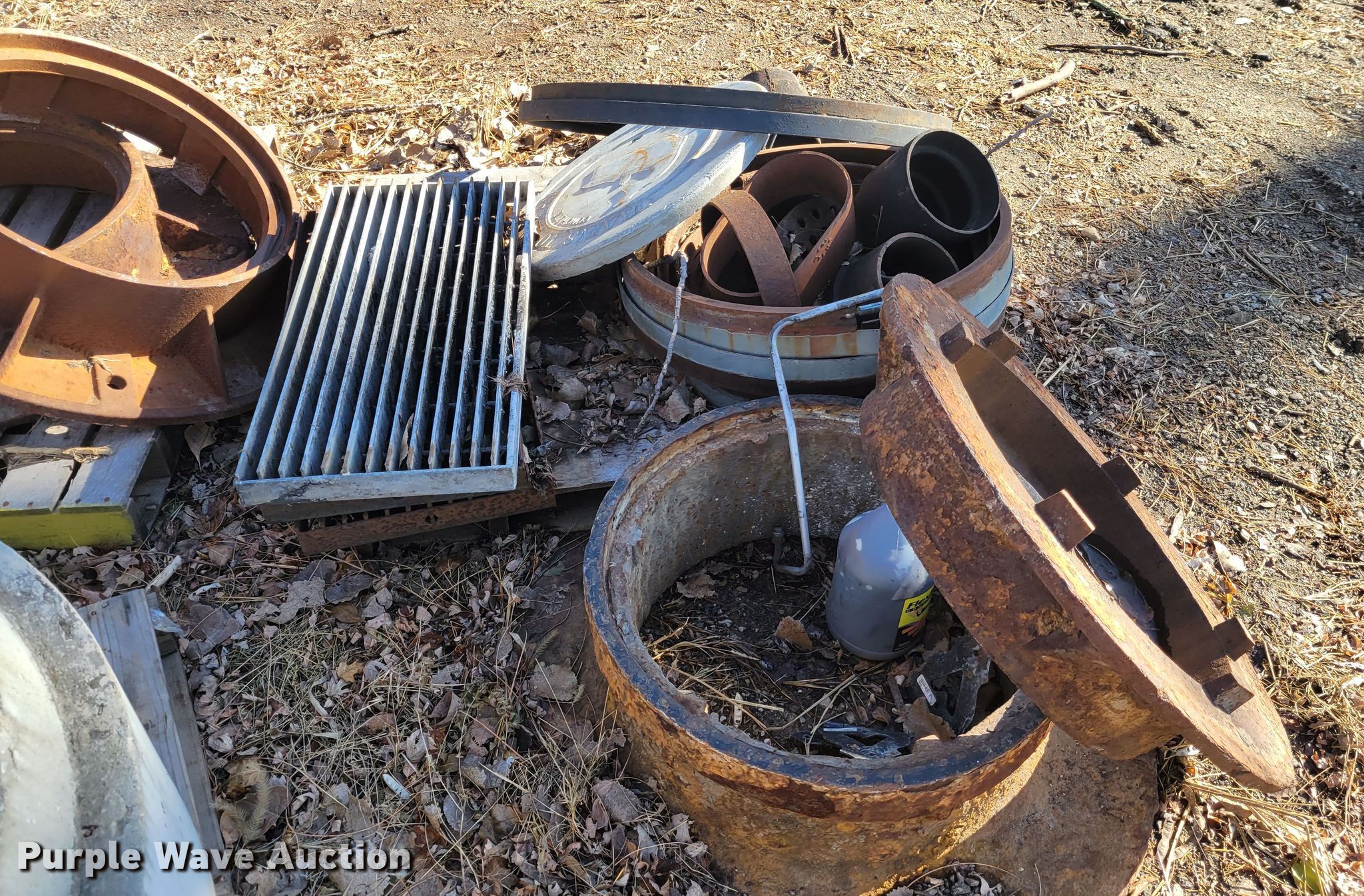 Purple Wave is selling a used Building Materials in Missouri. This item is a Sewer supplies with the following: Concrete man hole inserts, Metal man hole inserts, Metal grates