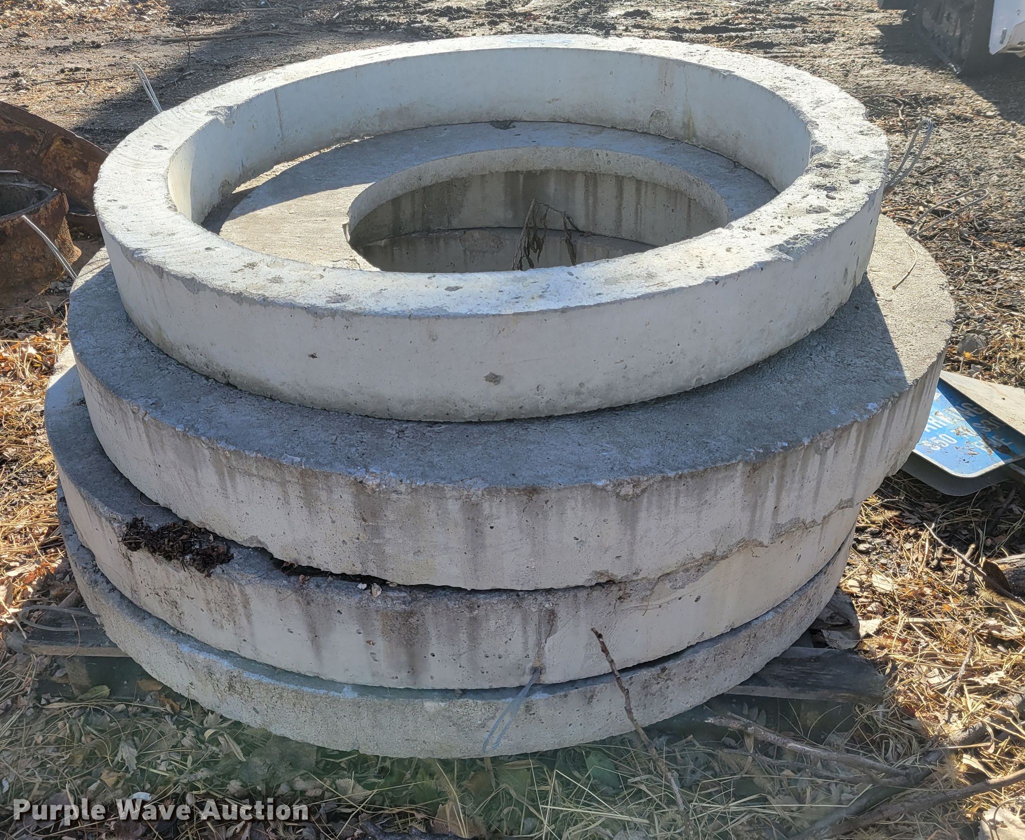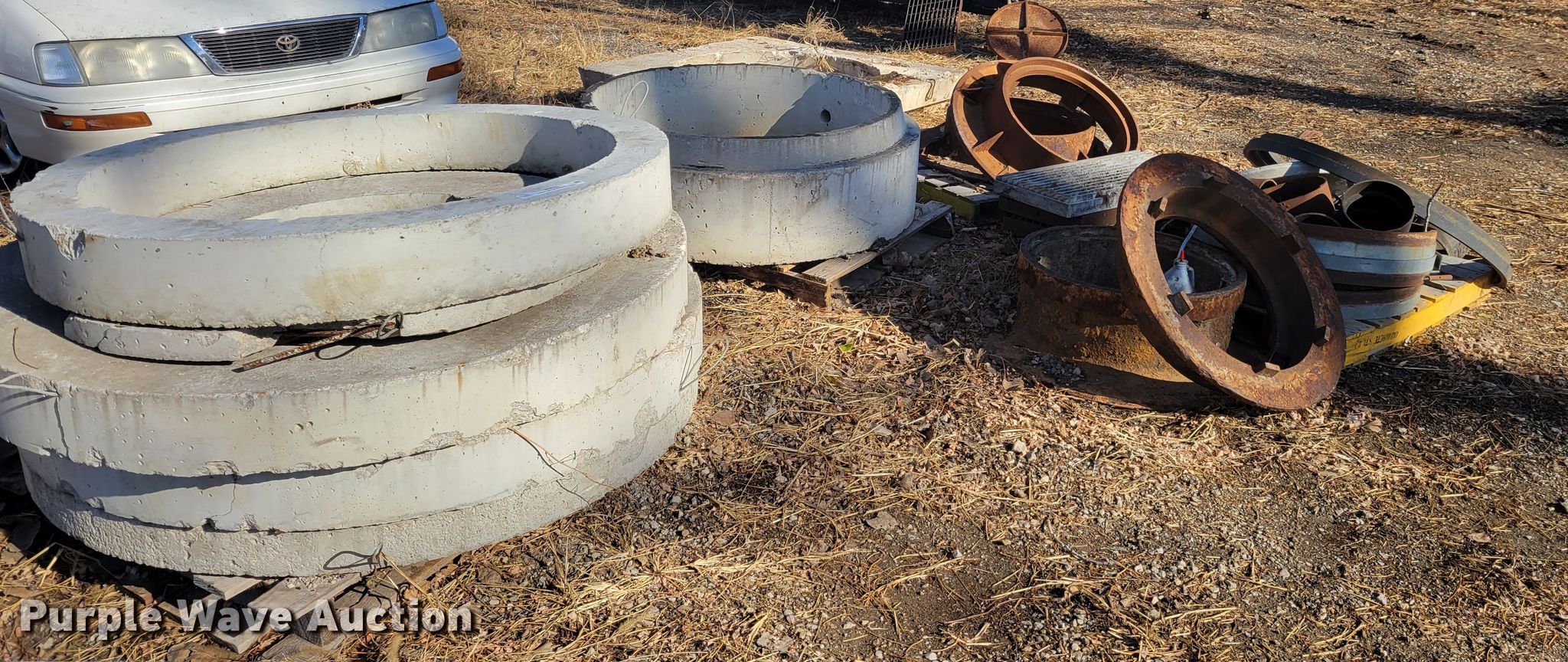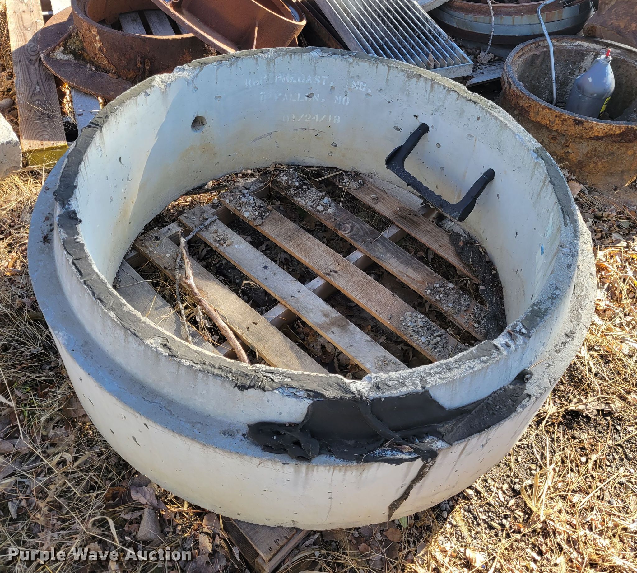 Purple Wave is selling a used Building Materials in Missouri. This item is a Sewer supplies with the following: Concrete man hole inserts, Metal man hole inserts, Metal grates
