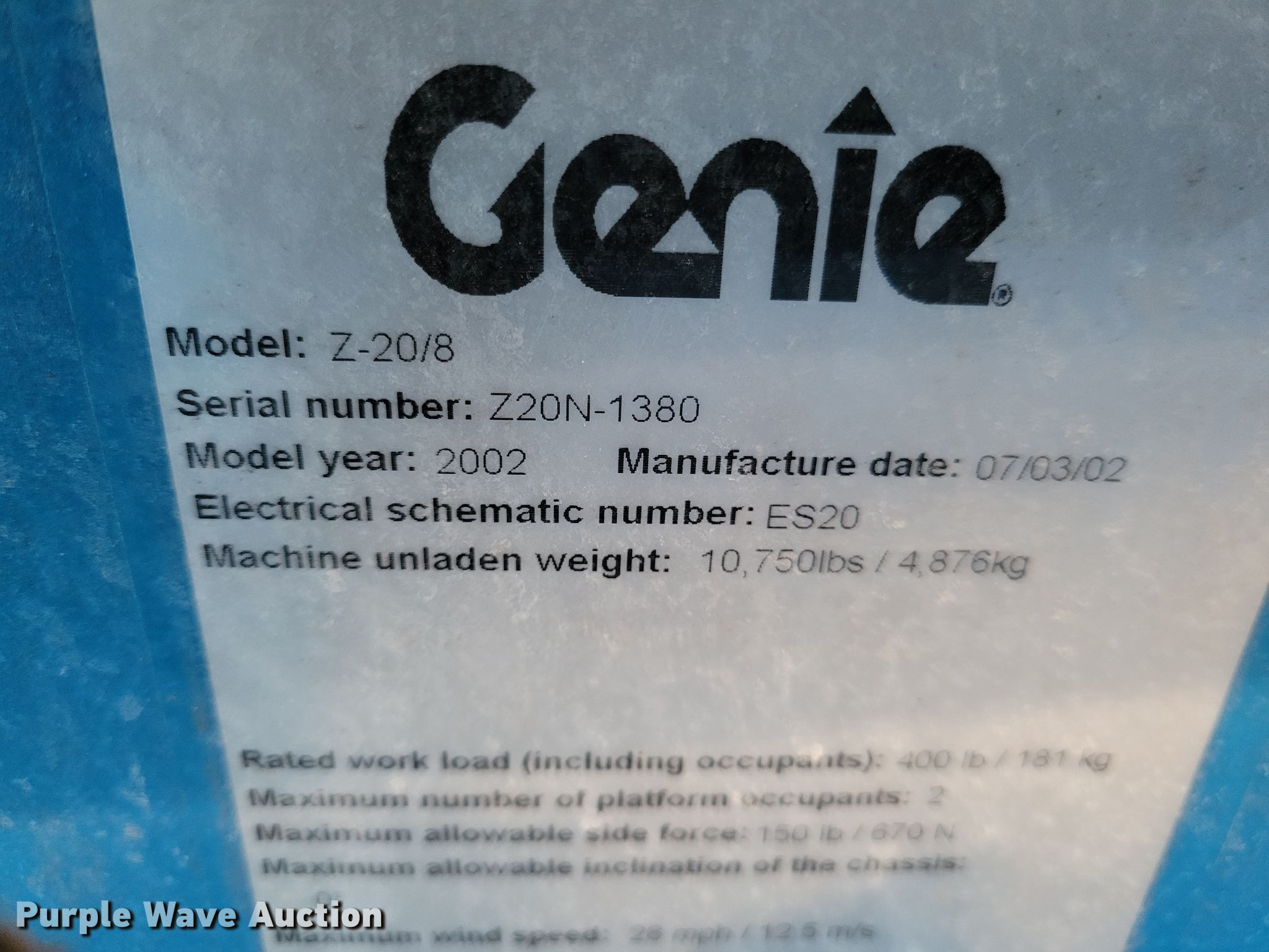 Purple Wave is selling a used Boom Lift in Illinois. This item is a 2002 Genie Z-20/8N boom lift with the following: Hours: 591 on meter, Serial: Z20N-1380