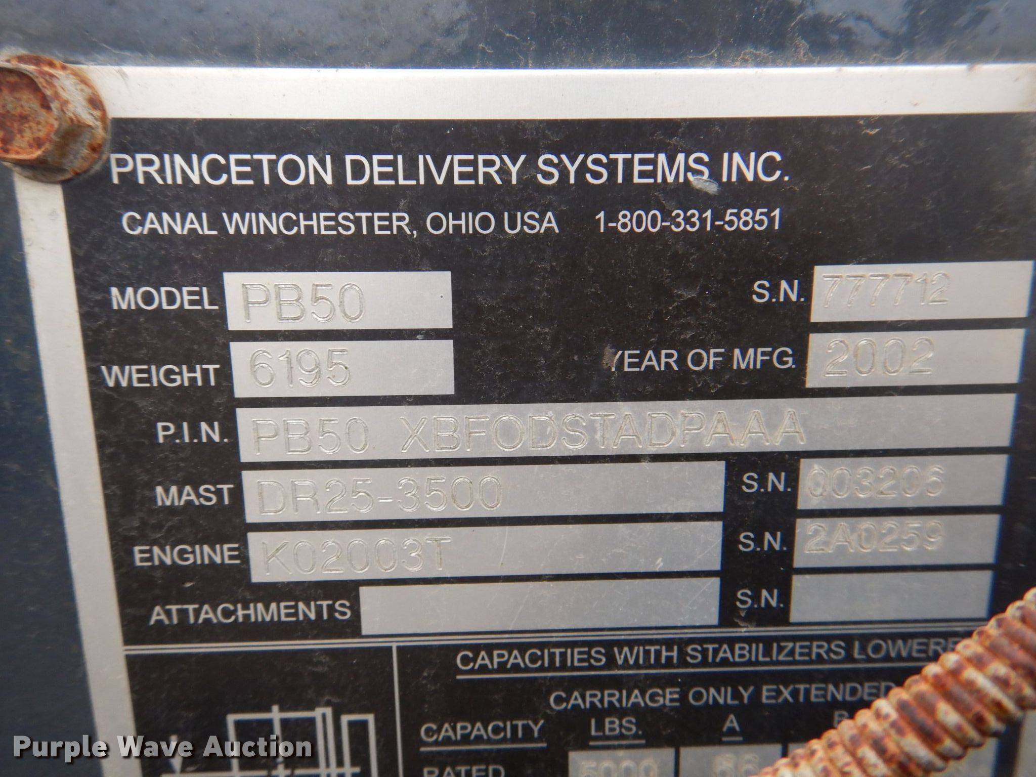 2002 Piggyback PB50 forklift. Hours: 993 on meter, Serial: 777712. Engine Model: K02003T, Serial: 2A0259, Cylinders: 4, Fuel type: Diesel. Transmission Hydrostatic. Operational Mast stages: 2, Side shift, Mast tilt, Fork length: 47". Tires Front: 31x15.50-15. Premier Contracting Inc.. 3940 S Ferree St. Kansas City, KS 66103