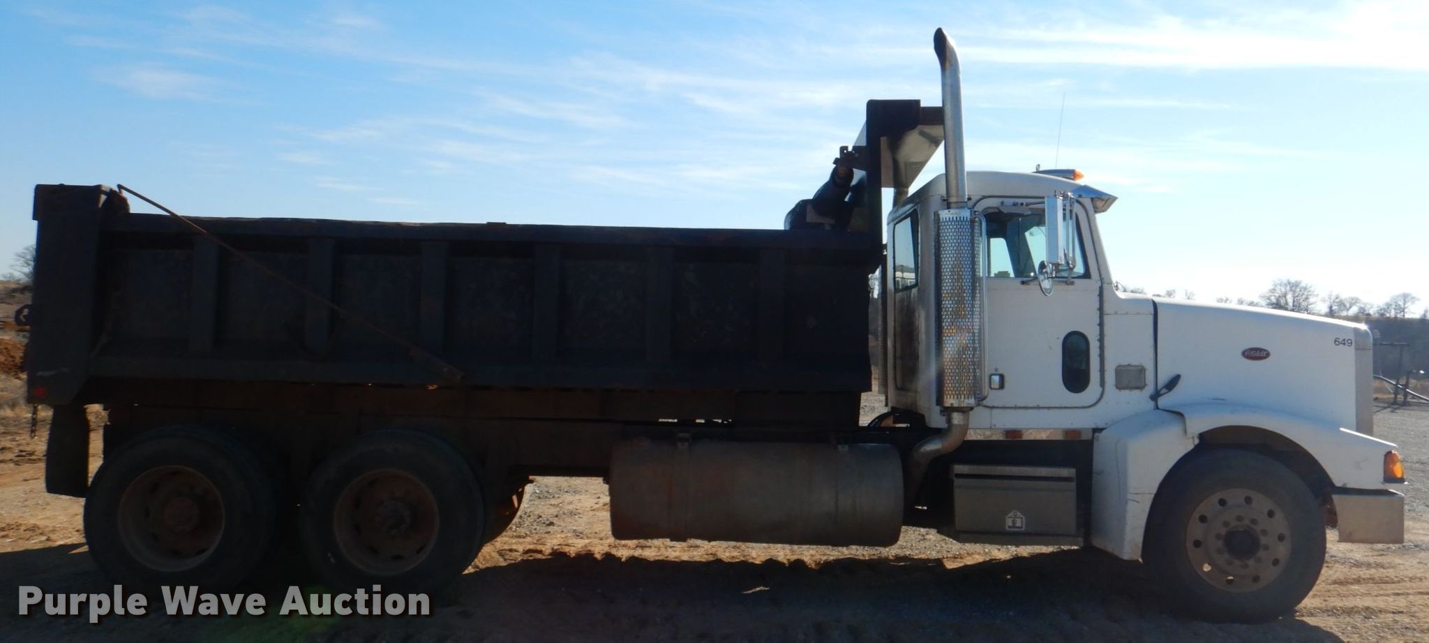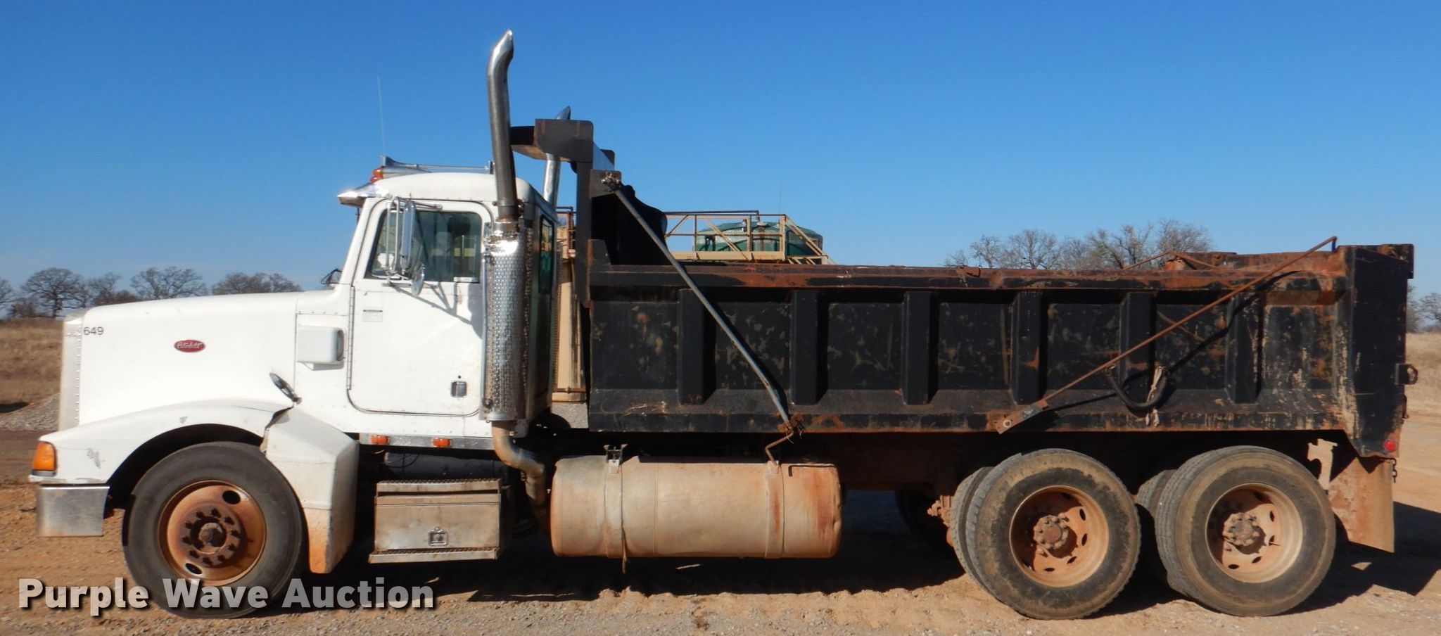 1991 Peterbilt 377 dump truck. Miles: 1,578,722 on odometer, VIN: 1XPCDR9X0MD306649. Engine Detroit Diesel Series 60, Displacement: 12.7L, Cylinders: 6, Fuel type: Diesel. Transmission Eaton Fuller, Manual, Speed: 15. Chassis Axles: Tandem, Differential lock: Inter-axle, Suspension: Air, Brakes: Air, PTO, GVWR: 50,000 lbs. Interior AC, Heat, Heated mirrors, Cruise control. Operational Dump bed 17' L x 8' W, Side height: 40", Bed type: Steel, Roll tarp, Ram: Single , End gate: Air operated. Tires Size: 11R24.5. Notes Windshield chipped or cracked. Oklahoma title. C&J Oilfield Services. 118 4th St. Fox, OK 73435