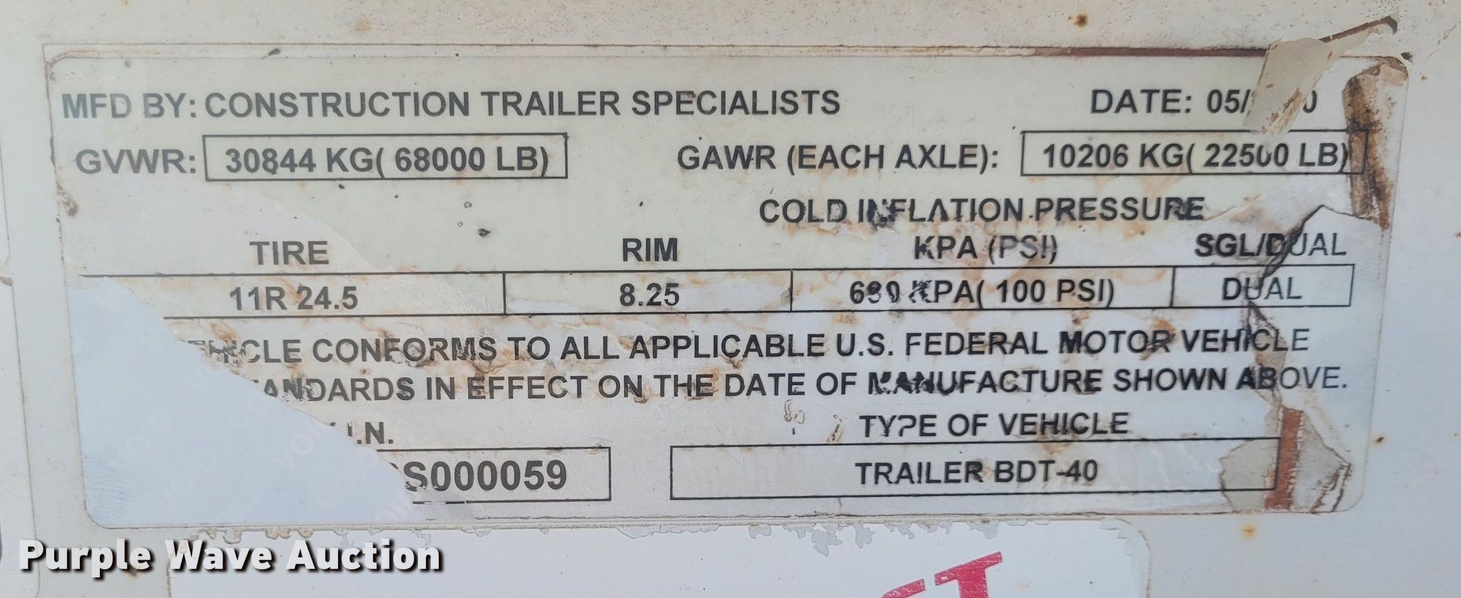 2011 CTS bottom dump trailer. VIN: 5TU114026BS000059. Dimensions Overall: 40' L x 96" W. Operational Body type: Steel, Clamshell gate: Air operated, Roll tarp. Chassis Suspension: Air, Brakes: Air, Axles: Tandem. Tires Steel wheels, Size: 11R24.5. Oklahoma title. Houston Electric, Inc. - Open inspection Jan 21. Garber, OK 73738