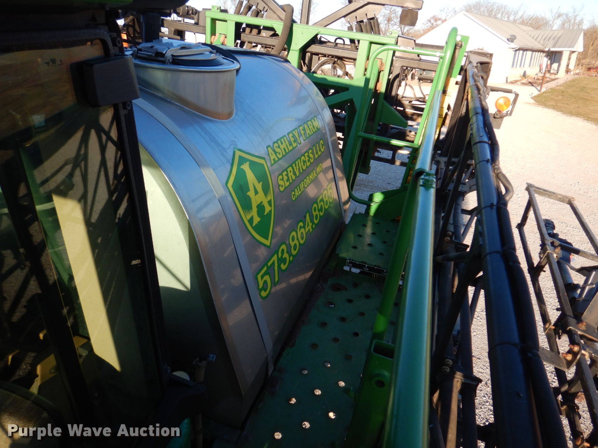 2010 John Deere 4730 sprayer. Engine hours: 4,241 on meter, Spray hours: 1,081 on meter, Serial: N04730X008852. Engine John Deere 6068HN053, Serial: PE6068L103862, Cylinders: 6, Fuel type: Diesel. Transmission Hydrostatic, Four wheel drive. Chassis Hydraulic axle width adjust. Operators station AC, Heat. Operational Hydraulic ladder, Solution tank Capacity: 800 gallons, Type: Stainless Steel, Chemical eductor, Foam marker, Rinse tank, Clean water tank, Boom Width: 100', Sections: 7, Boom breakaway, Hydraulic boom fold, Hydraulic height control, Automatic height control, Nozzle Spacing: 15", Make: Teejet, Nozzle bodies: 5-way, Electronics GPS monitor John Deere, GPS receiver John Deere StarFire 3000, Spray controls, Auto steer. Tires Size: 420/80R46, Row crop tires. Notes Possible automatic height control issues. Ashley Farm Services. California, MO 65018