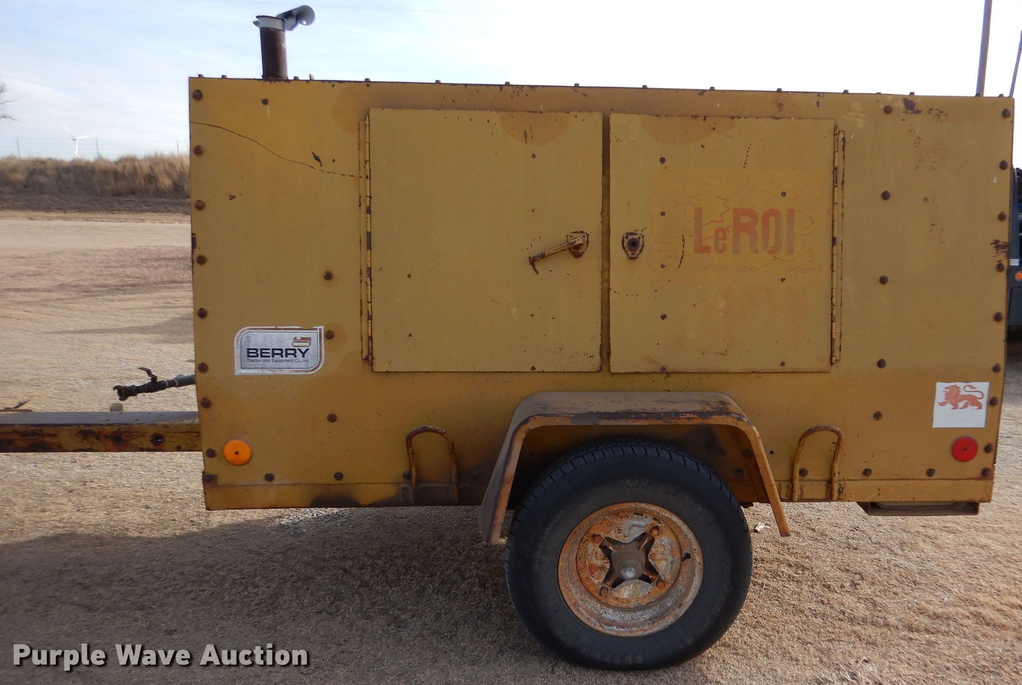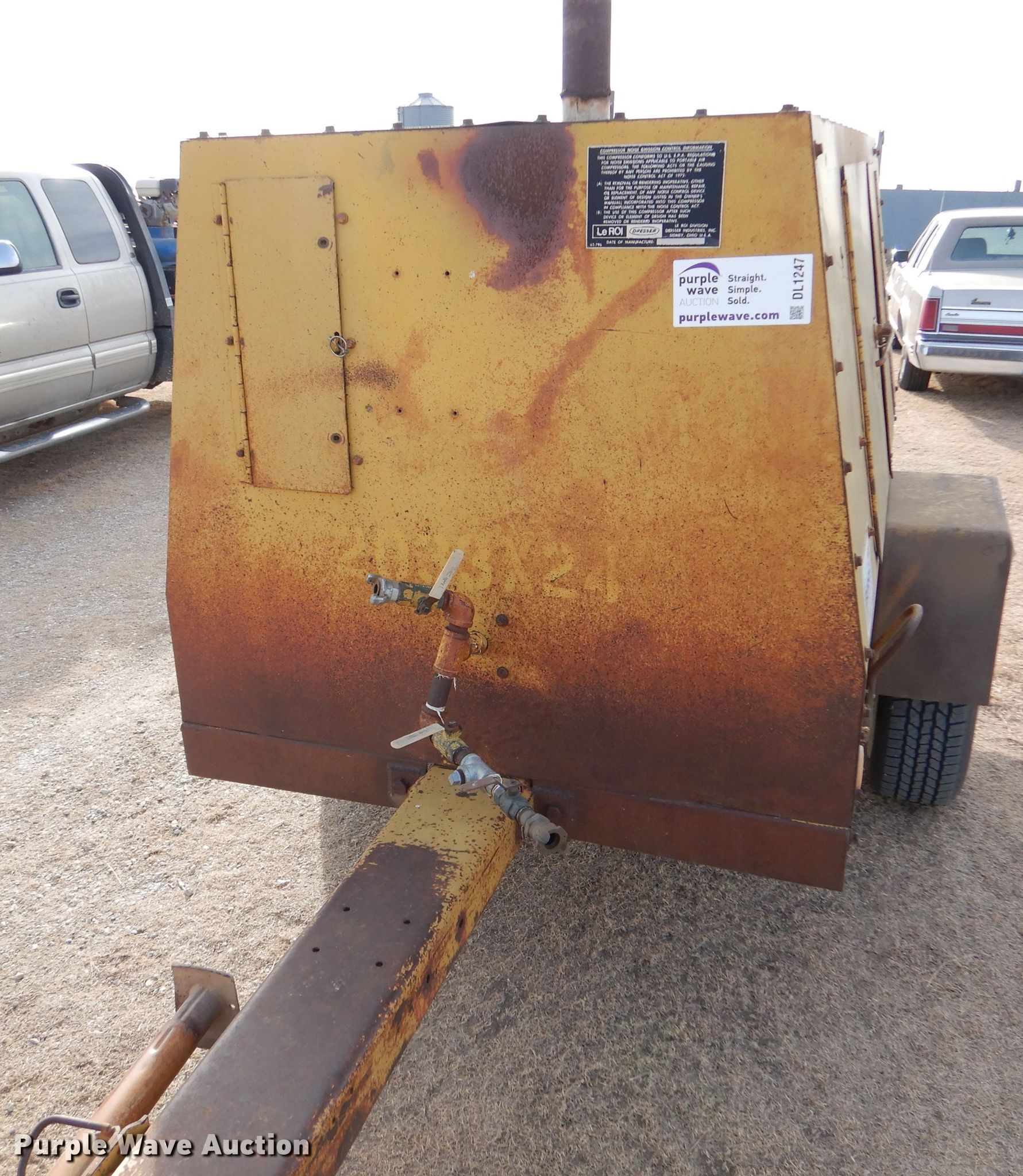 Leroi Q160RGEH air compressor. Hours: Unknown, Serial: 2033X24. Engine International Harvester C196 AU69557, Serial: 59060, Cylinders: 4, Fuel type: Gas. Operational Air compressor LeRoi, PSI: 150, Trailer mounted. Trailer Overall: 12'9" L x 74" W, Suspension: Spring, Axles: Single, Tire size: 235/75R15. Notes Hour meter missing. This is worksite support equipment and will not come with a title. Transfer of ownership documentation will be a bill of sale. Bryan Habiger Estate. Ingalls, KS 67853