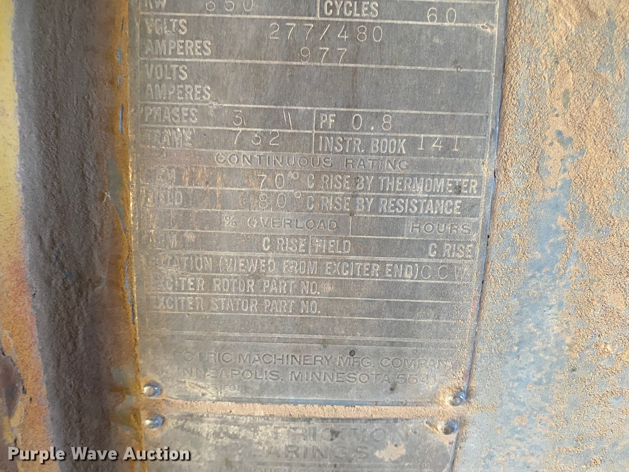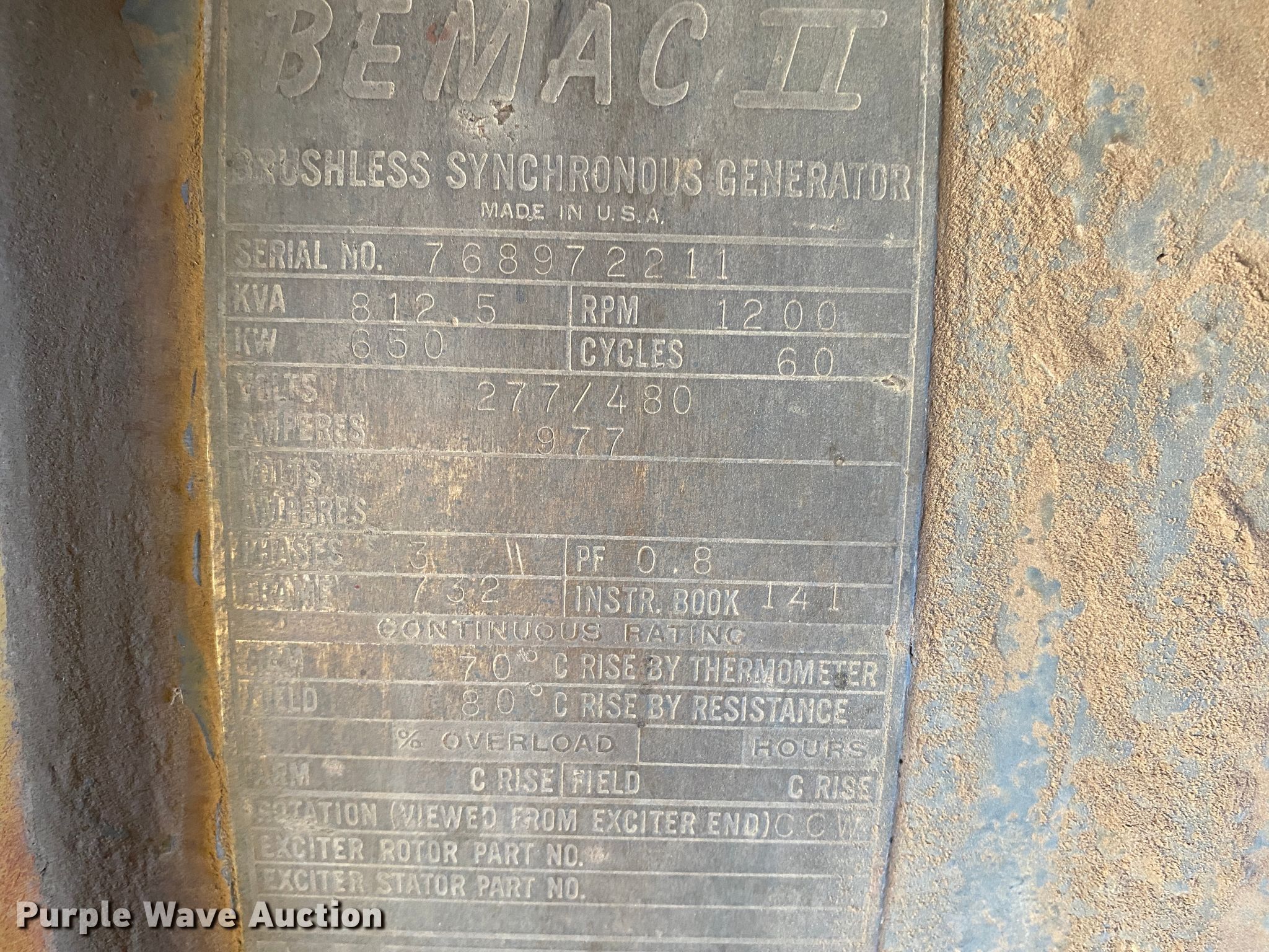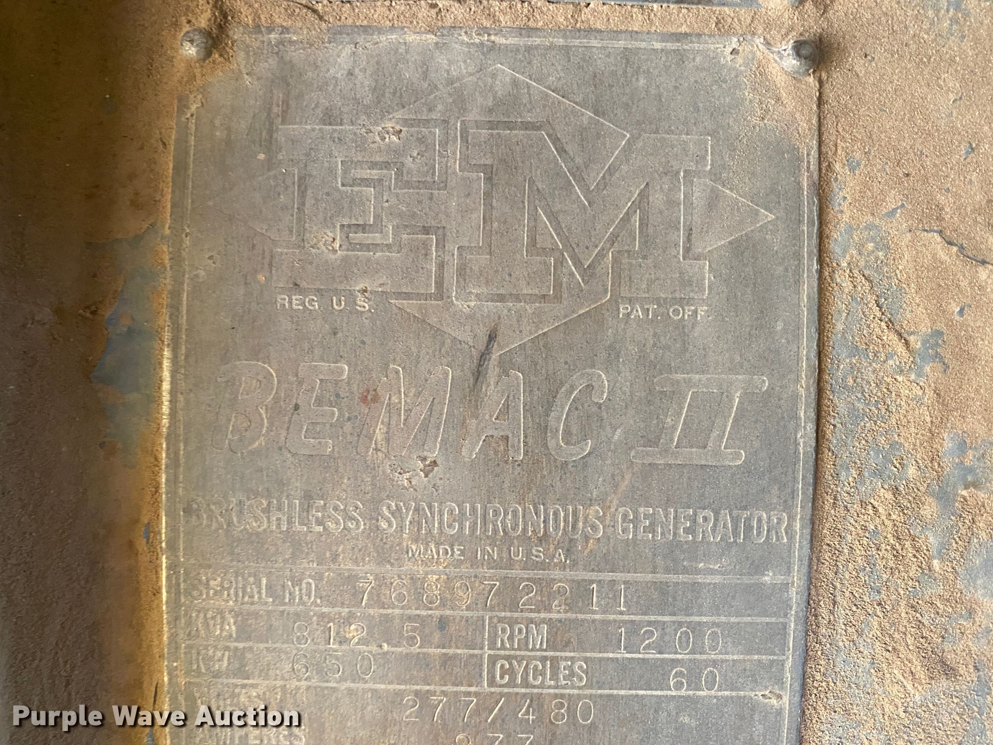 EM Bemac 2 generator. Hours: Unknown, Serial: 768972211. Operational Generator EM Bemac 2, kVA: 812.5, kW: 650, Phase: Three, Skid mounted, Fits Caterpillar D399 engine. Flatland Farms LLC. 3890 Rd F. Hooker, OK 73945