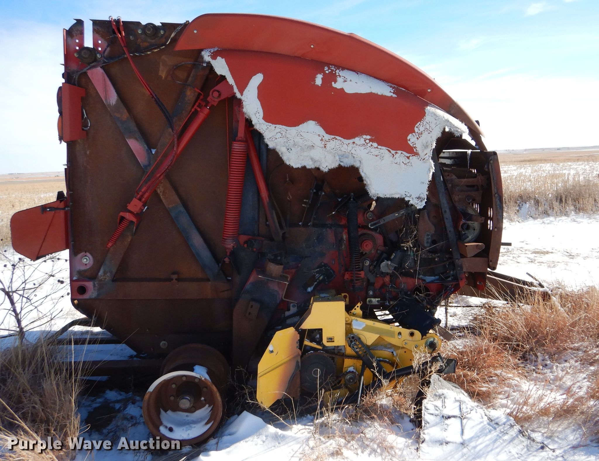2014 New Holland RB560 round baler. Operational. Gauge wheels, Pickup width: 90", Bale size: 5'x6', Bale ramp. Notes Gauge wheel missing, Fire damage, Non-operational unit. Insurance salvage unit. Liebenthal, KS 67553