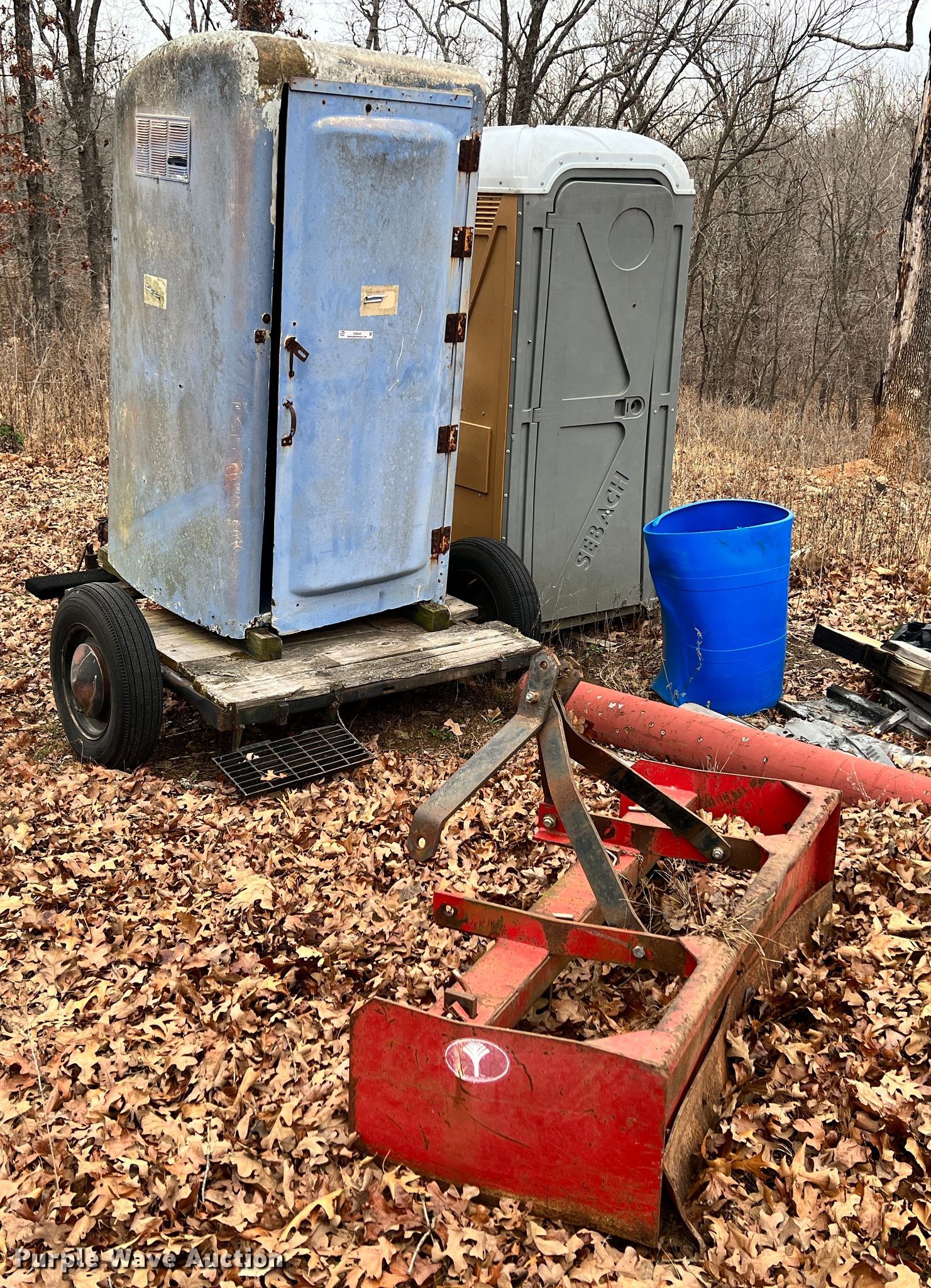 5' W box blade. Hitch: Three point , (4) scarifier blades, Bent frame. Trailer mounted portable restroom Dimensions: 5' x 58" , Hitch: 2" Ball , Tires: 6.70-15. Portable restroom Paper towel dispenser. Outreach For America. 40082 CR 591 RD. Jay, OK 74346