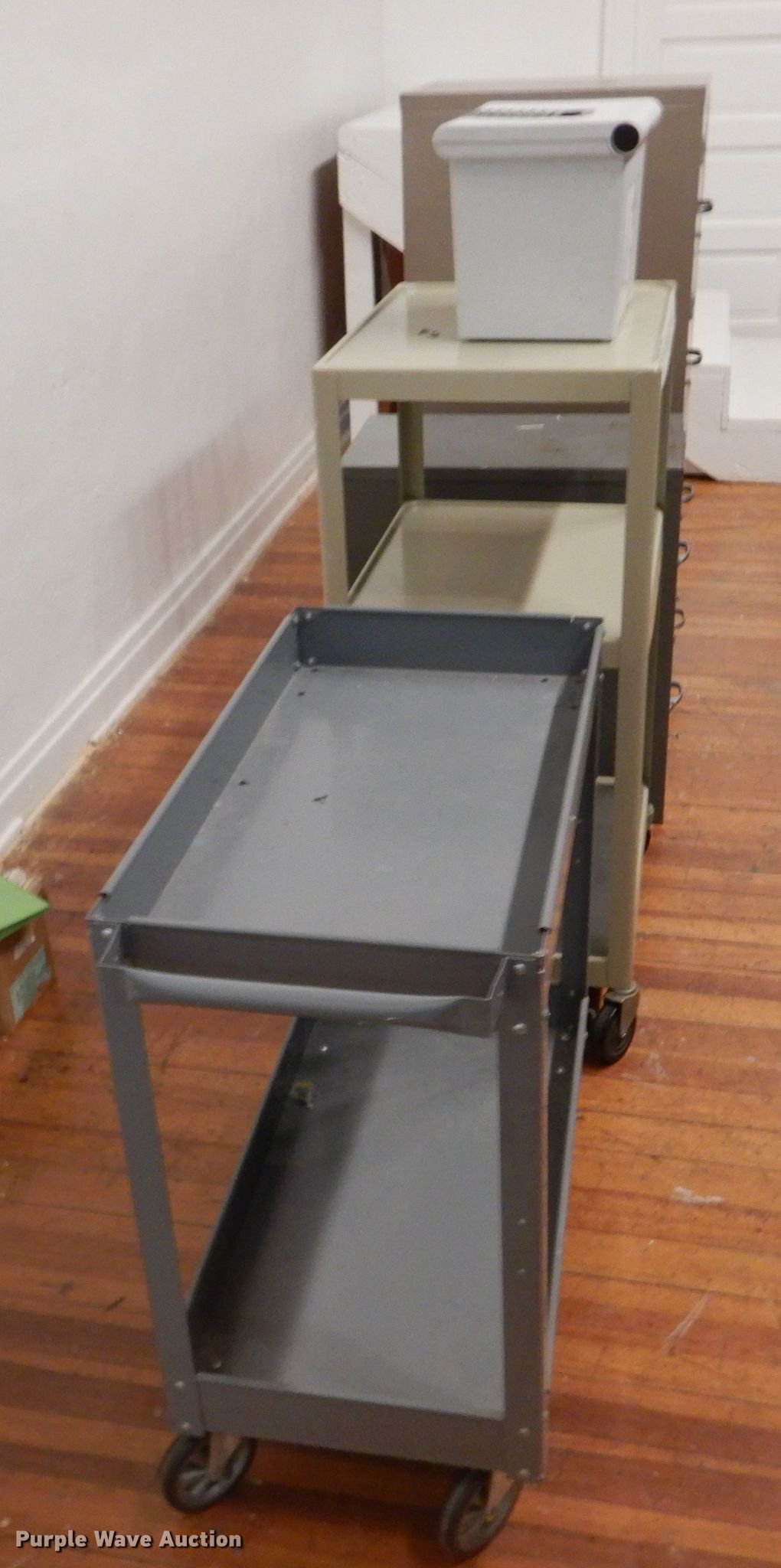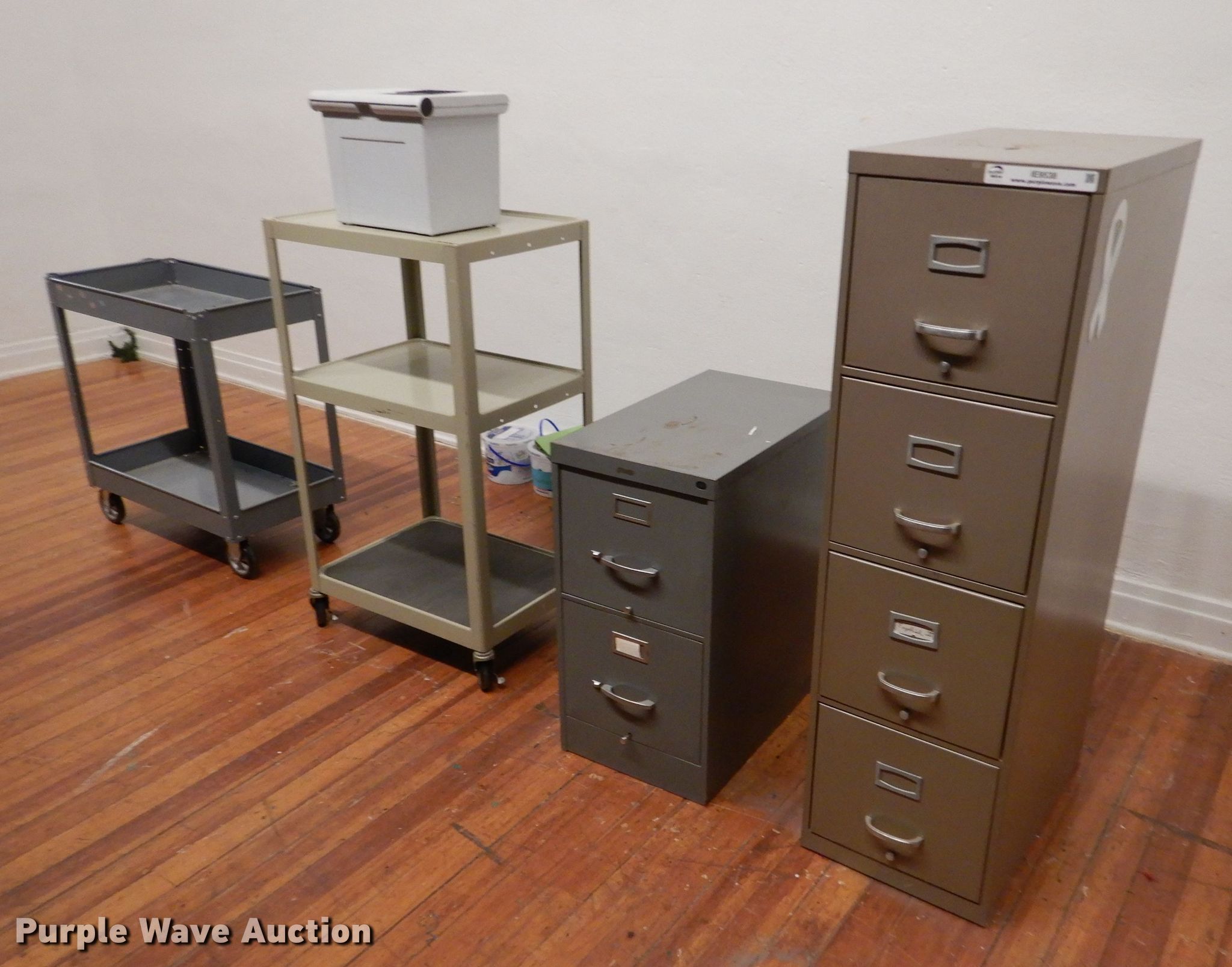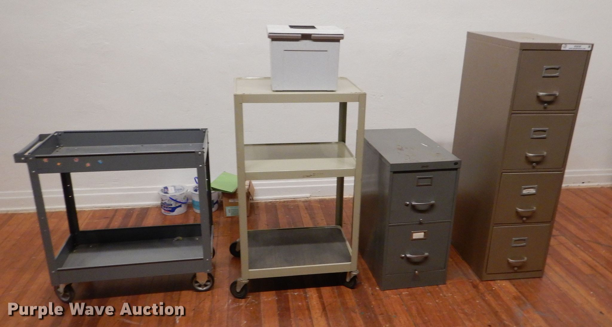 Purple Wave is selling a used Office Supplies and Equip. in Kansas. This item is a Office supplies with the following: (2) file cabinets, (2) carts, Storage box