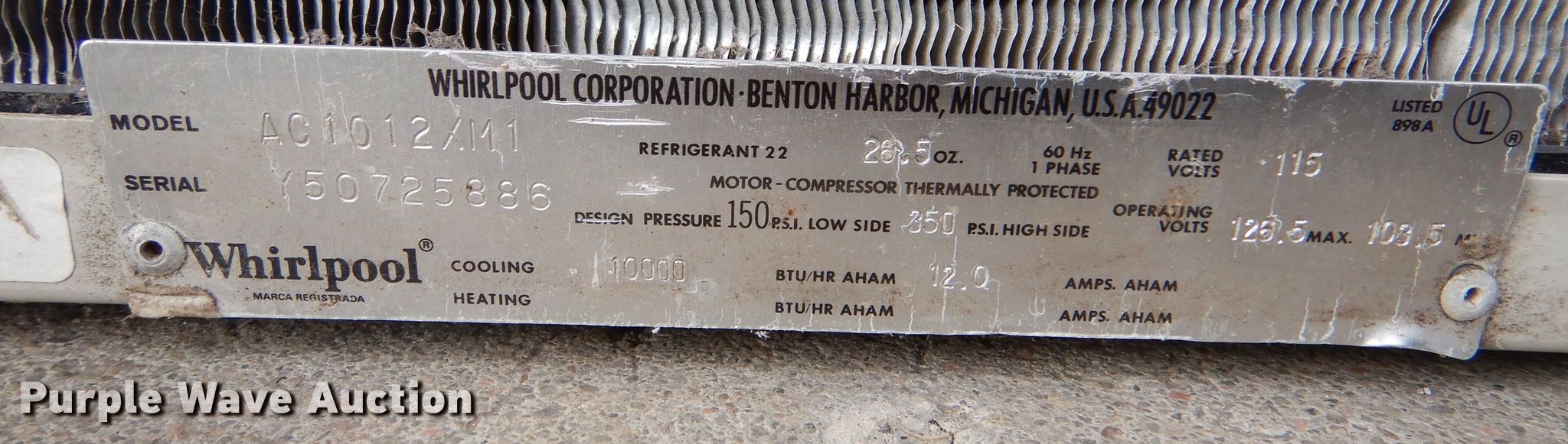 Purple Wave is selling a used Appliances in Kansas. This item is a (2) AC units with the following: Comfort-Aire R-243A, 230/208V, Single phase, R-22 refrigerant, Serial: QE1400047, Whirlpool AC1012XM1, 115V, Single phase, R-22 refrigerant, Serial: Y50725886