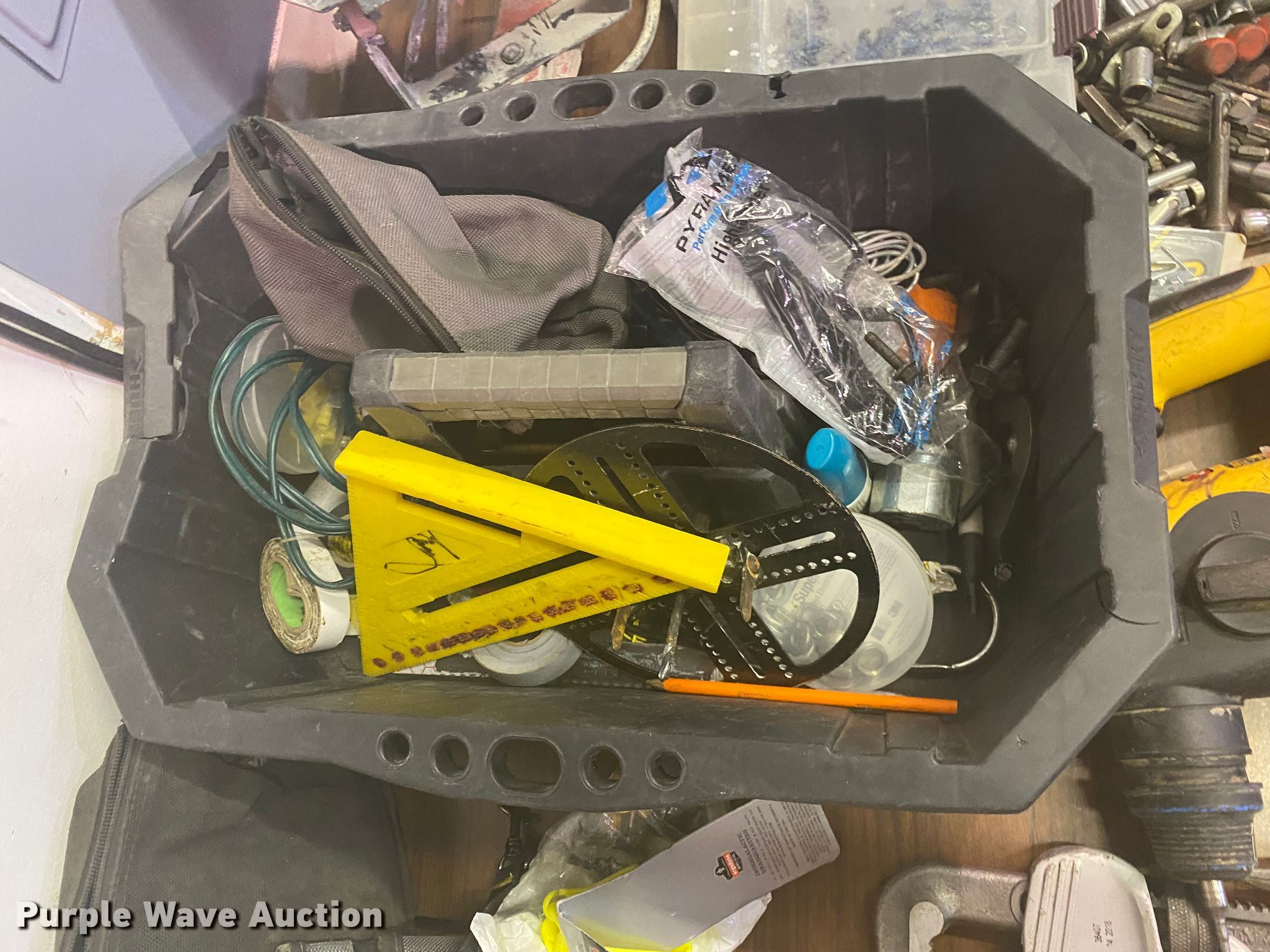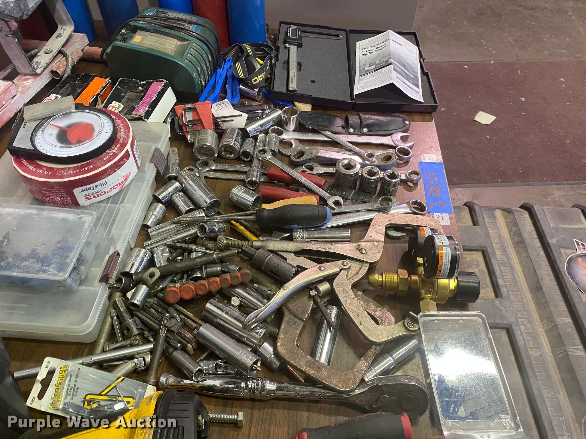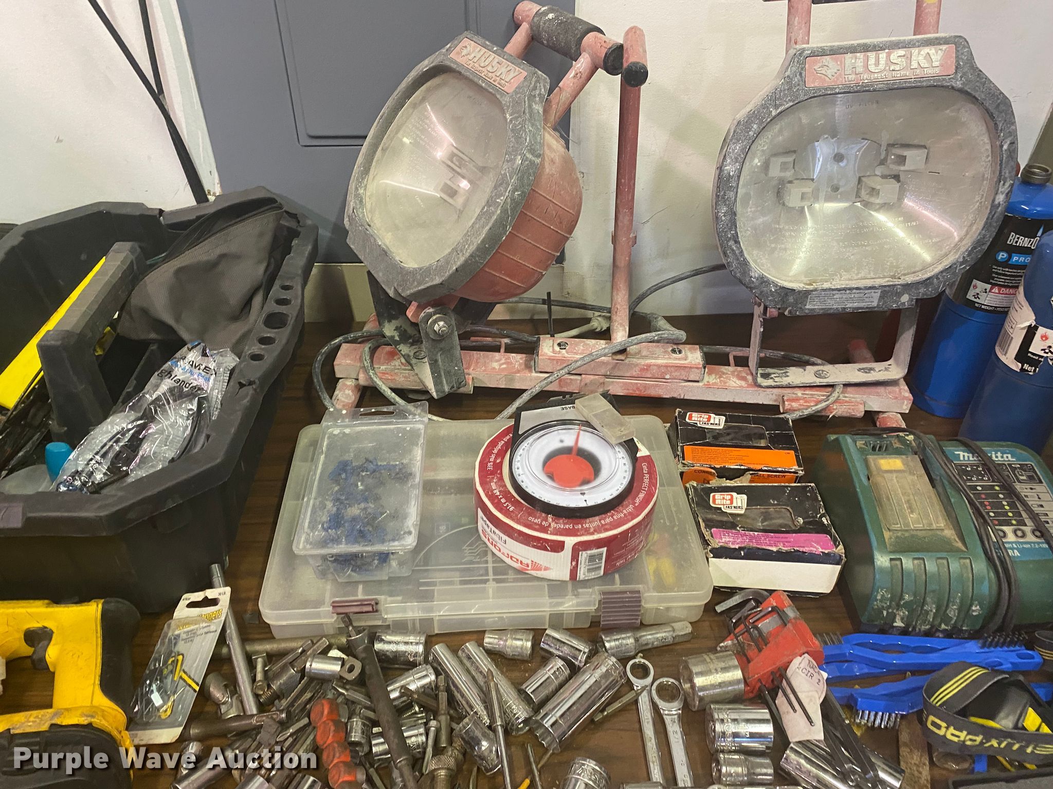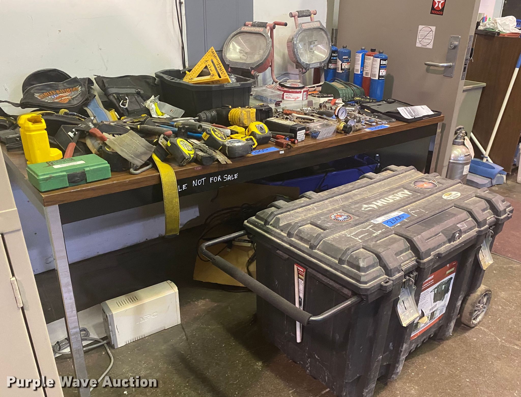 Purple Wave is selling a used Tools in Oklahoma. This item is a Tools with the following: Husky toolbox, Husky lights, DeWalt, Milwaukee, Digital caliper, Harris 601 gauge and more, Unit# 2000