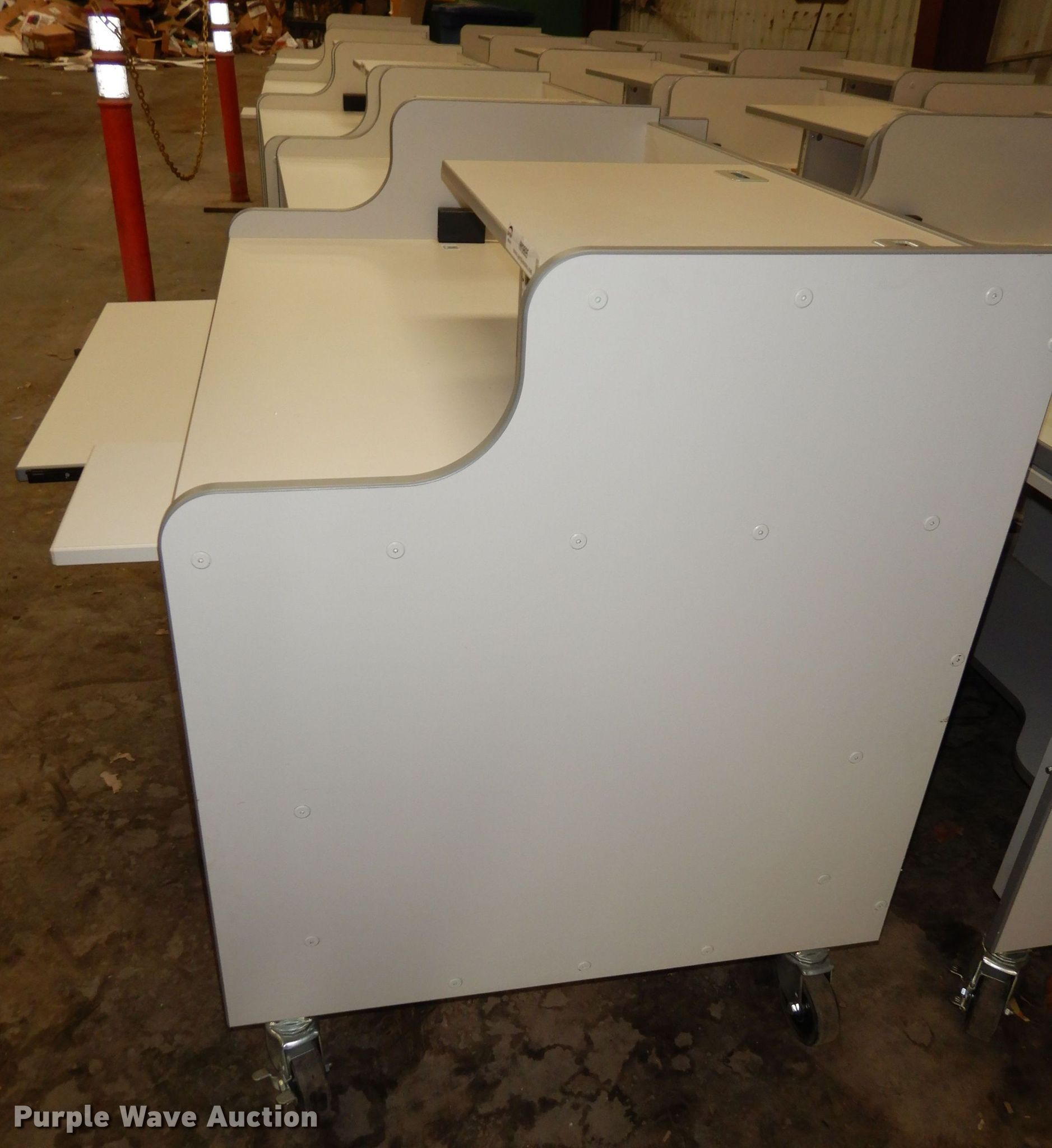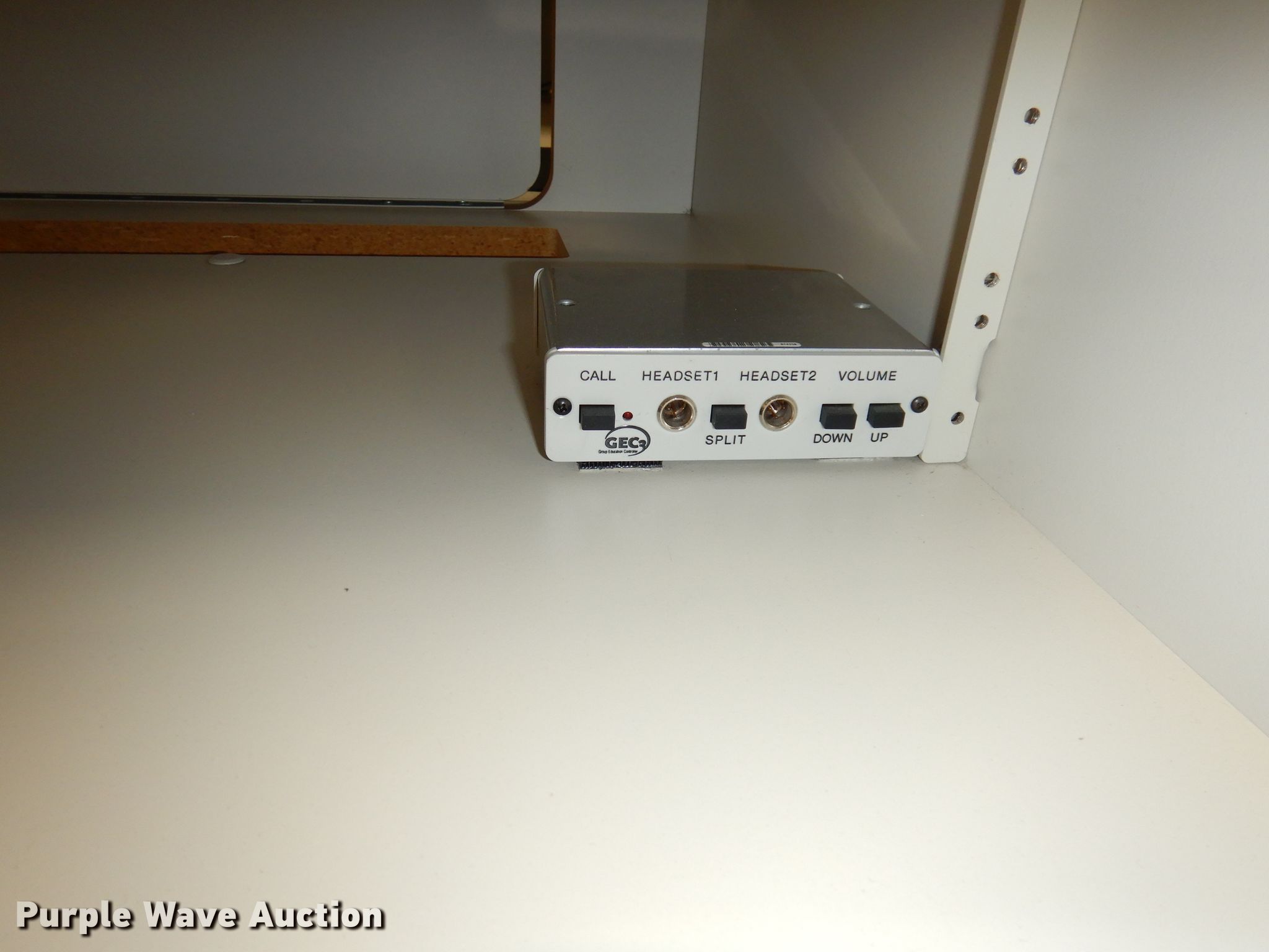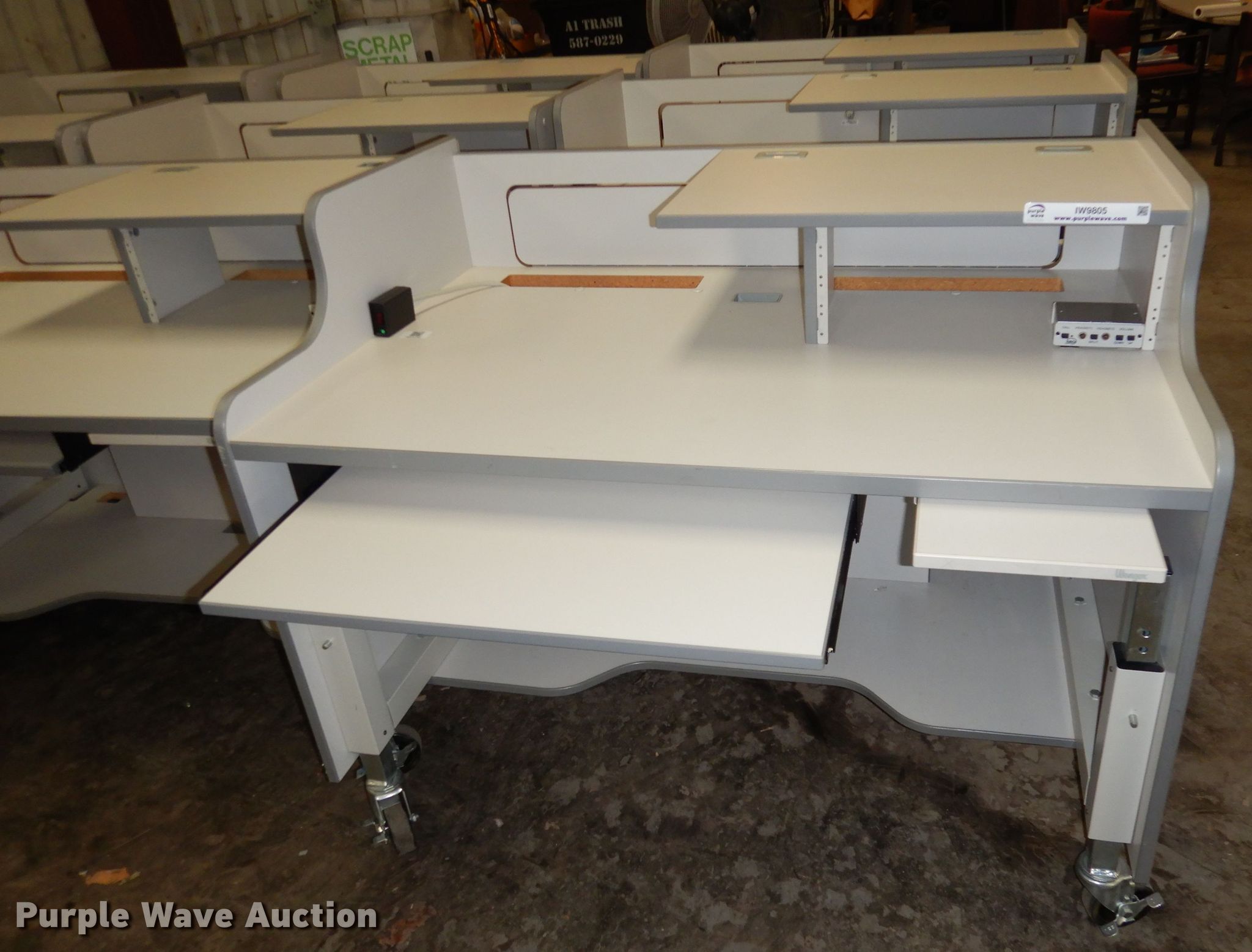 Purple Wave is selling a used Furniture in Kansas. This item is a (3) Wenger computer tables with the following: 49.5"W x 32.25"D x 40.25"H, Headset connections, Pull-out shelves, Adjustable height, Power supply