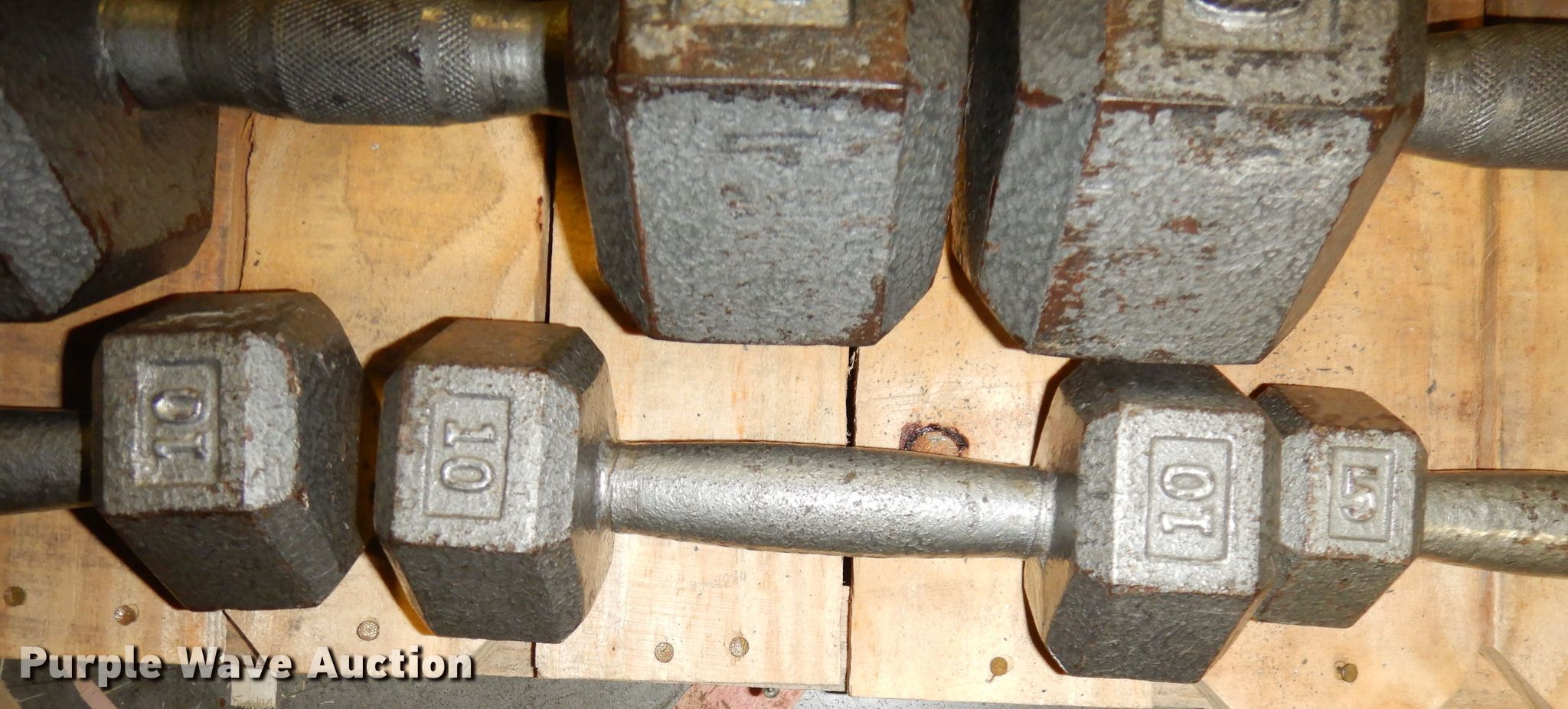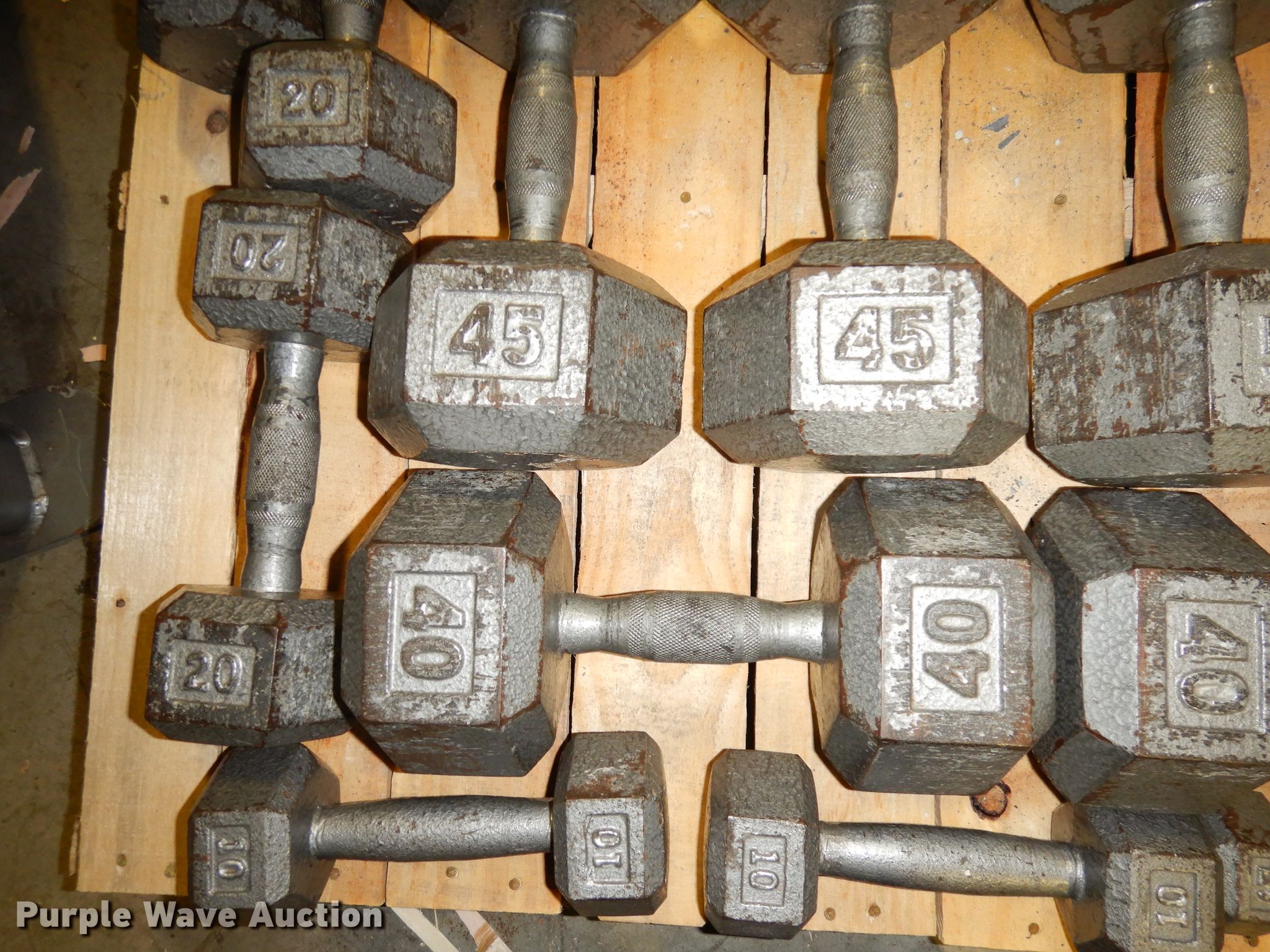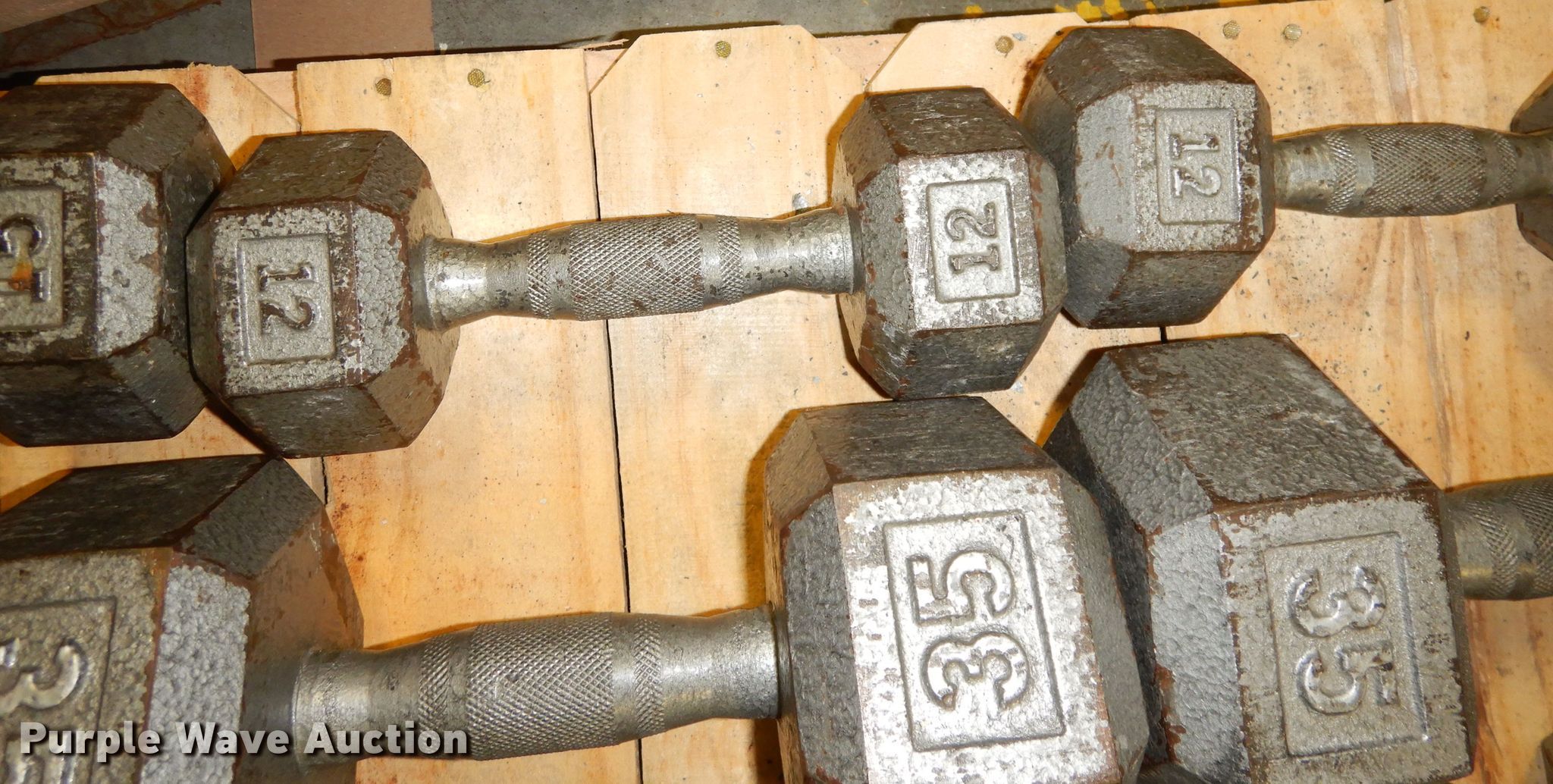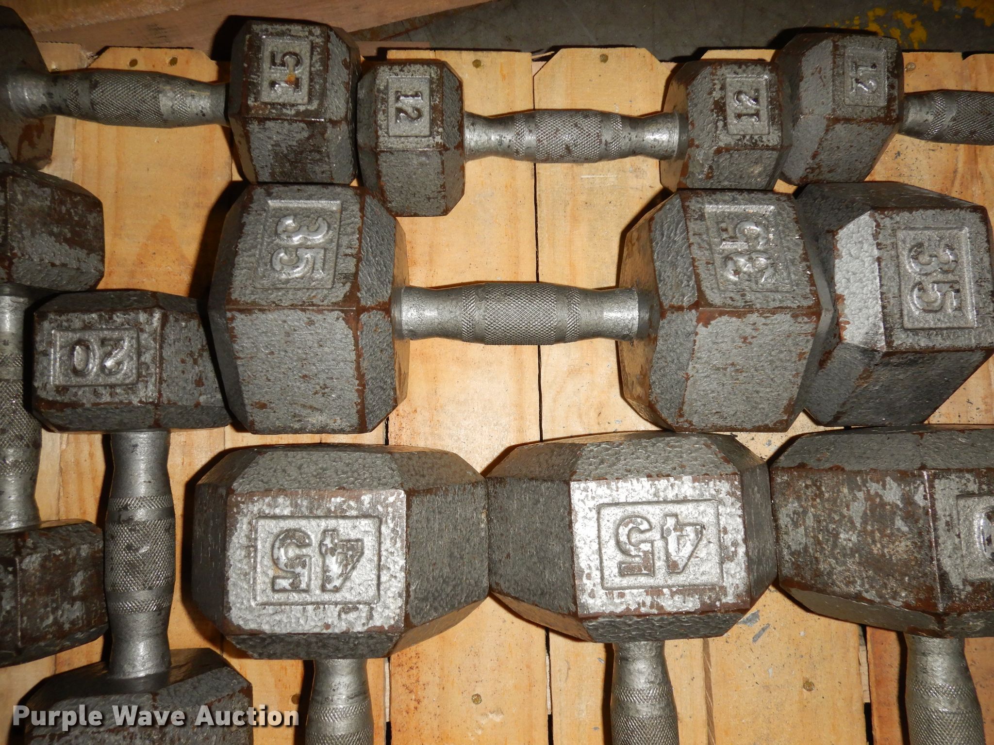 Purple Wave is selling a used Sporting Goods in Kansas. This item is a (22) dumbbells with the following: (2) 5 lbs, (2) 10 lbs, (2) 12 lbs, (2) 15 lbs, (2) 20 lbs, (2) 25 lbs, (2) 30 lbs, (2) 35 lbs, (2) 40 lbs, (2) 45 lbs, (2) 50 lbs, Dumbbell rack
