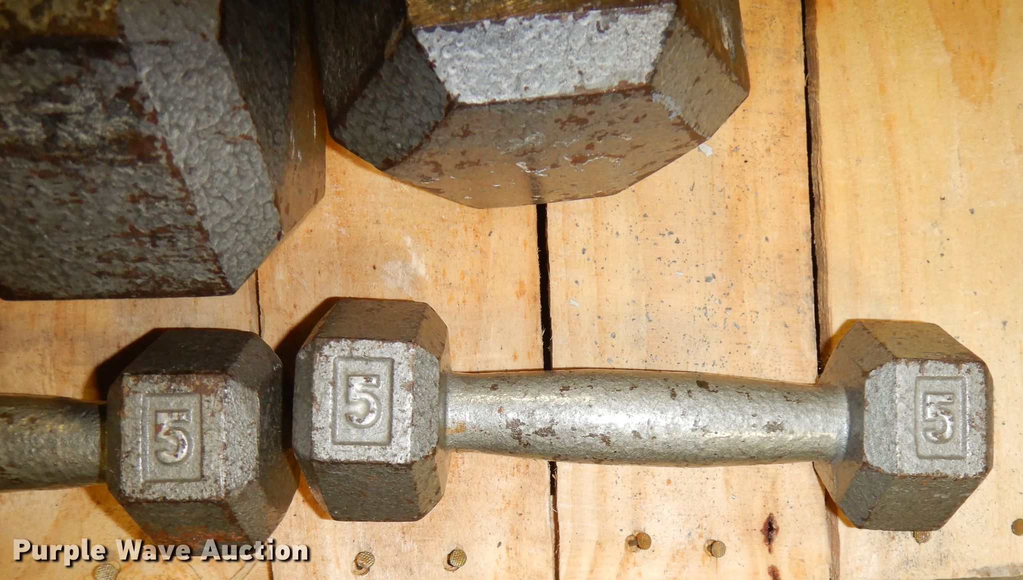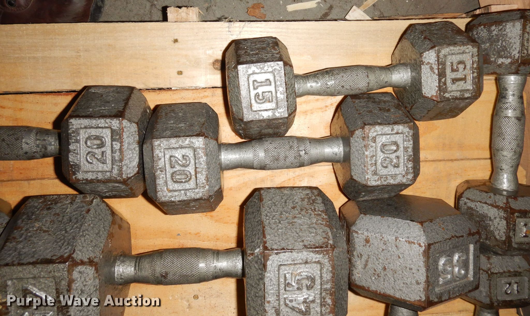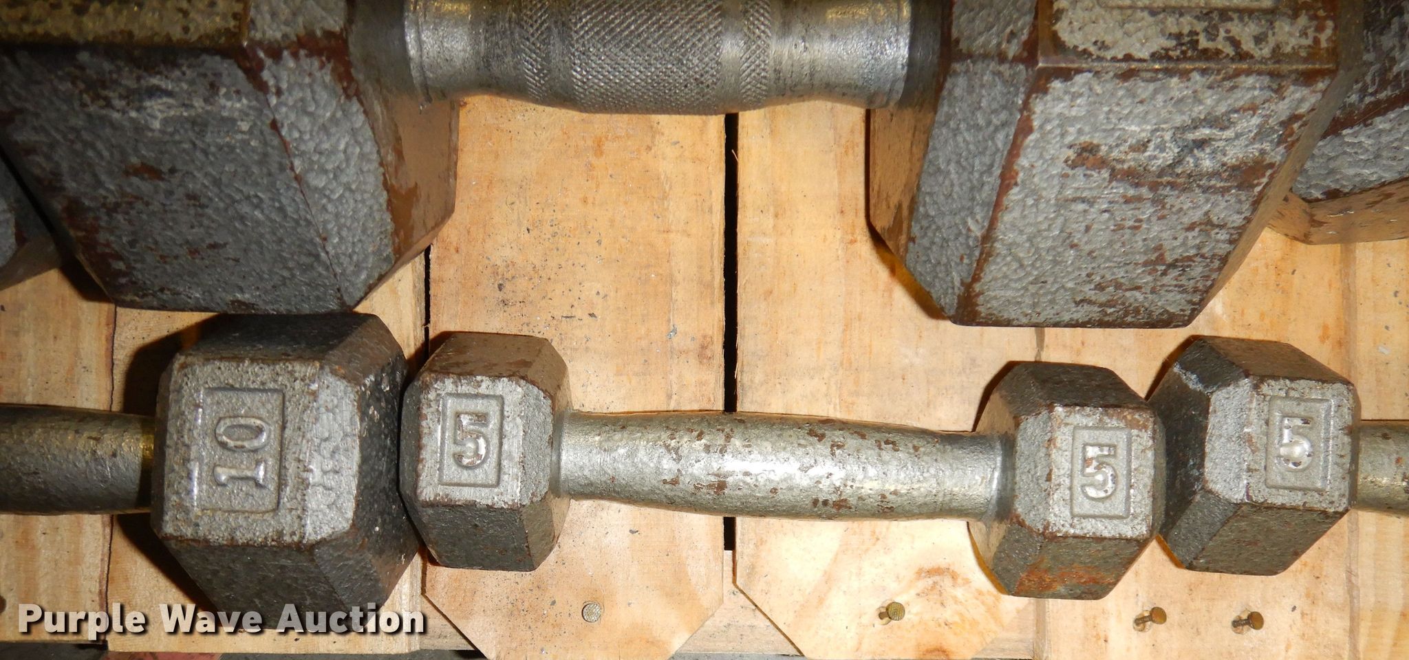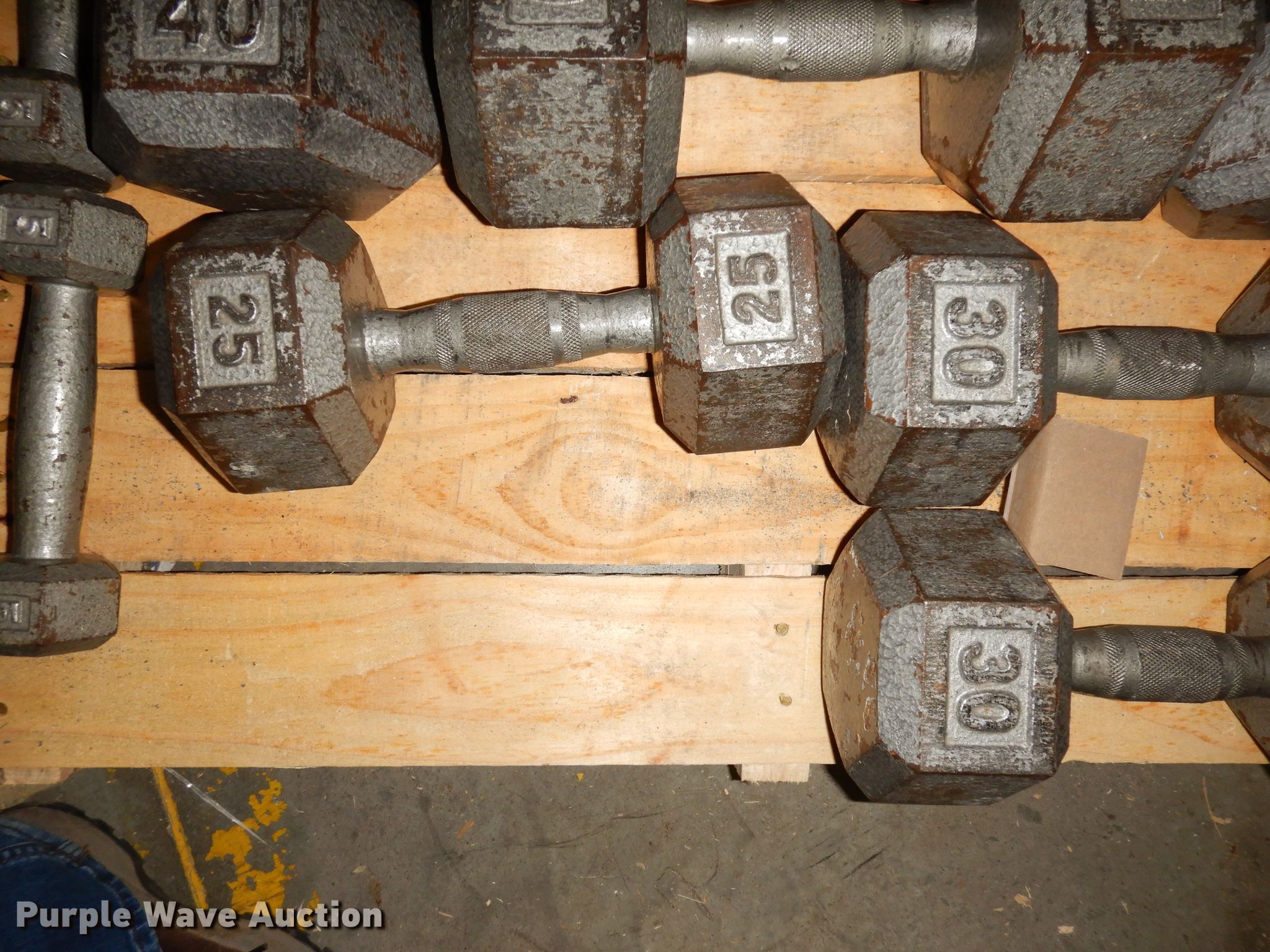 Purple Wave is selling a used Sporting Goods in Kansas. This item is a (22) dumbbells with the following: (2) 5 lbs, (2) 10 lbs, (2) 12 lbs, (2) 15 lbs, (2) 20 lbs, (2) 25 lbs, (2) 30 lbs, (2) 35 lbs, (2) 40 lbs, (2) 45 lbs, (2) 50 lbs, Dumbbell rack
