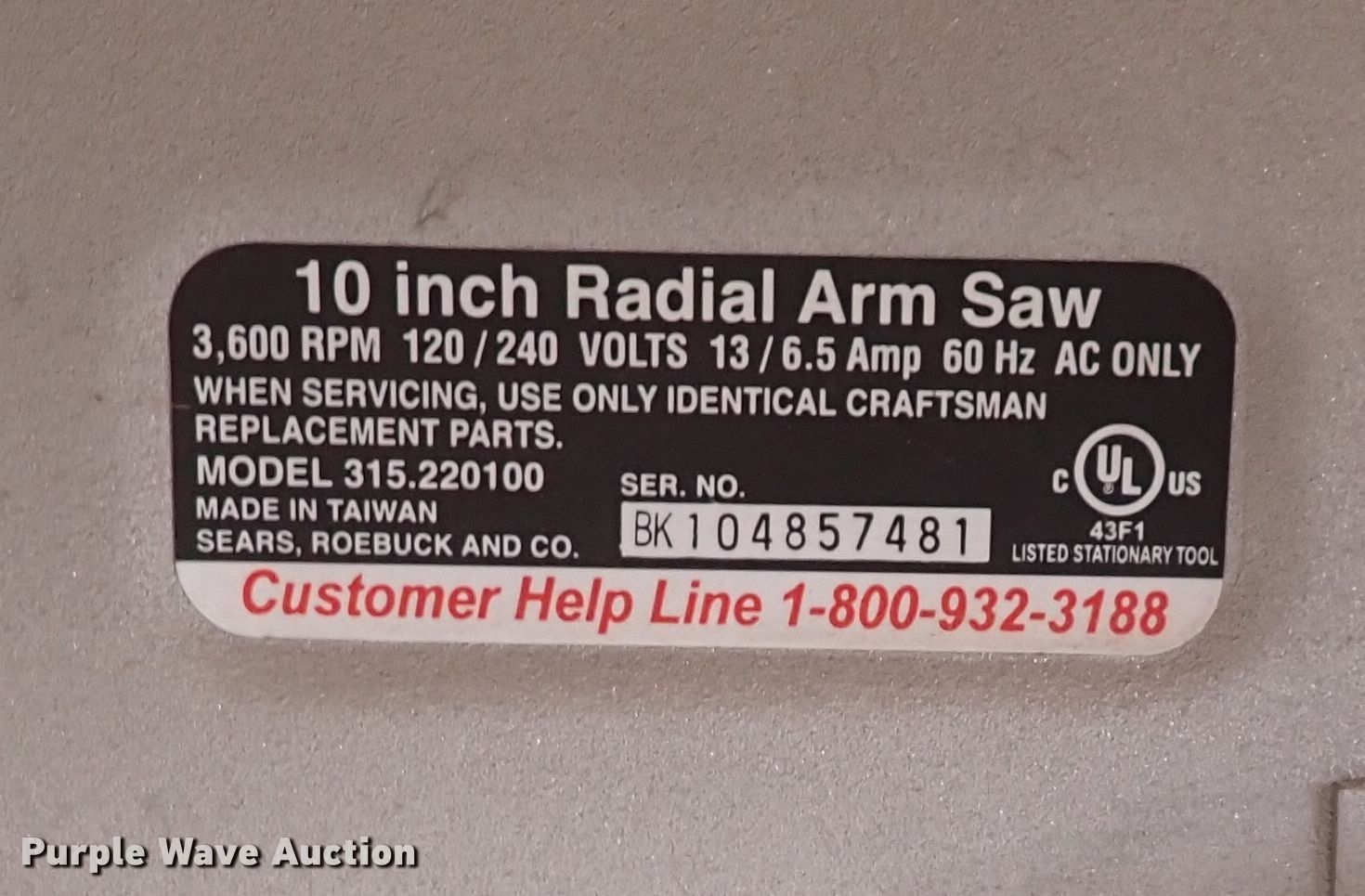 Purple Wave is selling a used Tools in Kansas. This item is a Craftsman radial arm saw with the following: 10" blade diameter, 120/240V